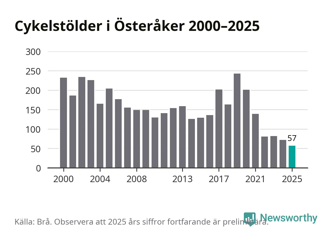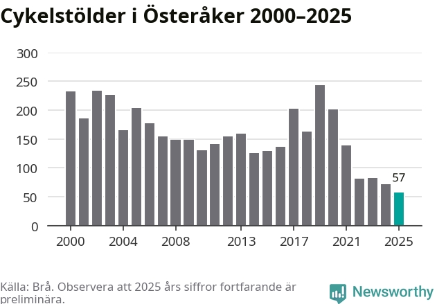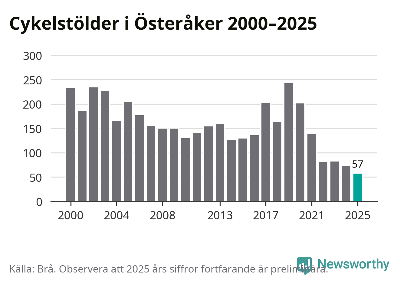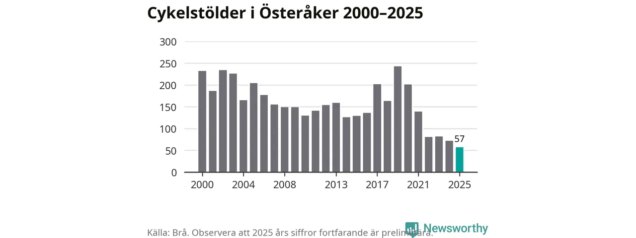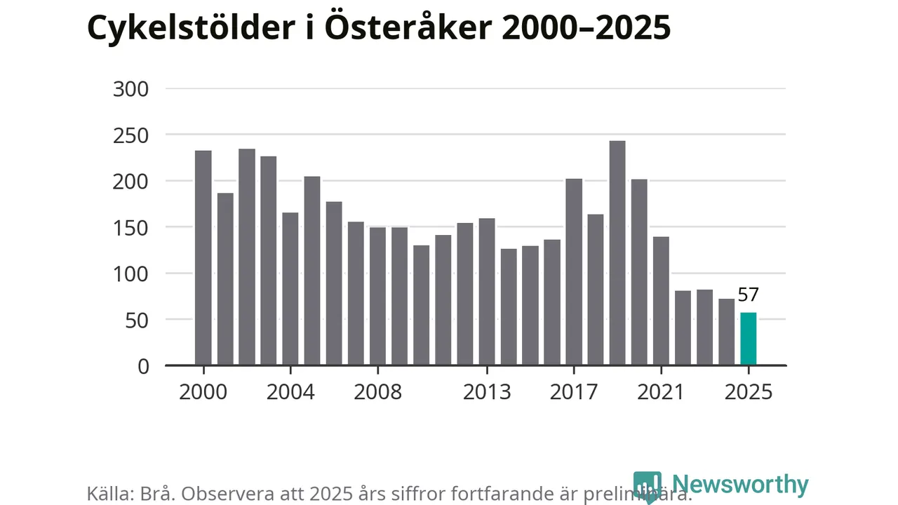 I Österåkers kommun noterades det lägsta antalet cykelstölder under hela 2000-talet år 2025, även om det fortfarande är preliminära siffror. Under de senaste 25 åren har det som mest anmälts 243 cykelstölder på ett år (2019).