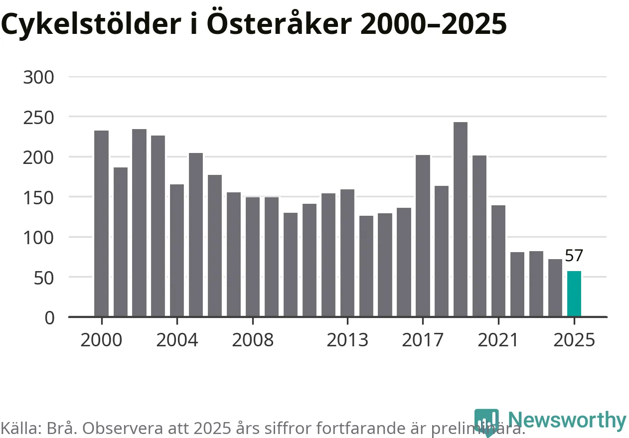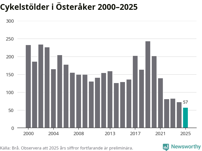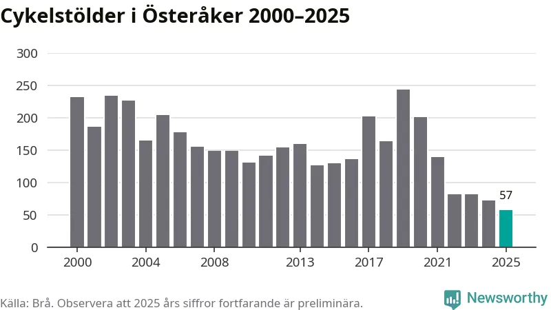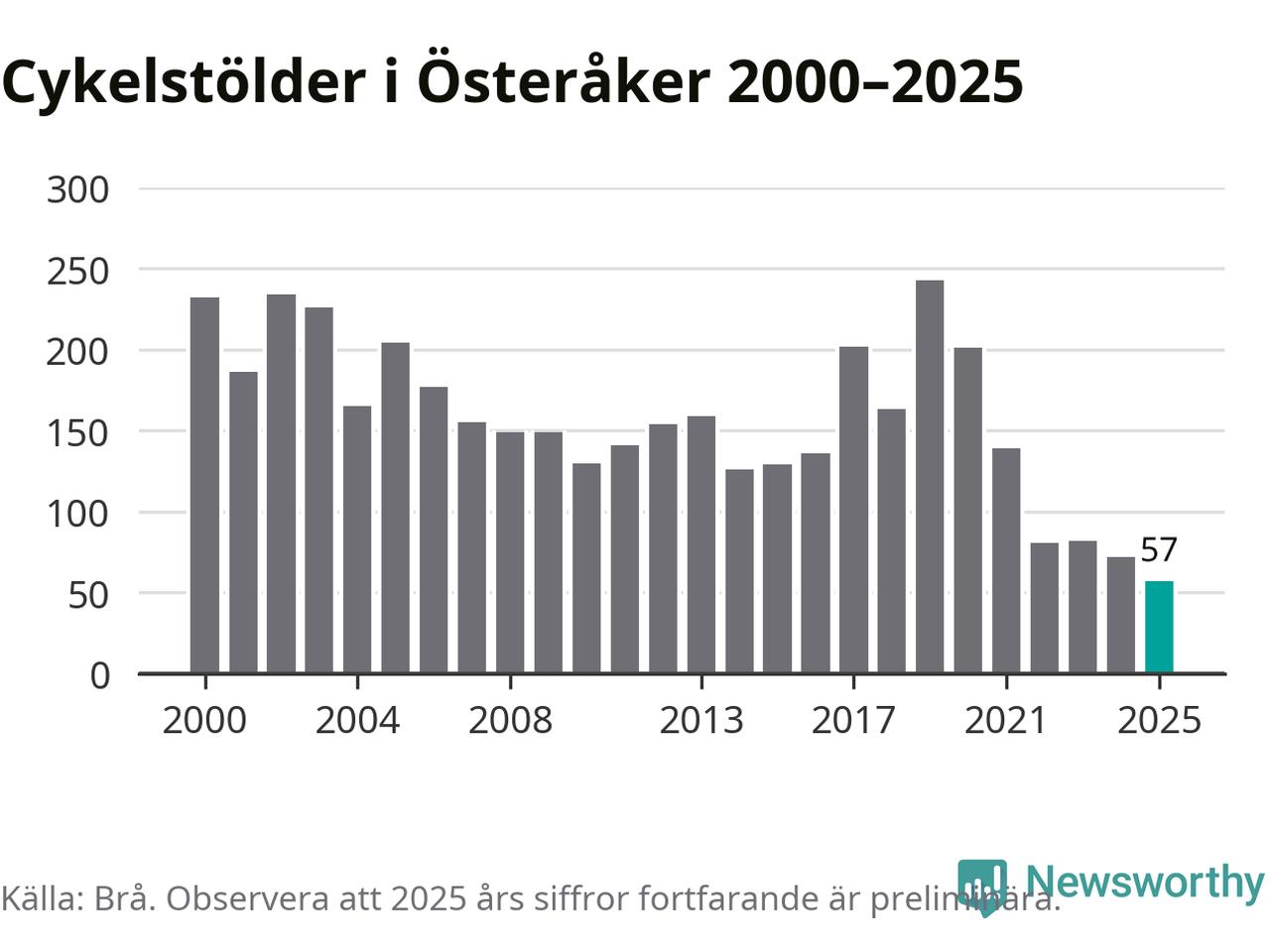 I Österåkers kommun noterades det lägsta antalet cykelstölder under hela 2000-talet år 2025, även om det fortfarande är preliminära siffror. Under de senaste 25 åren har det som mest anmälts 243 cykelstölder på ett år (2019).