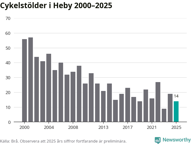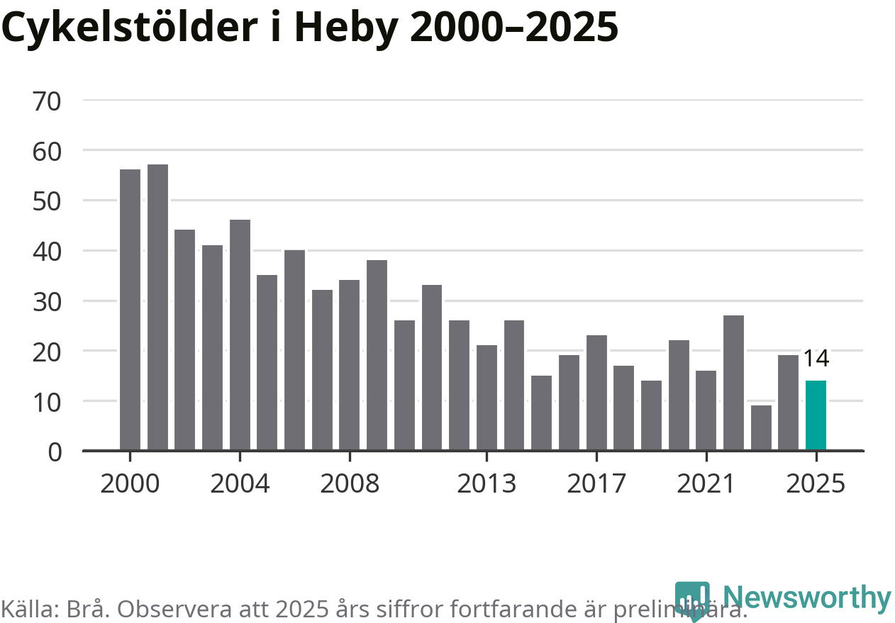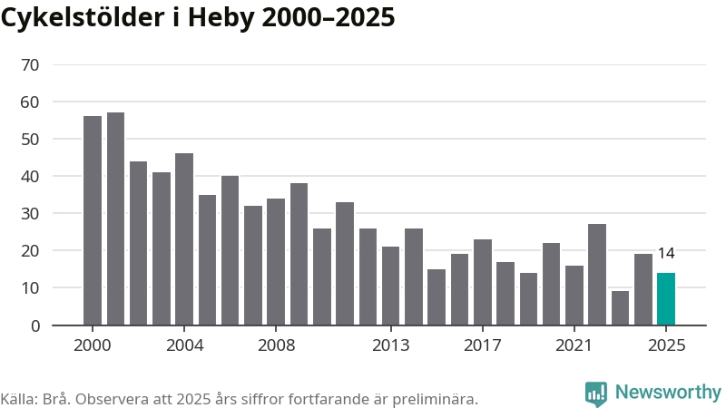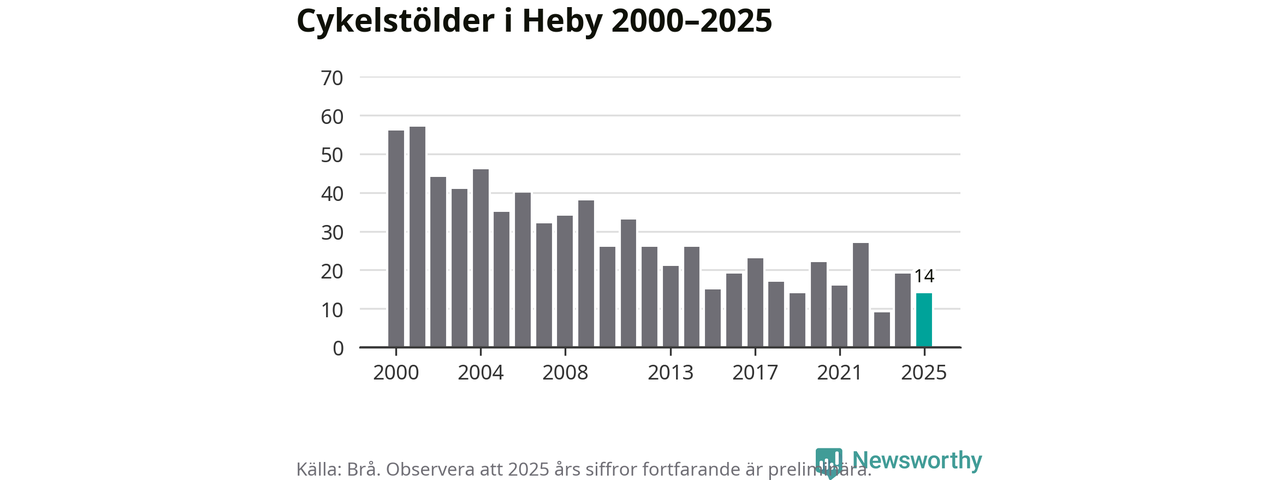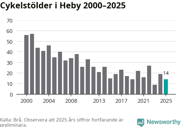 I Heby kommun var antalet cykelstölder relativt få i en historisk kontext år 2025, även om det fortfarande är preliminära siffror. Under de senaste 25 åren har det som mest anmälts 57 cykelstölder på ett år (2001), som minst 9 stycken (2023).
