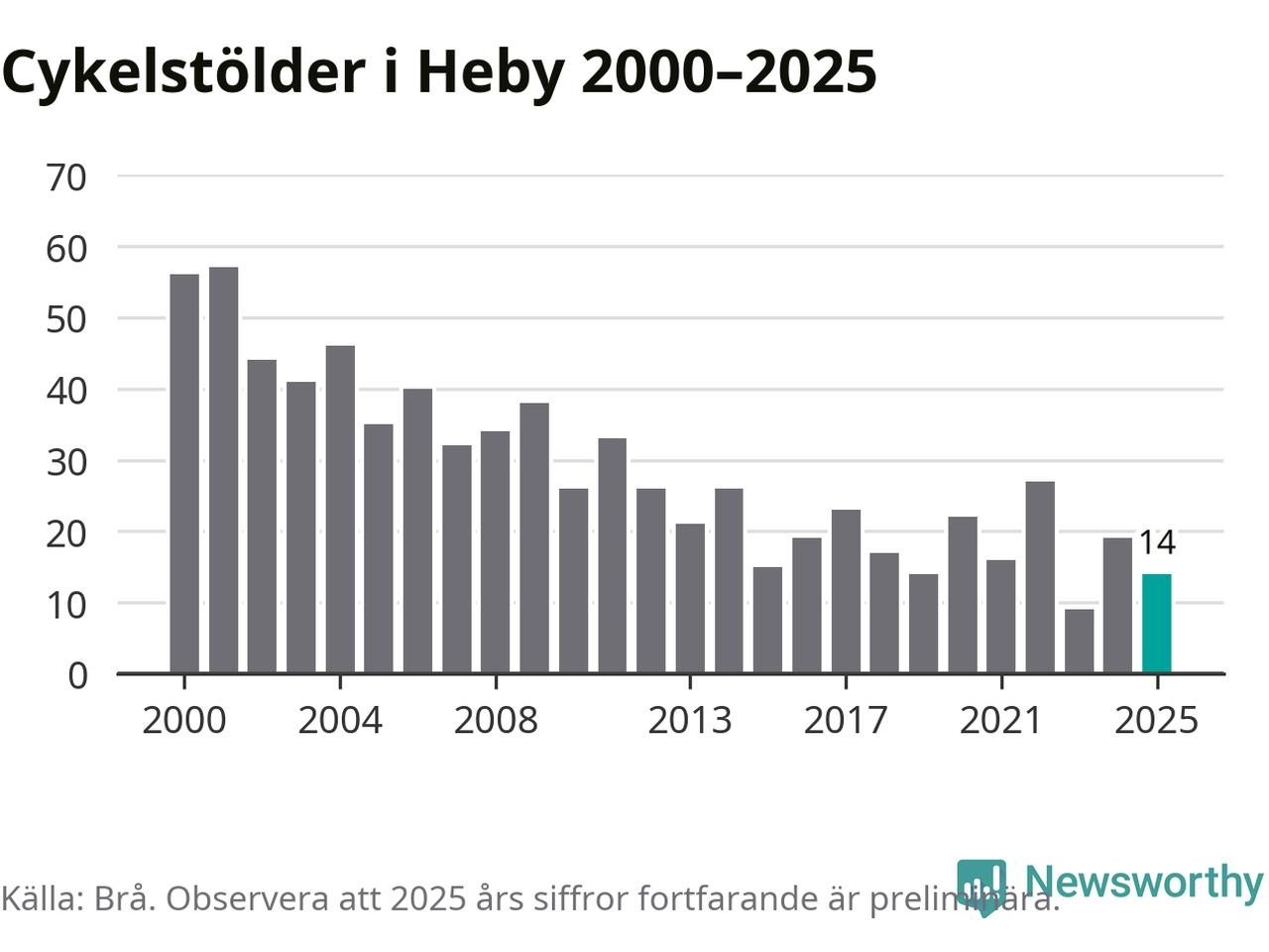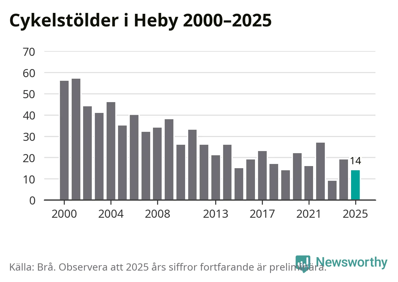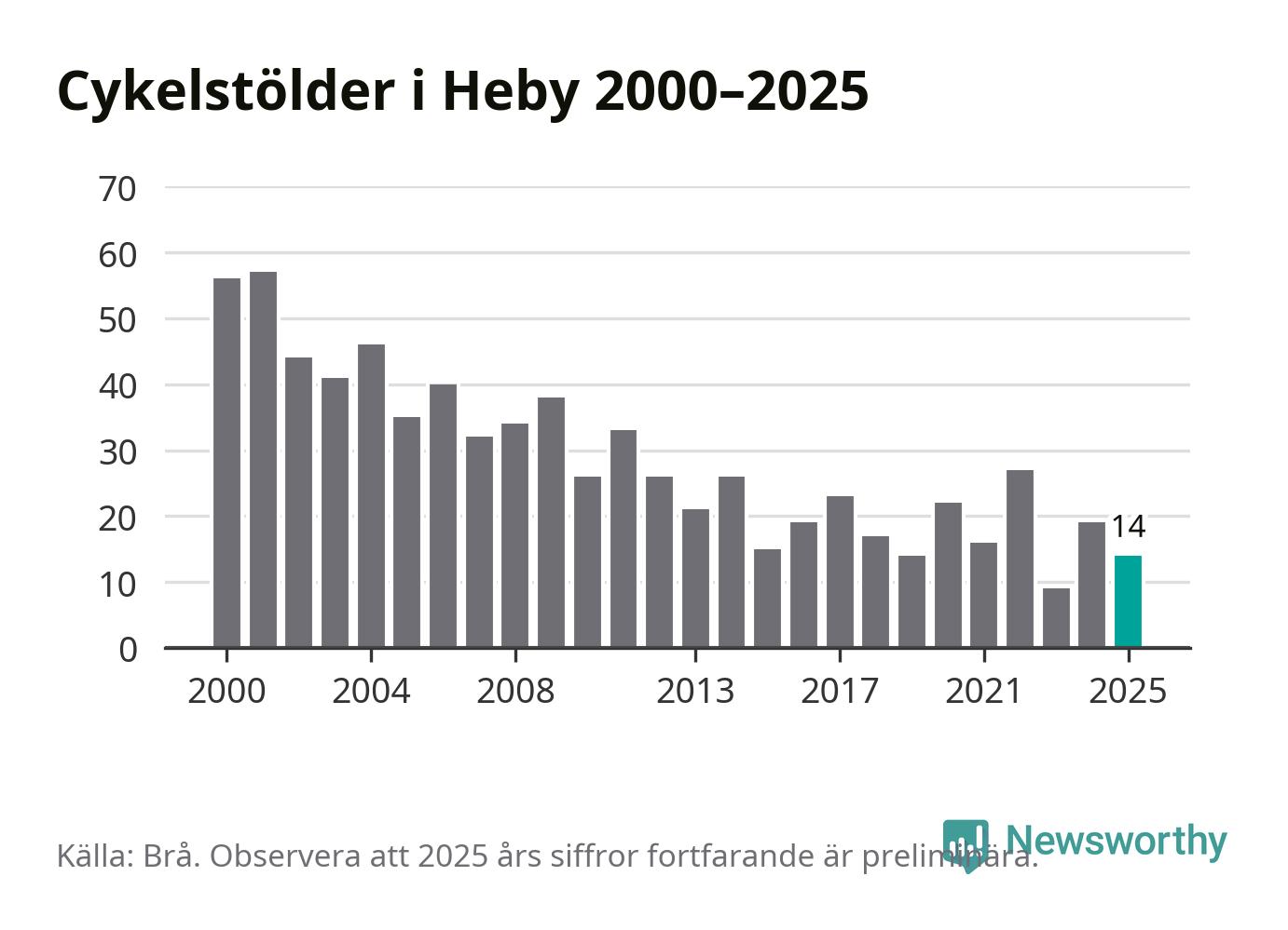 I Heby kommun var antalet cykelstölder relativt få i en historisk kontext år 2025, även om det fortfarande är preliminära siffror. Under de senaste 25 åren har det som mest anmälts 57 cykelstölder på ett år (2001), som minst 9 stycken (2023).