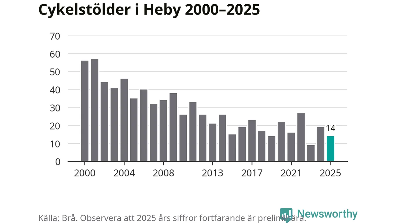 Av de 14 stöldanmälningar i Heby 2025 gällde två elcyklar, det motsvarar 14 procent. Brå särredovisar elcyklar sedan 2020 och i riket som helhet ökade anmälningarna om stulna elcyklar kraftigt de första åren, för att de senaste tre åren ha legat relativt stilla. Eftersom antalet cykelstölder totalt har minskat under samma tid har andelen elcyklar ökat. I fjol stod elcyklar för 28 procent av alla anmälda cykelstölder i landet.