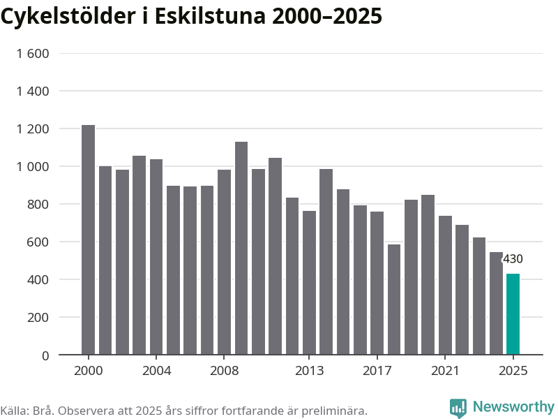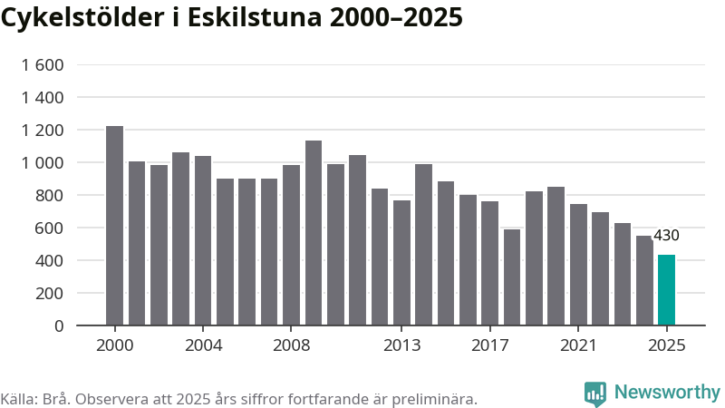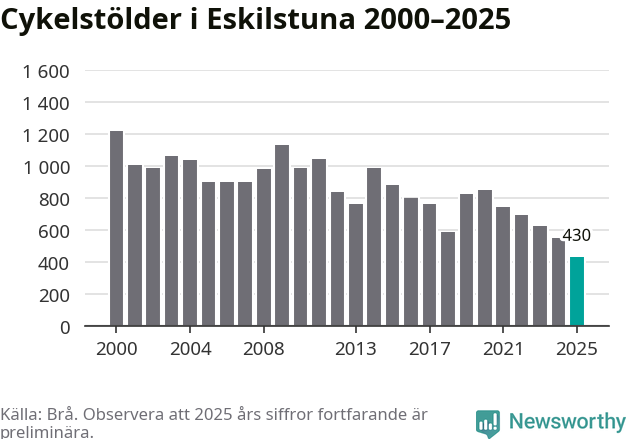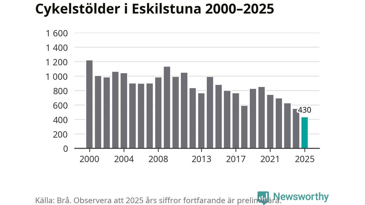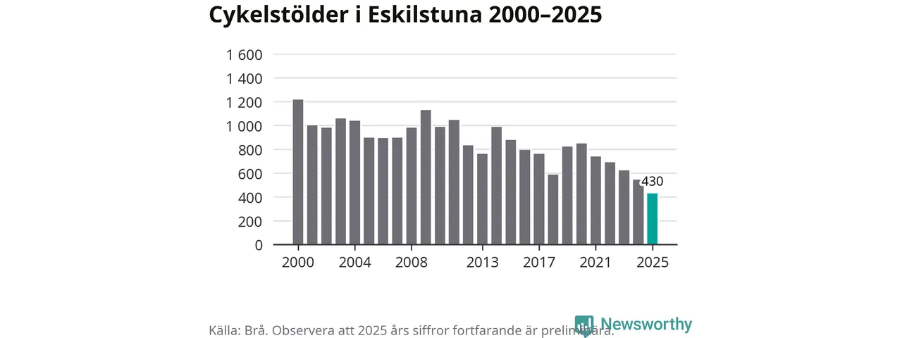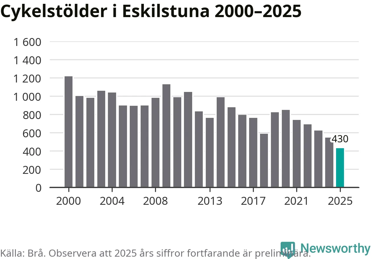 I Eskilstuna kommun noterades det lägsta antalet cykelstölder under hela 2000-talet år 2025, även om det fortfarande är preliminära siffror. Under de senaste 25 åren har det som mest anmälts 1 218 cykelstölder på ett år (2000).