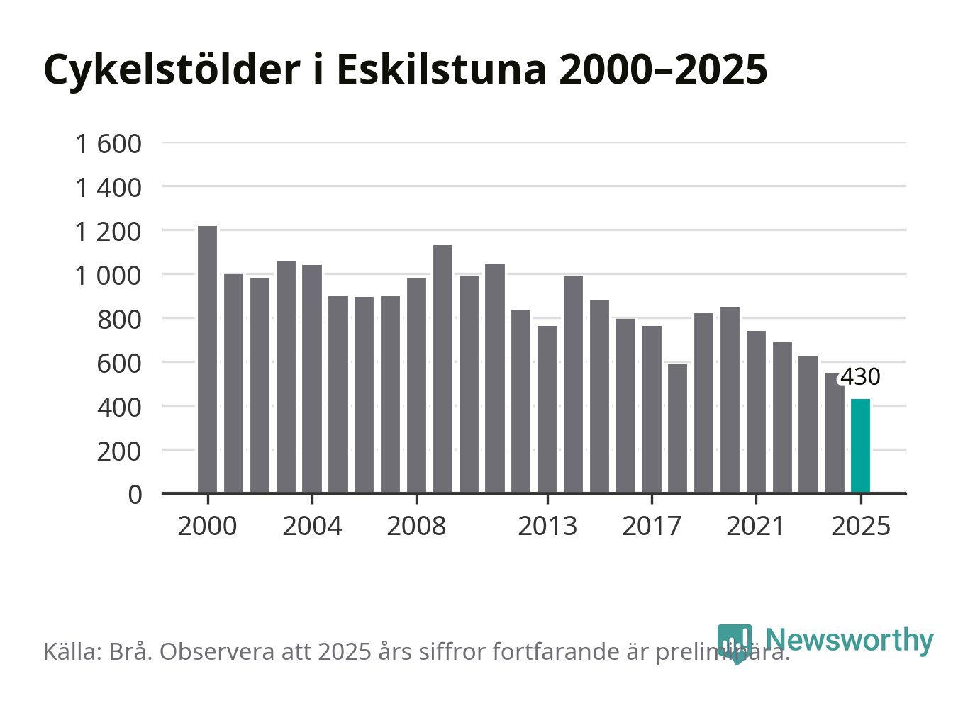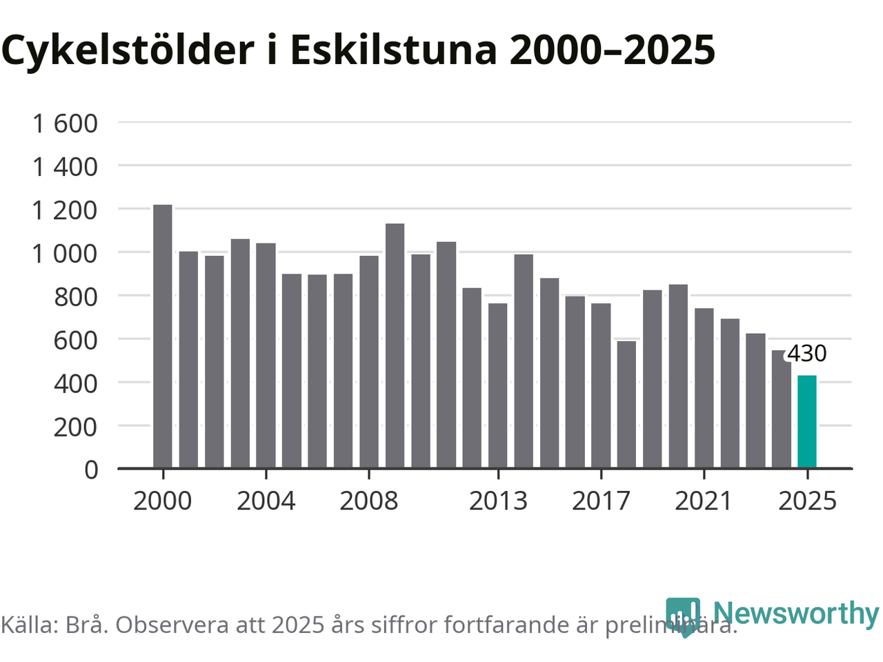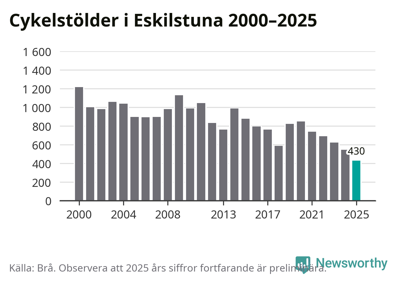 I Eskilstuna kommun noterades det lägsta antalet cykelstölder under hela 2000-talet år 2025, även om det fortfarande är preliminära siffror. Under de senaste 25 åren har det som mest anmälts 1 218 cykelstölder på ett år (2000).