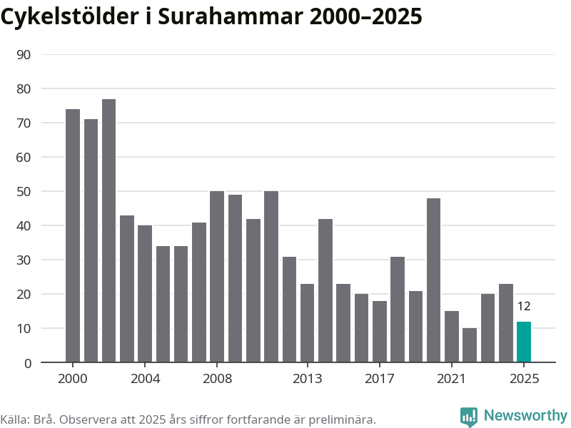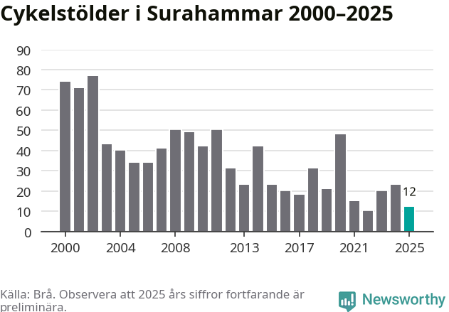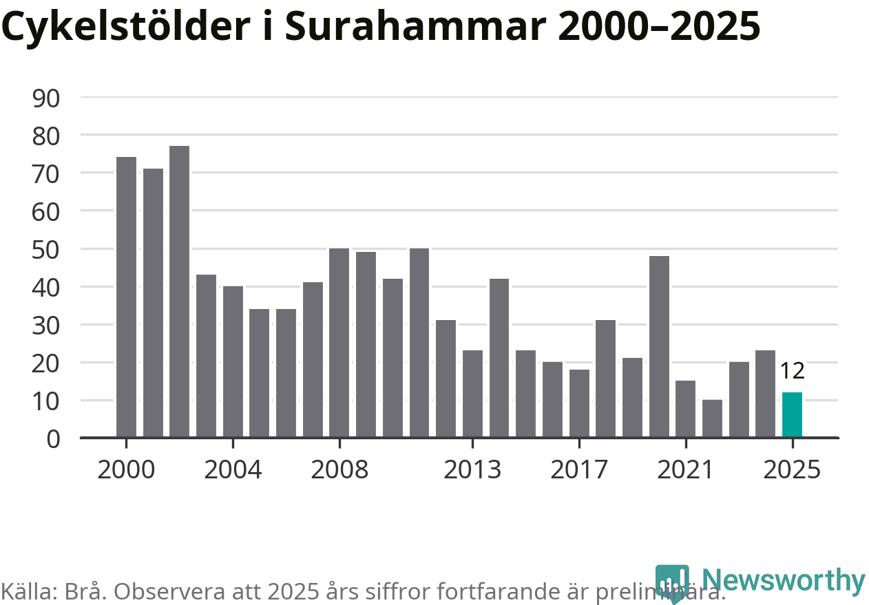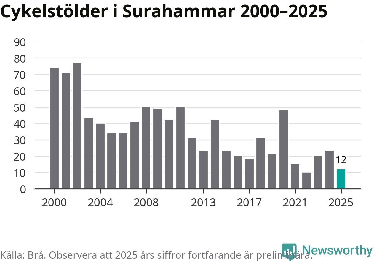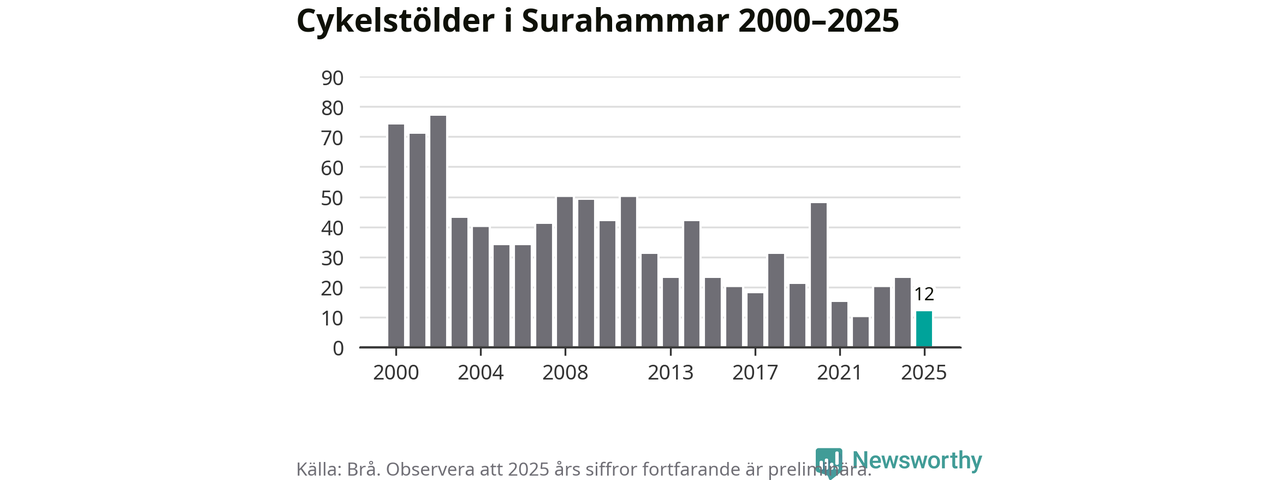 I Surahammars kommun var antalet cykelstölder relativt få i en historisk kontext år 2025, även om det fortfarande är preliminära siffror. Under de senaste 25 åren har det som mest anmälts 77 cykelstölder på ett år (2002), som minst 10 stycken (2022).