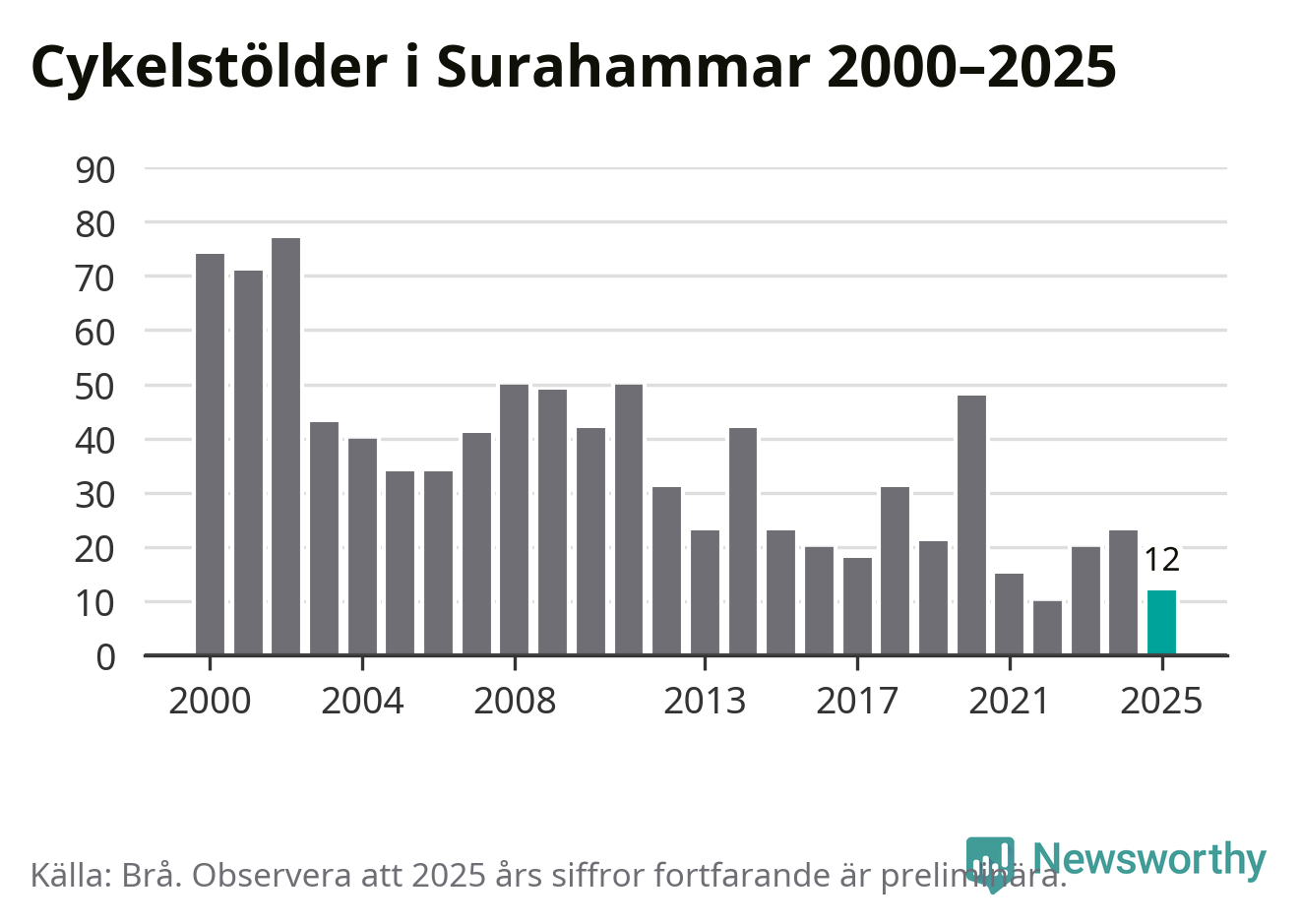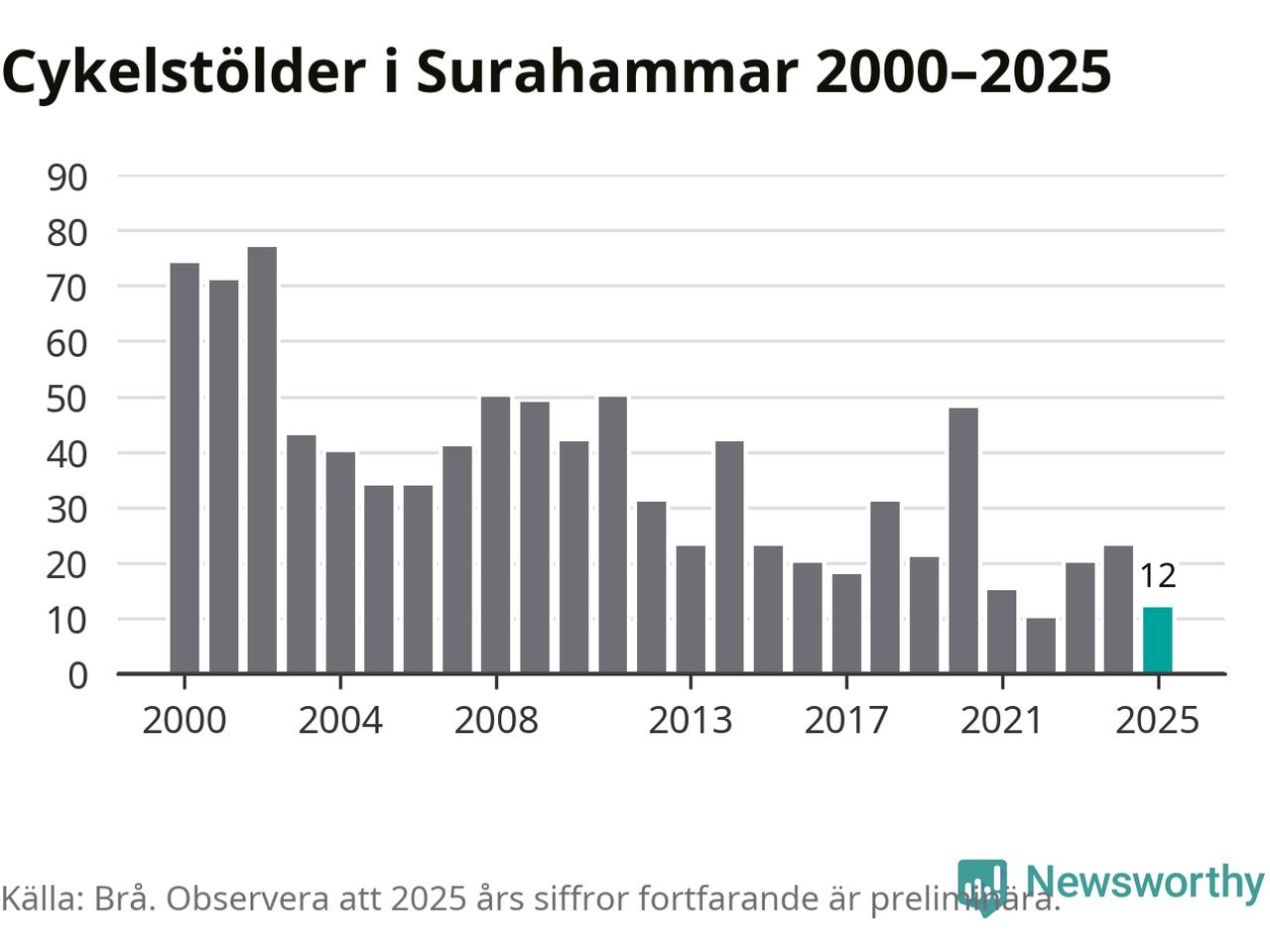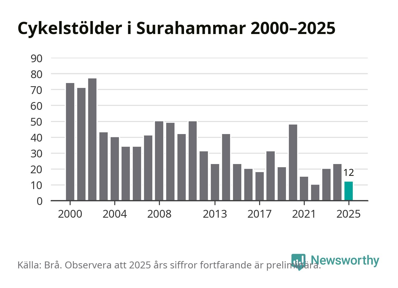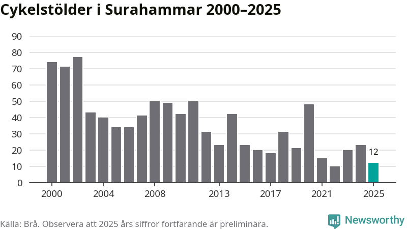 I Surahammars kommun var antalet cykelstölder relativt få i en historisk kontext år 2025, även om det fortfarande är preliminära siffror. Under de senaste 25 åren har det som mest anmälts 77 cykelstölder på ett år (2002), som minst 10 stycken (2022).