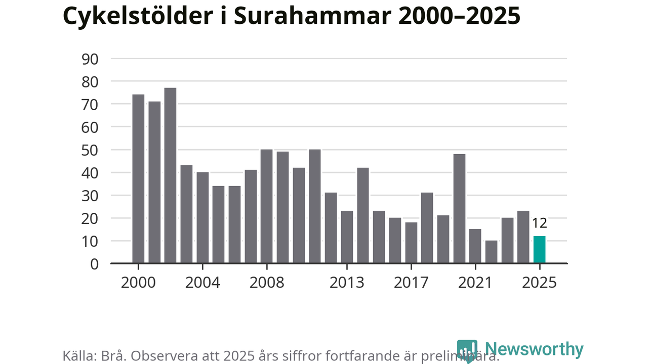 Av de tolv stöldanmälningar i Surahammar 2025 gällde tre elcyklar, det motsvarar 25 procent. Brå särredovisar elcyklar sedan 2020 och i riket som helhet ökade anmälningarna om stulna elcyklar kraftigt de första åren, för att de senaste tre åren ha legat relativt stilla. Eftersom antalet cykelstölder totalt har minskat under samma tid har andelen elcyklar ökat. I fjol stod elcyklar för 28 procent av alla anmälda cykelstölder i landet.