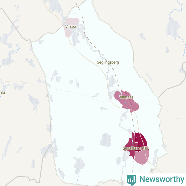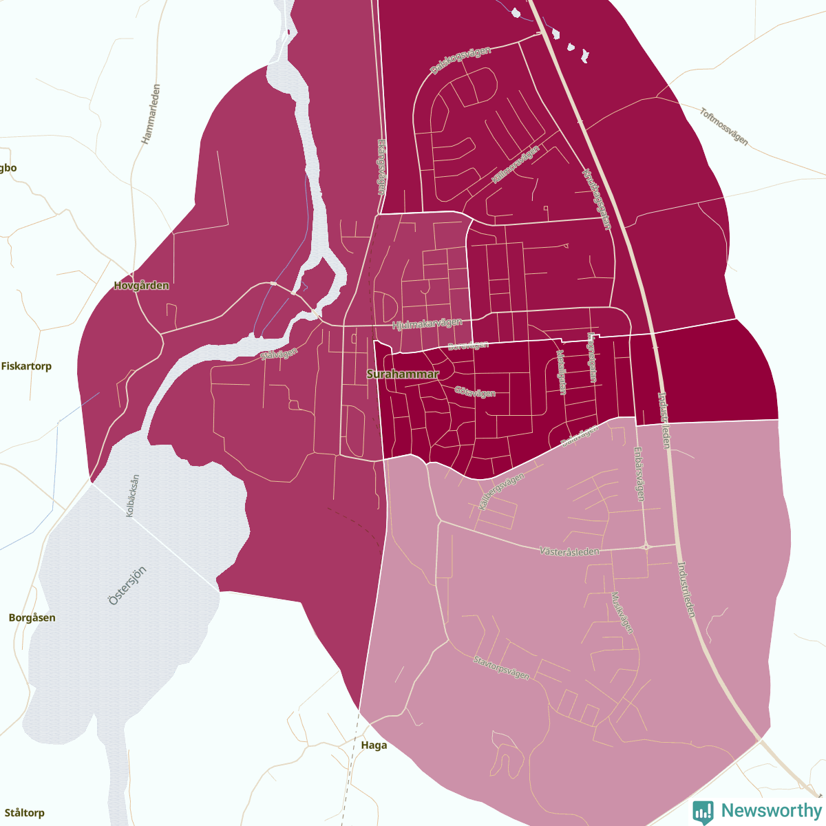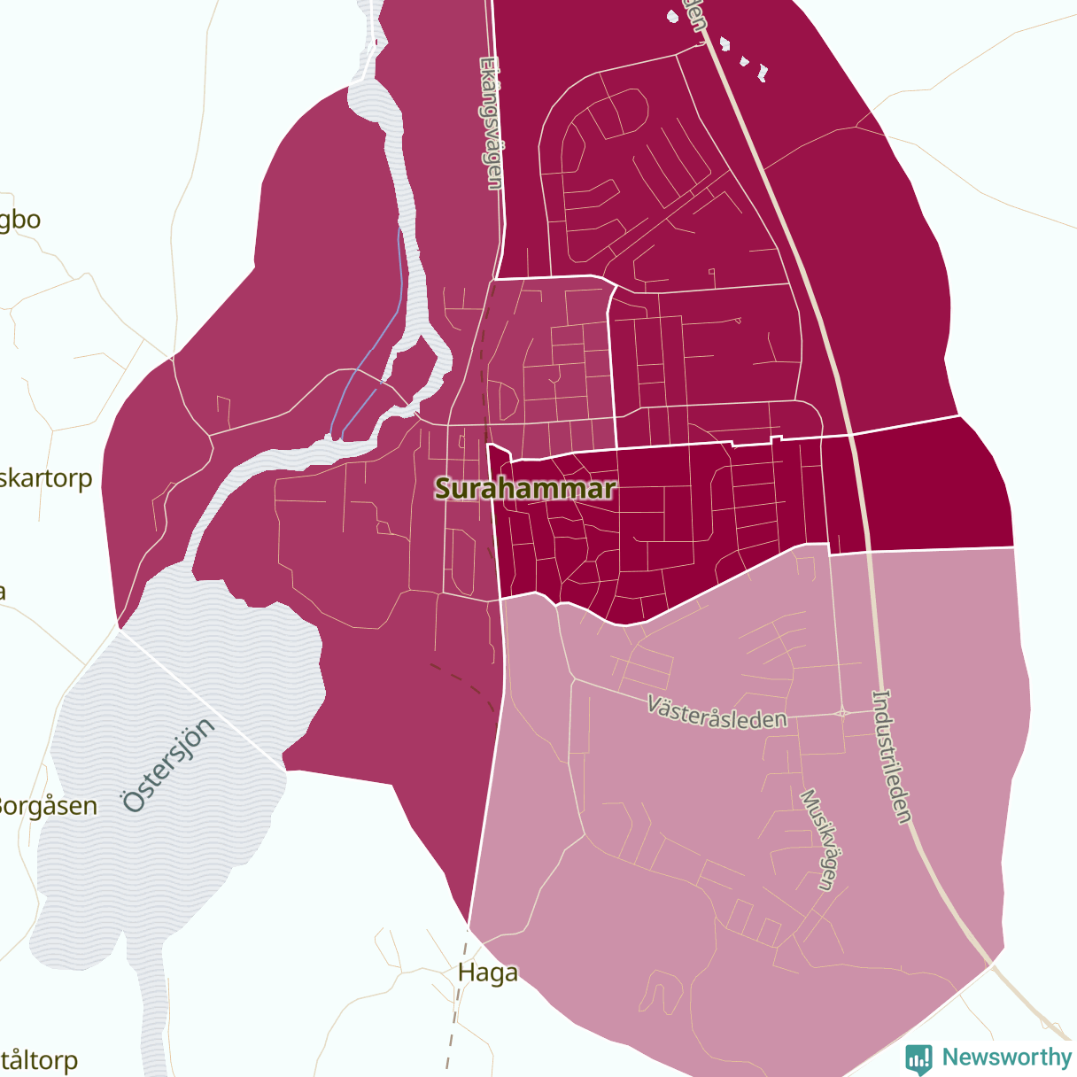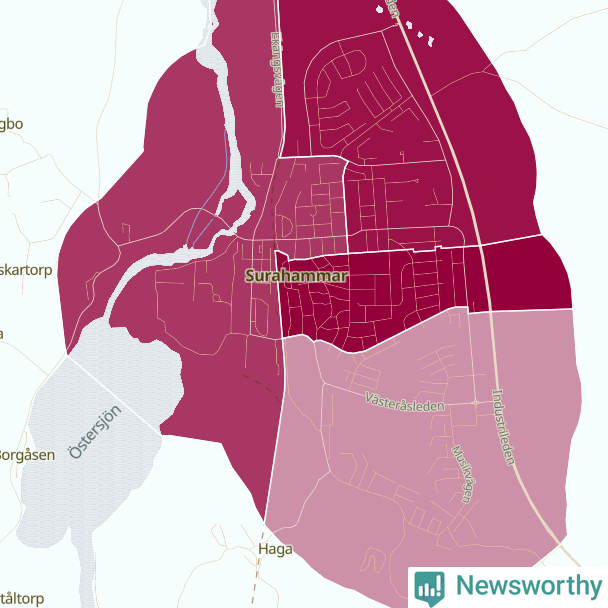 Skillnaderna mellan olika områden i Surahammar är relativt små. Det visar data för de senaste fem åren, som Newsworthy har begärt ut från polisen. De anmälda stölderna har kopplats till SCB:s sju statistiska områden i kommunen. Det rör sig om mellan en handfull och ett femtontal anmälda stölder per område.