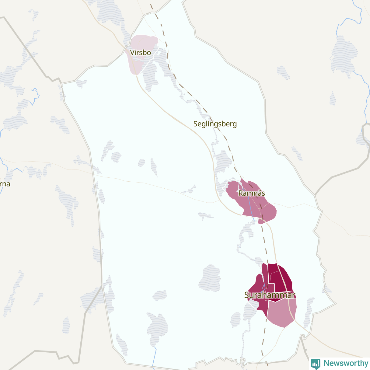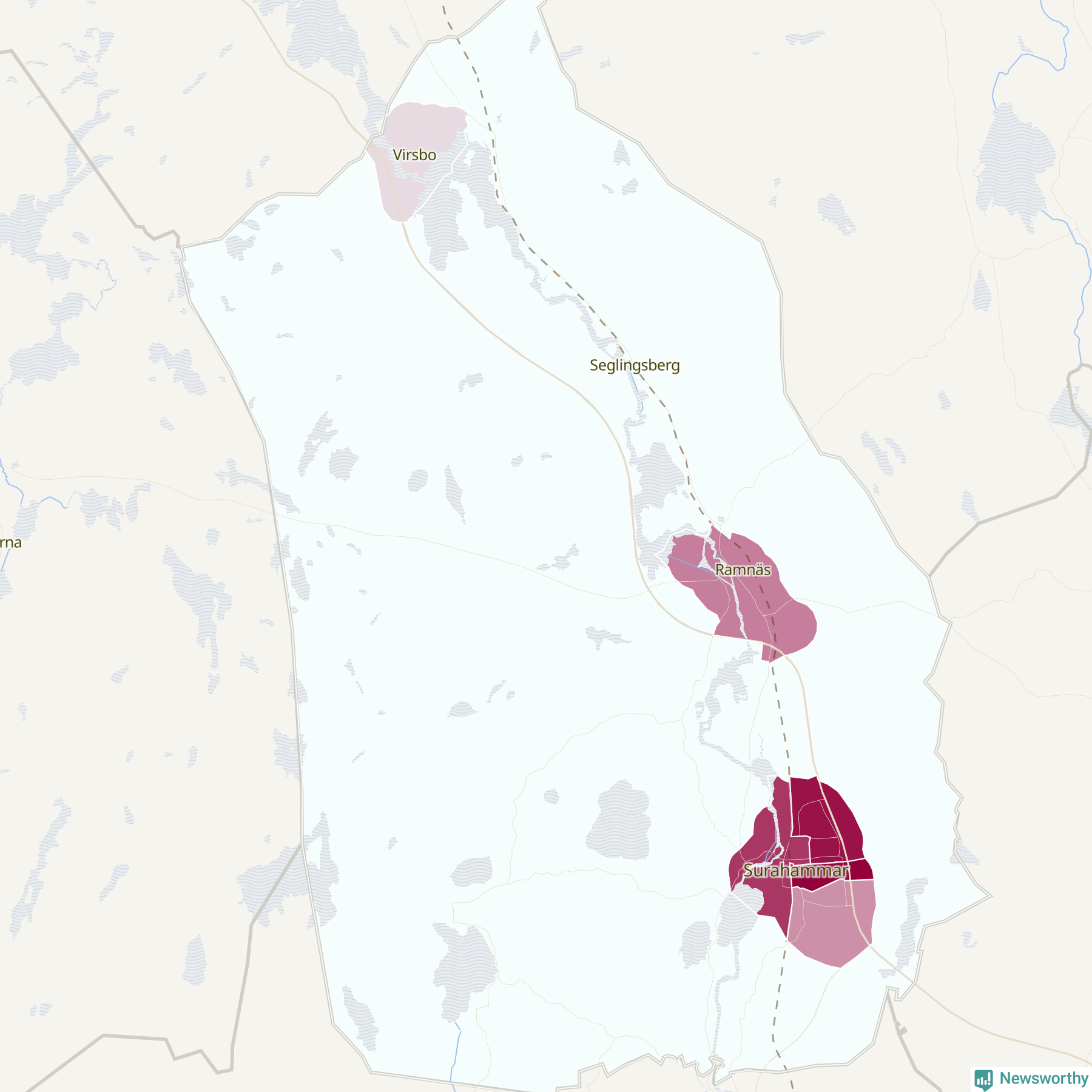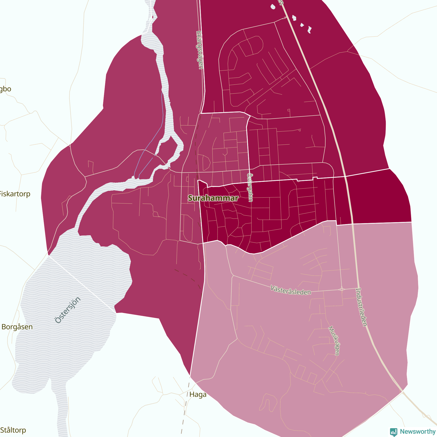 Skillnaderna mellan olika områden i Surahammar är relativt små. Det visar data för de senaste fem åren, som Newsworthy har begärt ut från polisen. De anmälda stölderna har kopplats till SCB:s sju statistiska områden i kommunen. Det rör sig om mellan en handfull och ett femtontal anmälda stölder per område.