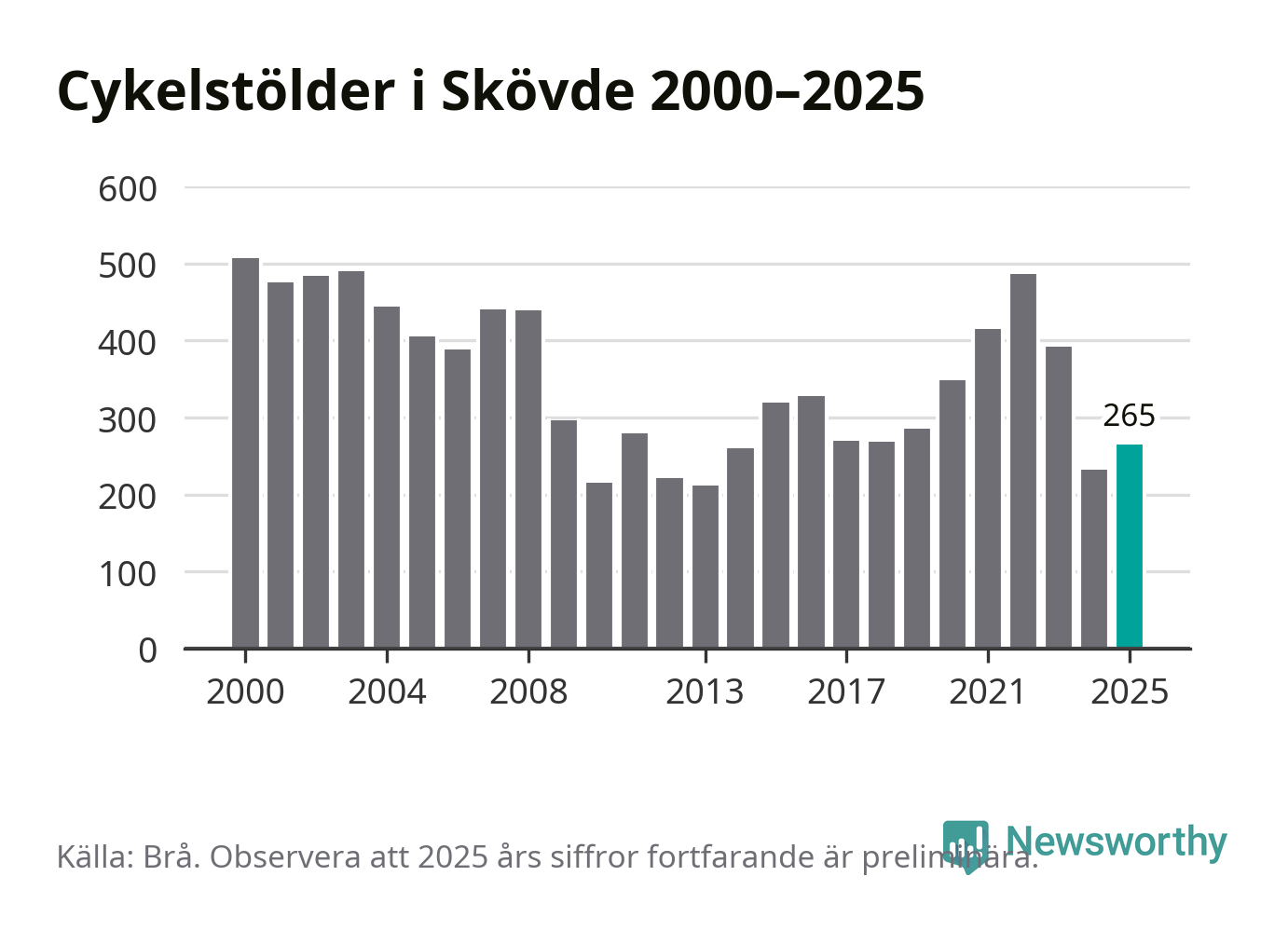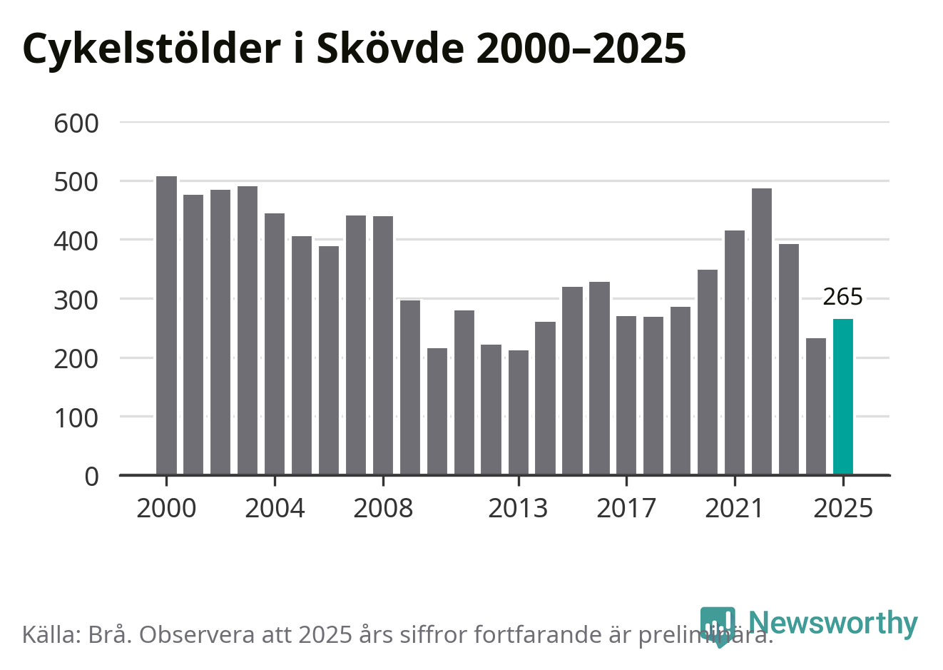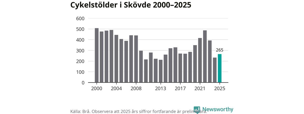 I Skövde kommun var antalet cykelstölder relativt få i en historisk kontext år 2025, även om det fortfarande är preliminära siffror. Under de senaste 25 åren har det som mest anmälts 507 cykelstölder på ett år (2000), som minst 212 stycken (2013).