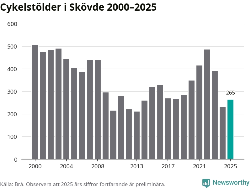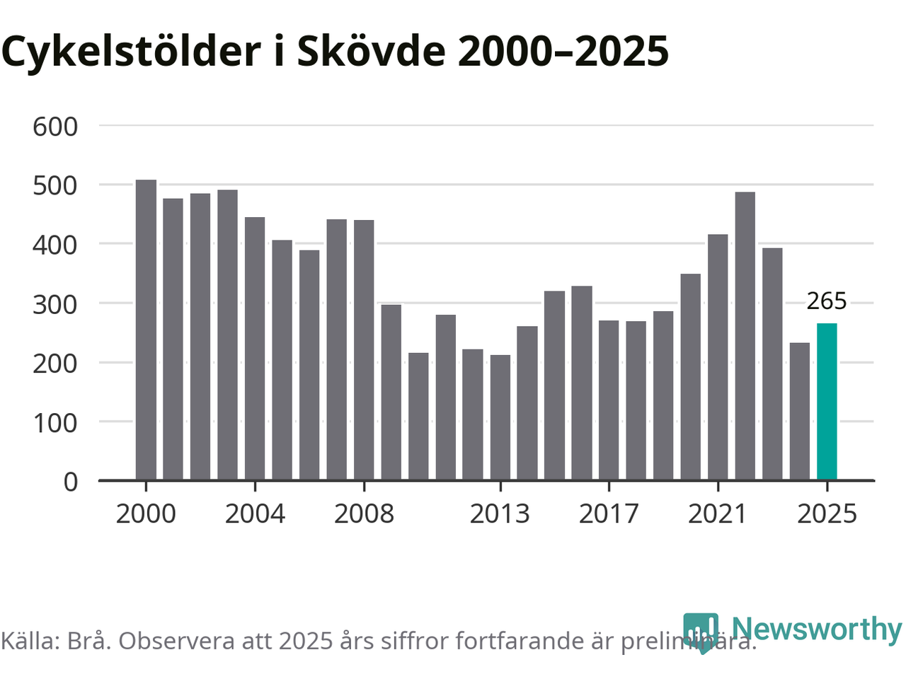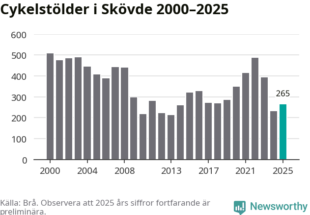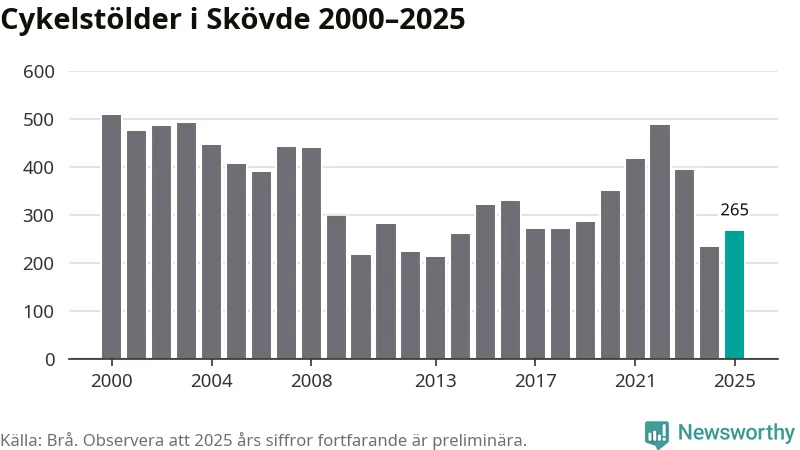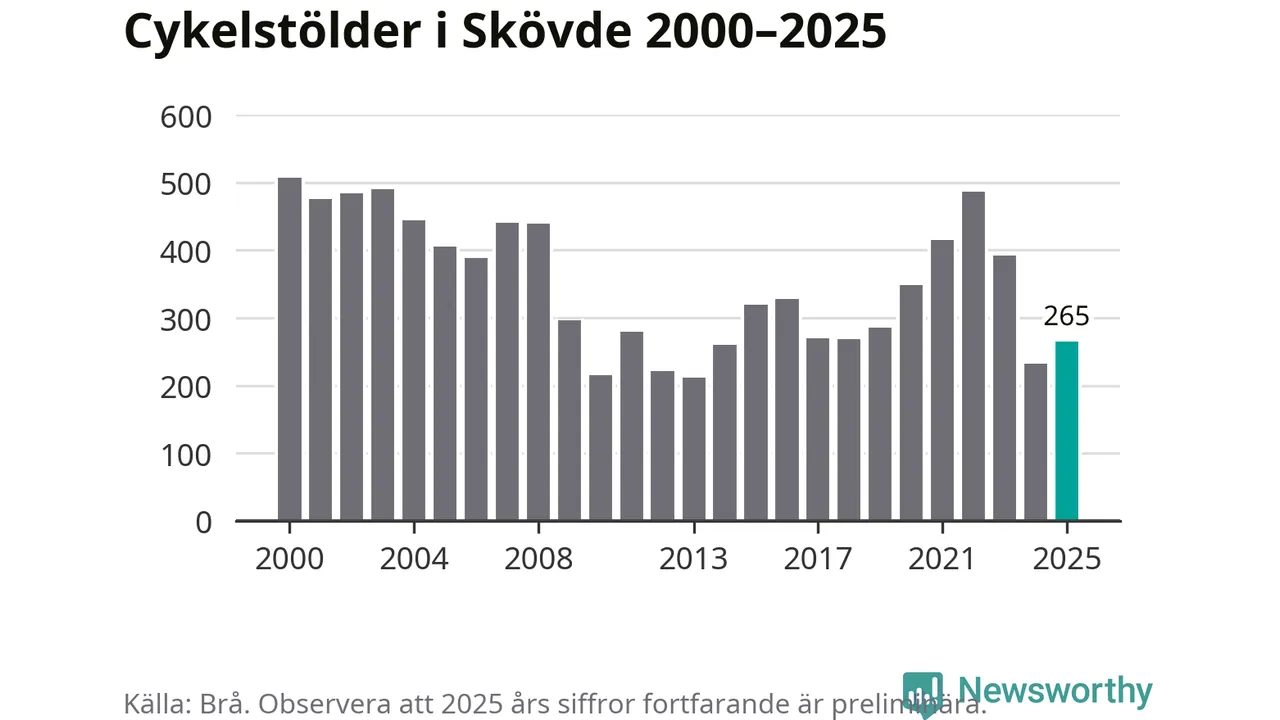 I Skövde kommun var antalet cykelstölder relativt få i en historisk kontext år 2025, även om det fortfarande är preliminära siffror. Under de senaste 25 åren har det som mest anmälts 507 cykelstölder på ett år (2000), som minst 212 stycken (2013).