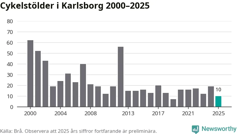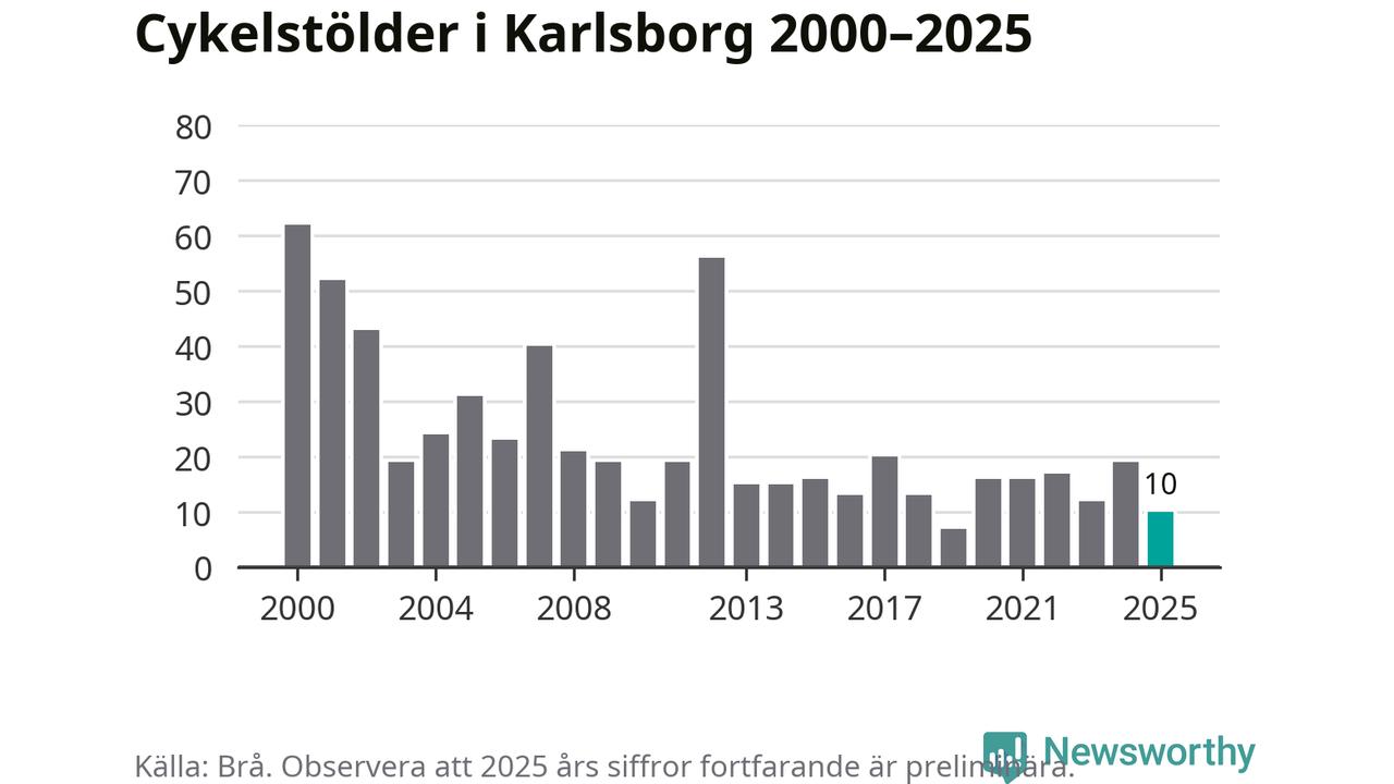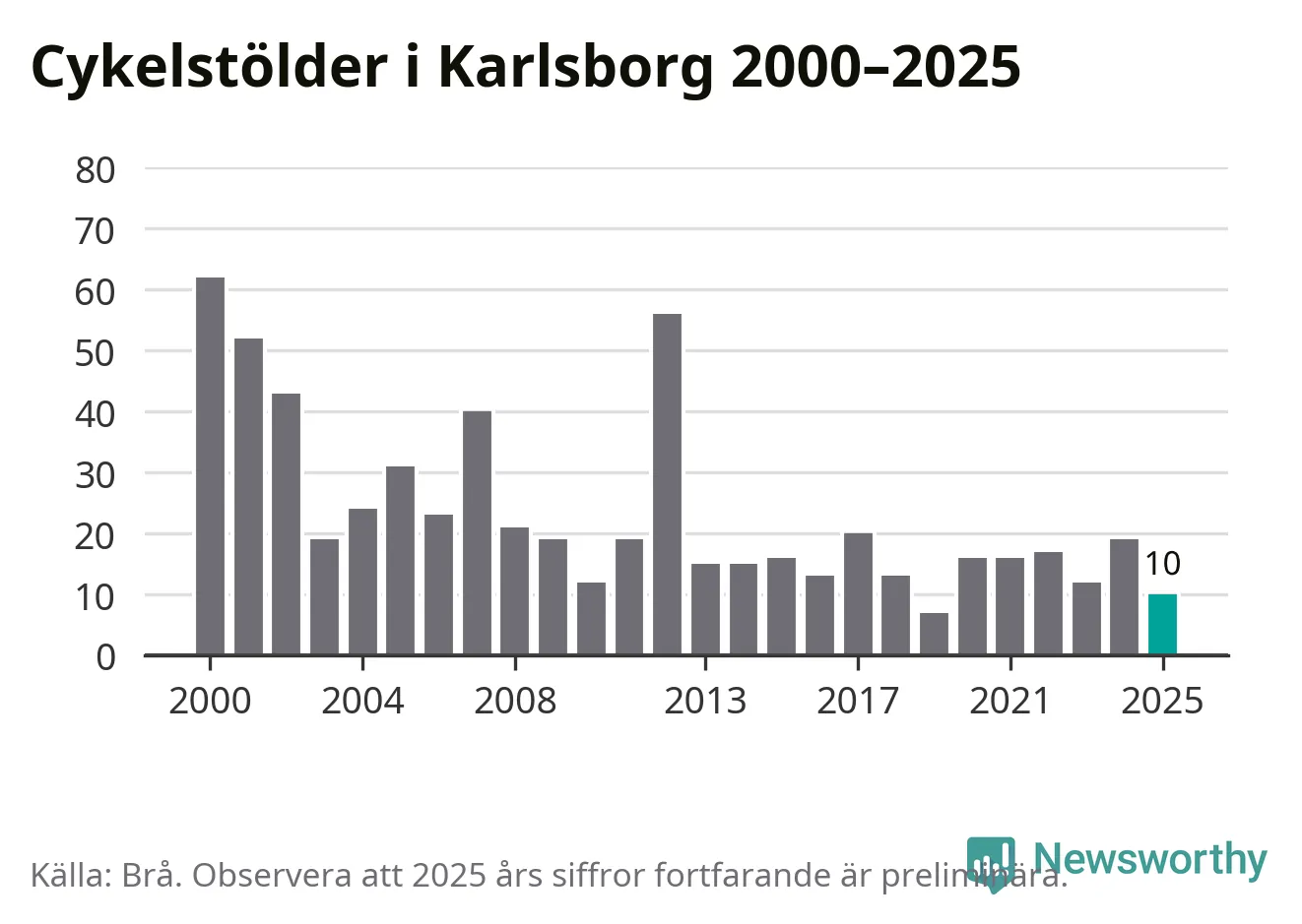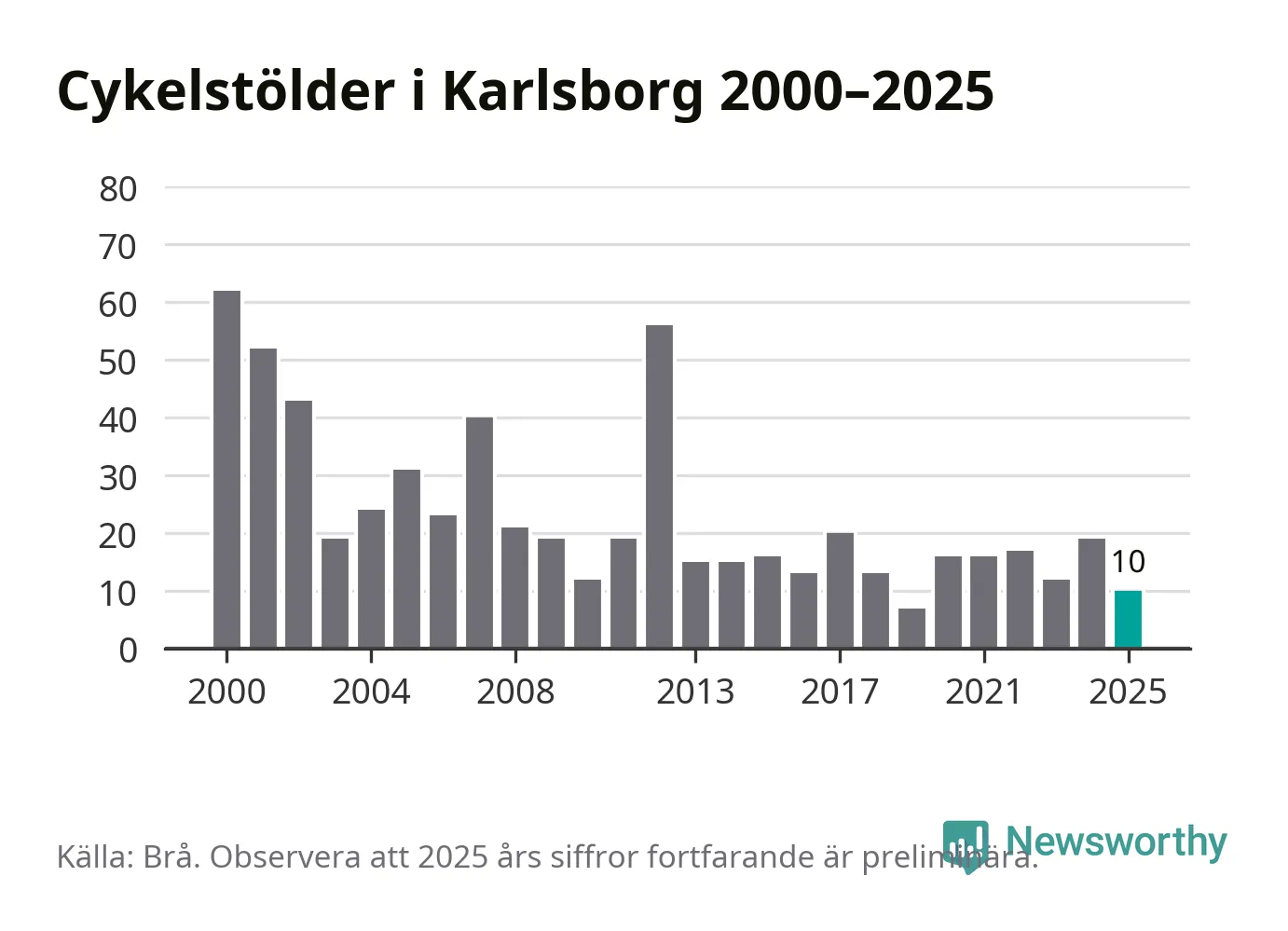 I Karlsborgs kommun var antalet cykelstölder relativt få i en historisk kontext år 2025, även om det fortfarande är preliminära siffror. Under de senaste 25 åren har det som mest anmälts 62 cykelstölder på ett år (2000), som minst 7 stycken (2019).