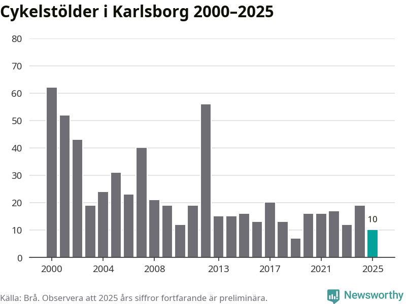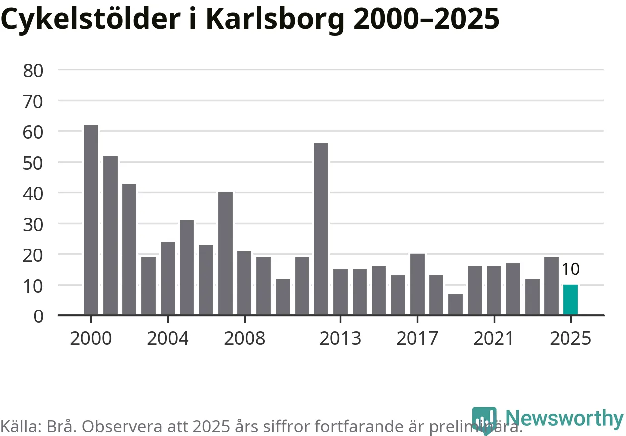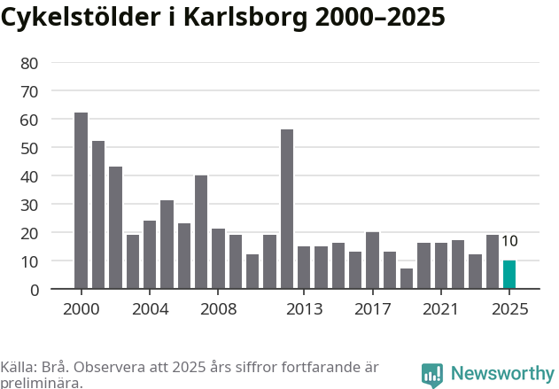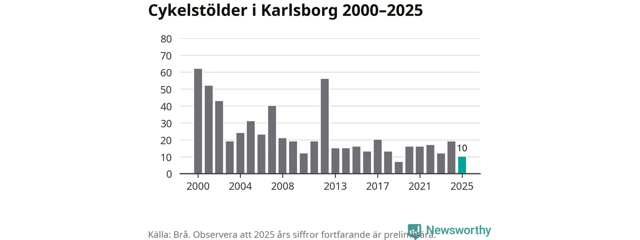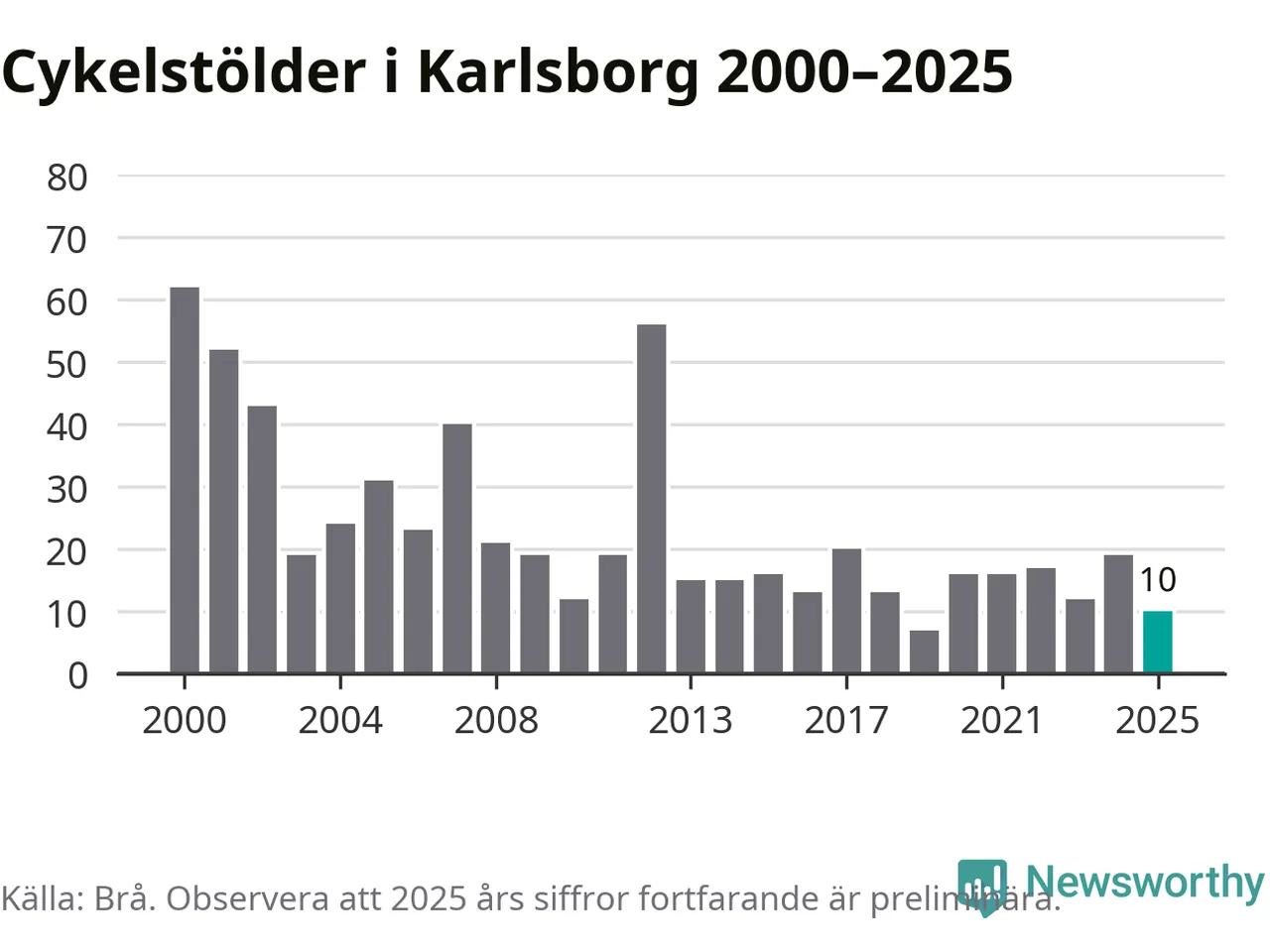 I Karlsborgs kommun var antalet cykelstölder relativt få i en historisk kontext år 2025, även om det fortfarande är preliminära siffror. Under de senaste 25 åren har det som mest anmälts 62 cykelstölder på ett år (2000), som minst 7 stycken (2019).