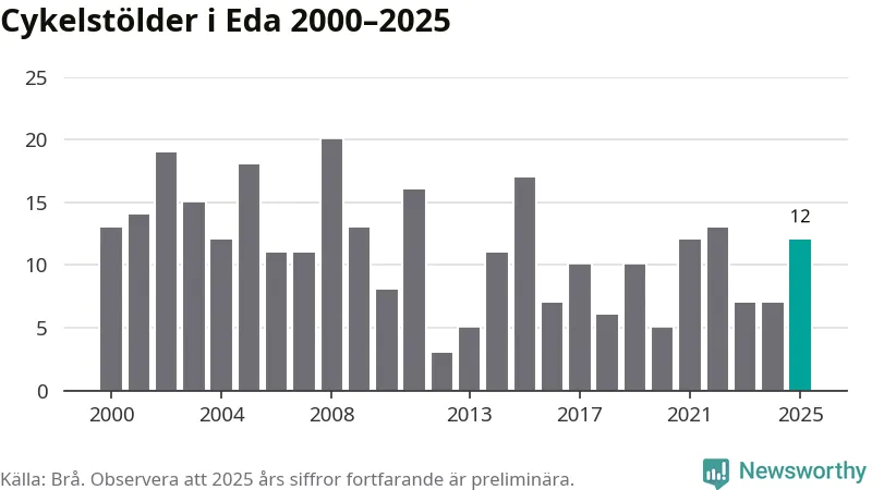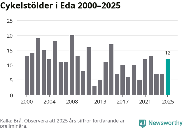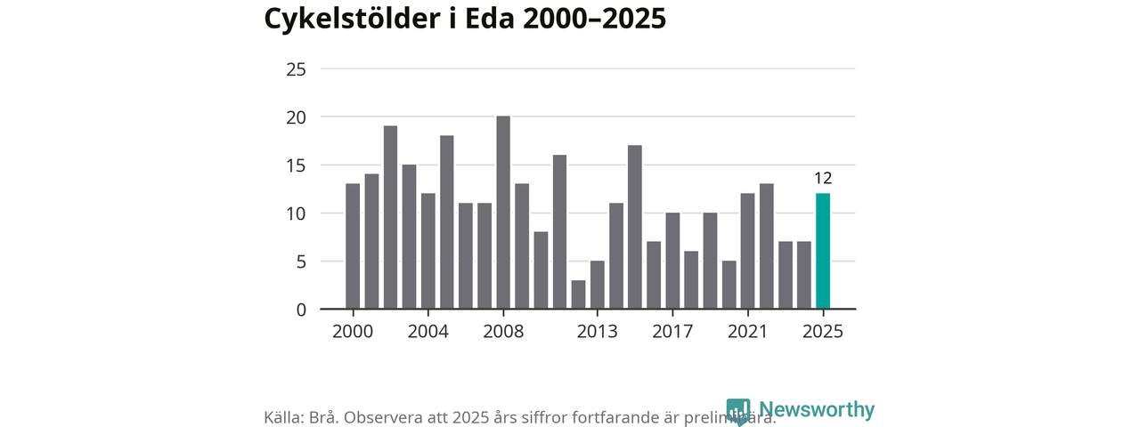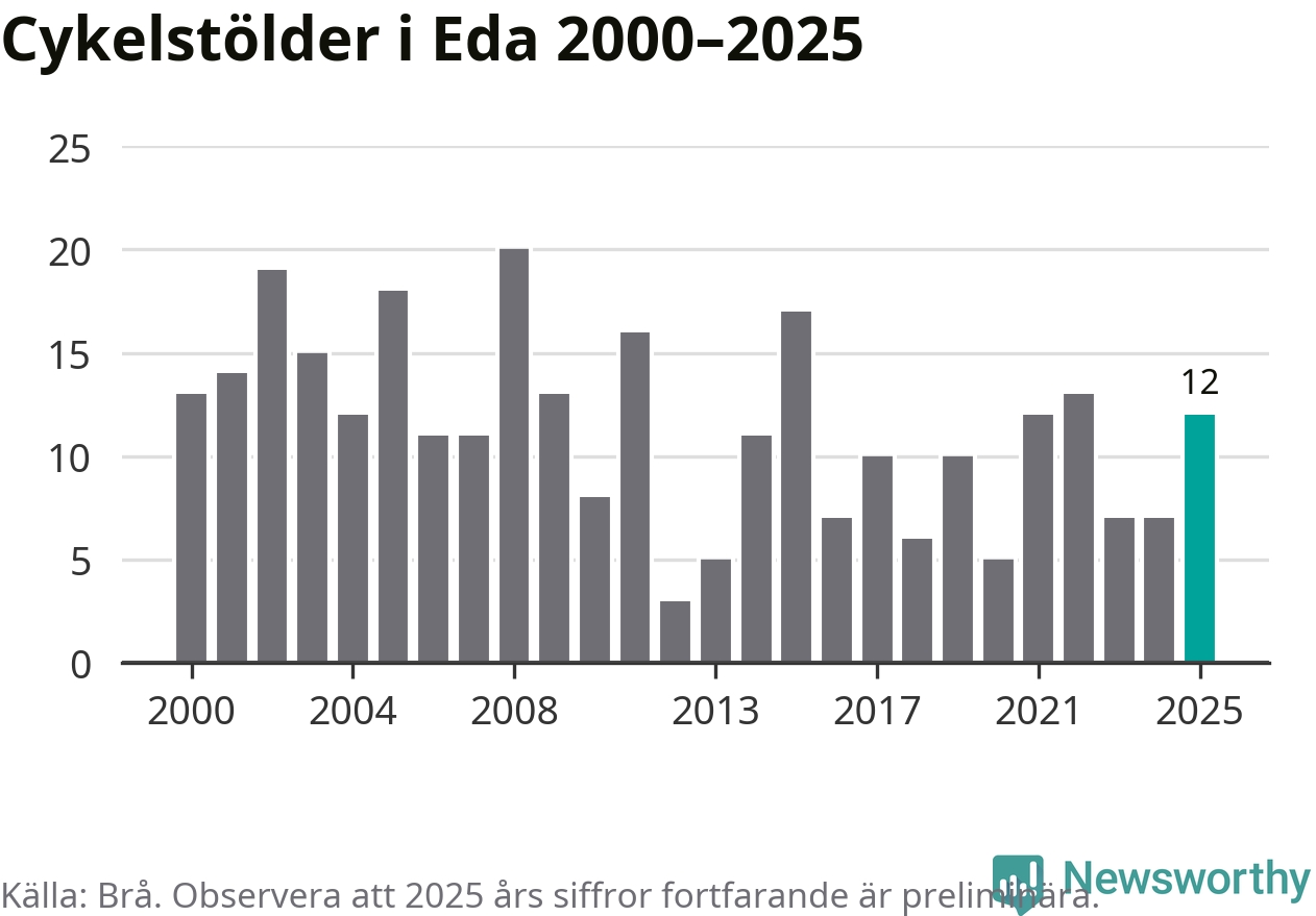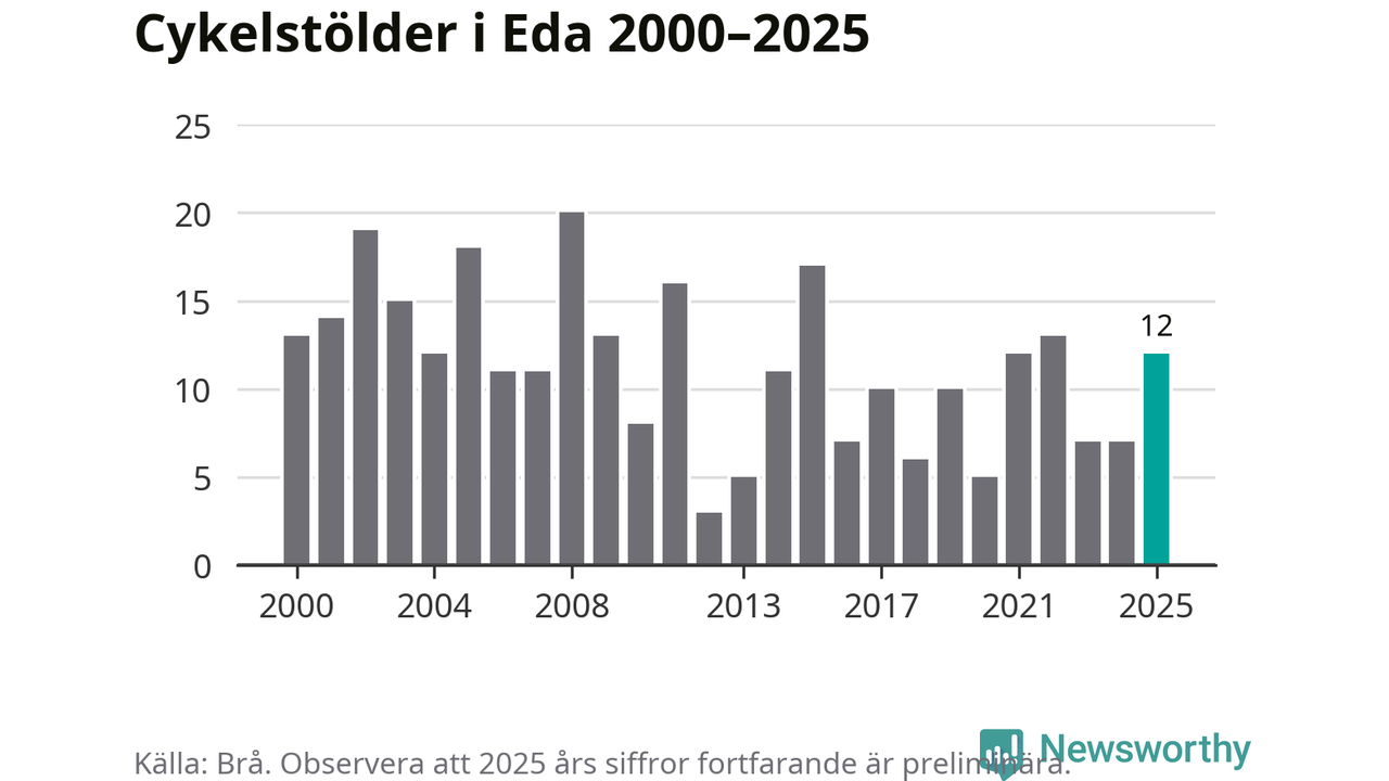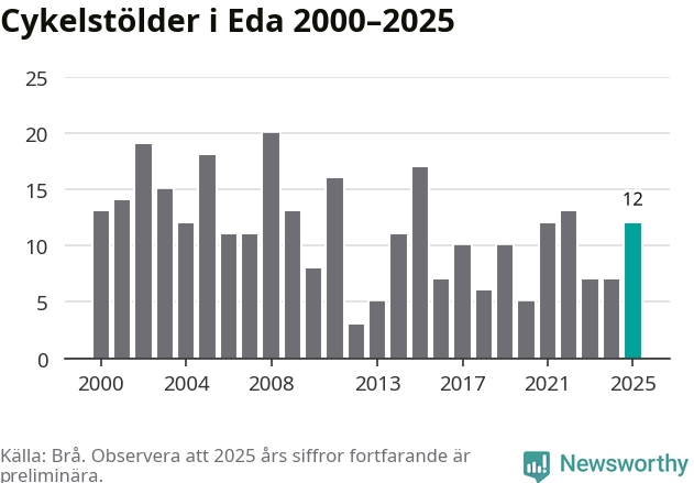 I Eda kommun sticker antalet cykelstölder 2025 inte ut i en historisk kontext. Under de senaste 25 åren har det som mest anmälts 20 cykelstölder på ett år (2008), som minst 3 stycken (2012).