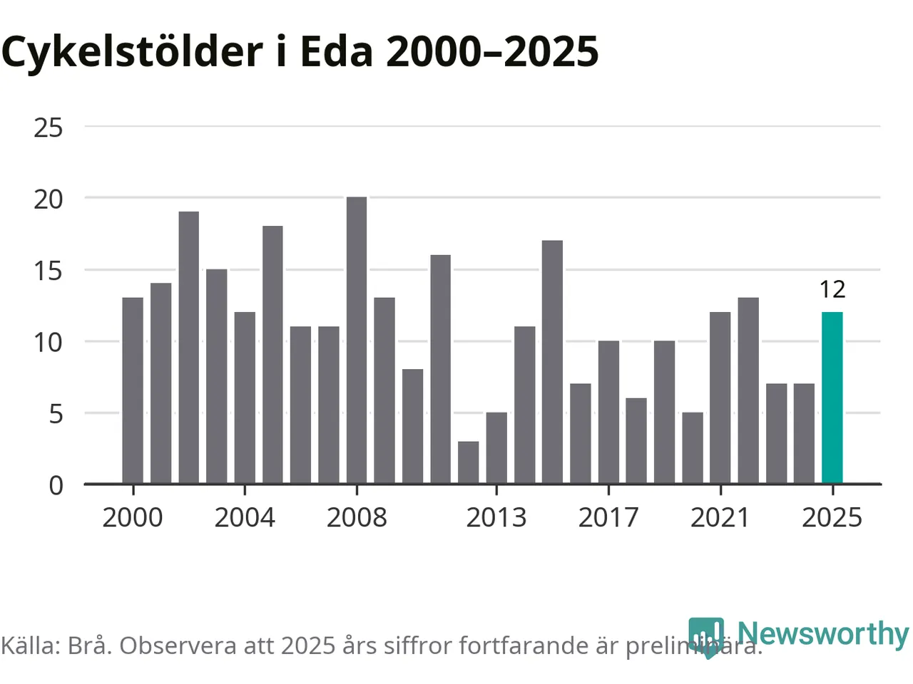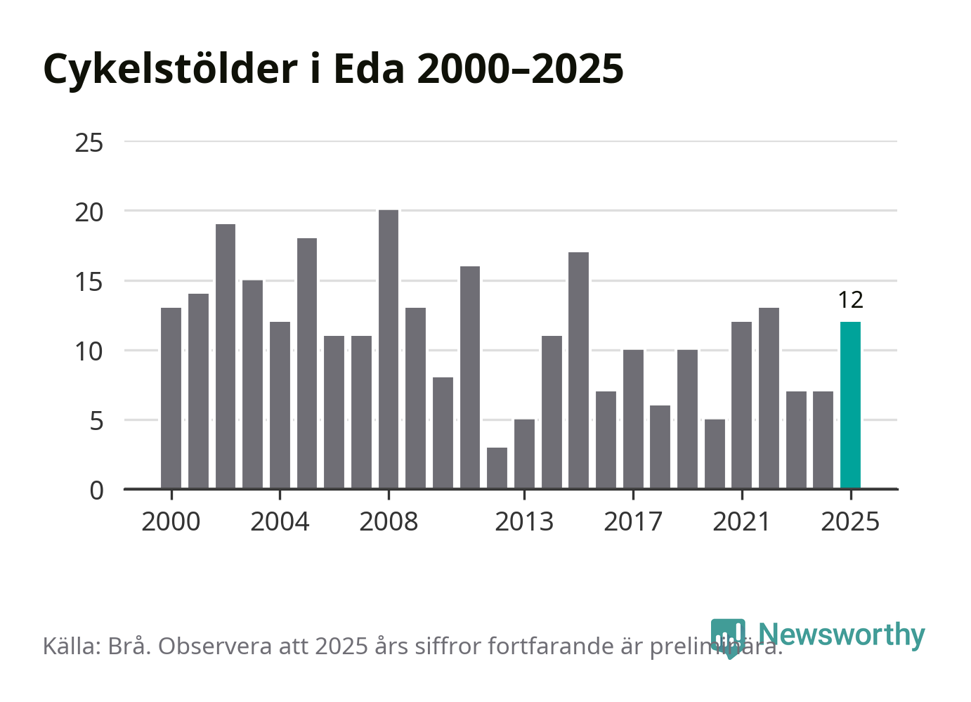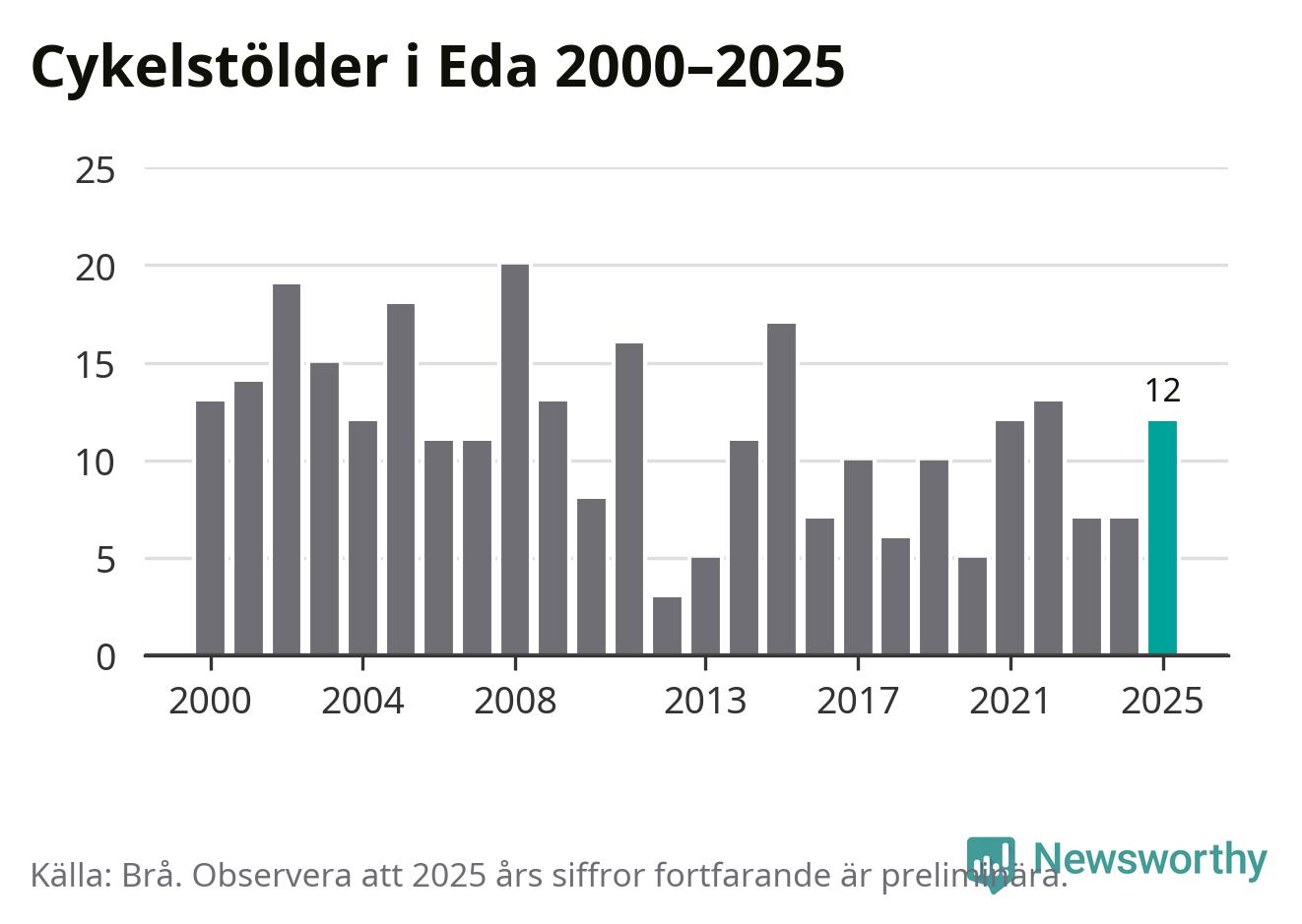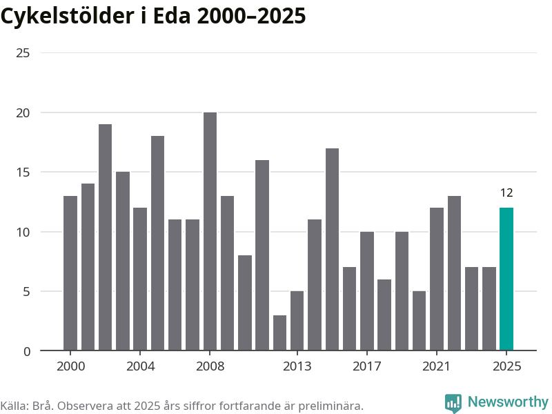 I Eda kommun sticker antalet cykelstölder 2025 inte ut i en historisk kontext. Under de senaste 25 åren har det som mest anmälts 20 cykelstölder på ett år (2008), som minst 3 stycken (2012).