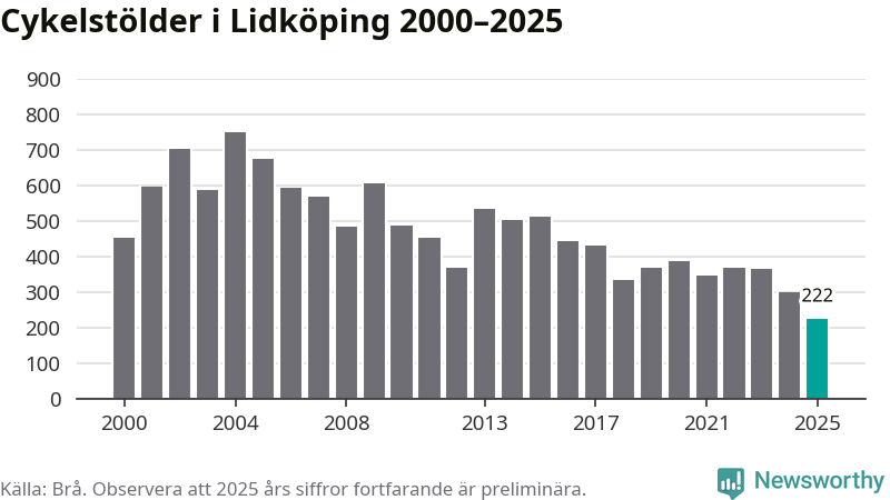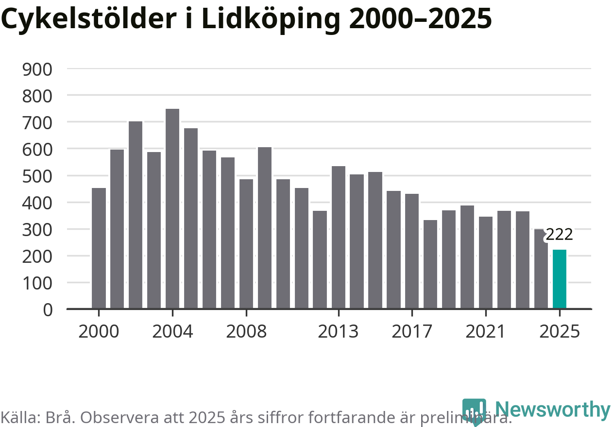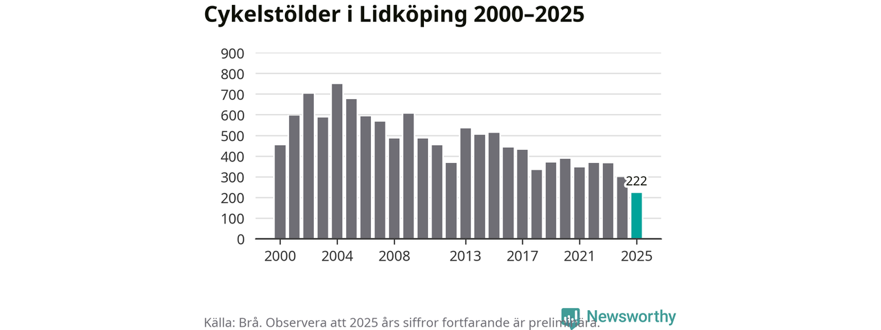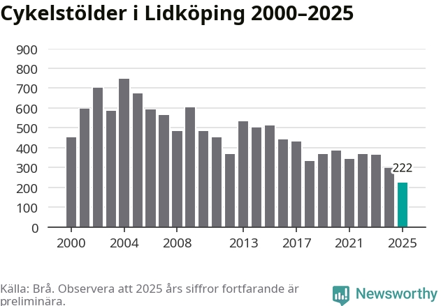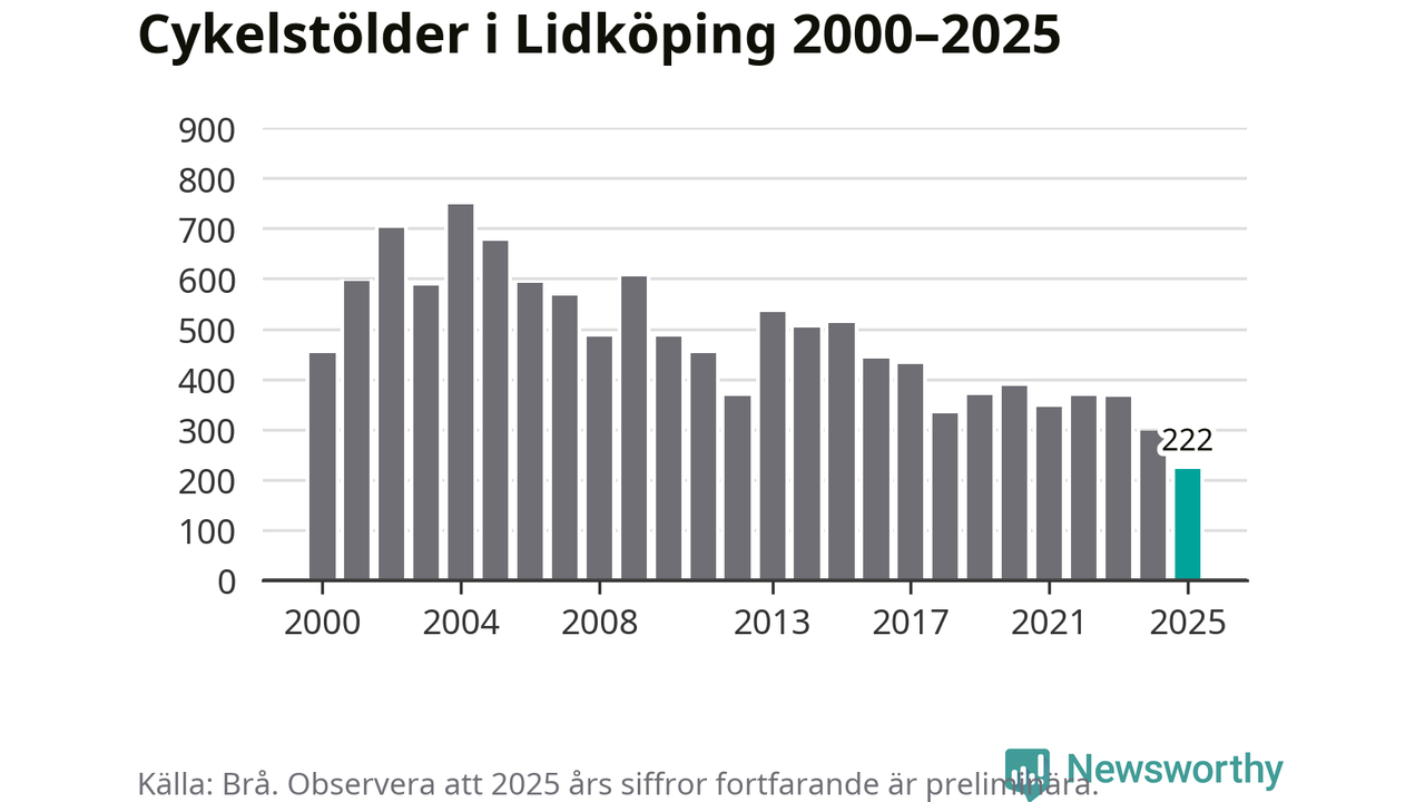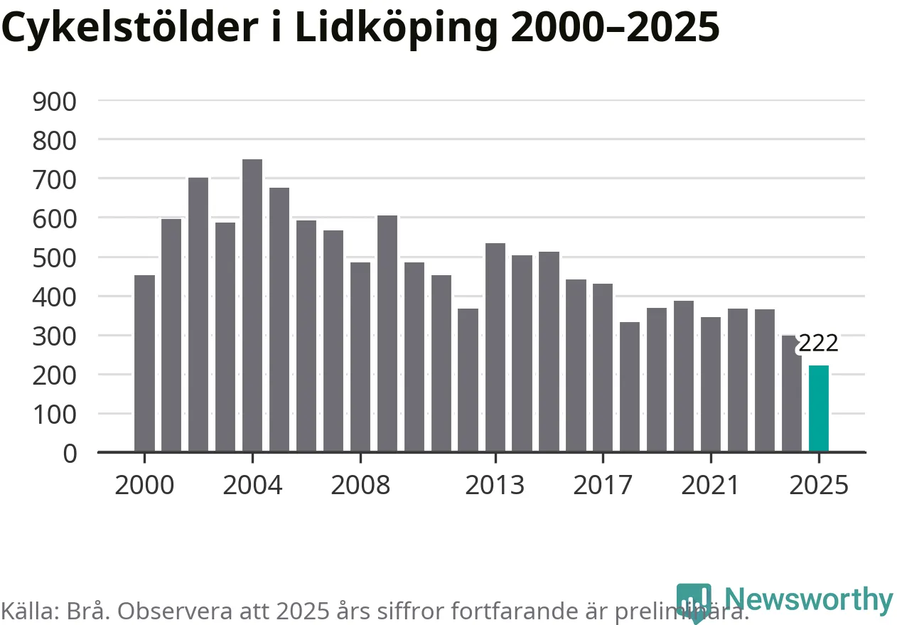 I Lidköpings kommun noterades det lägsta antalet cykelstölder under hela 2000-talet år 2025, även om det fortfarande är preliminära siffror. Under de senaste 25 åren har det som mest anmälts 748 cykelstölder på ett år (2004).