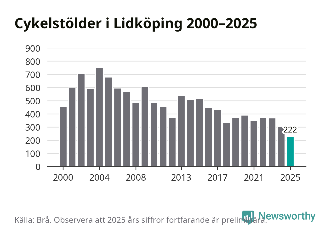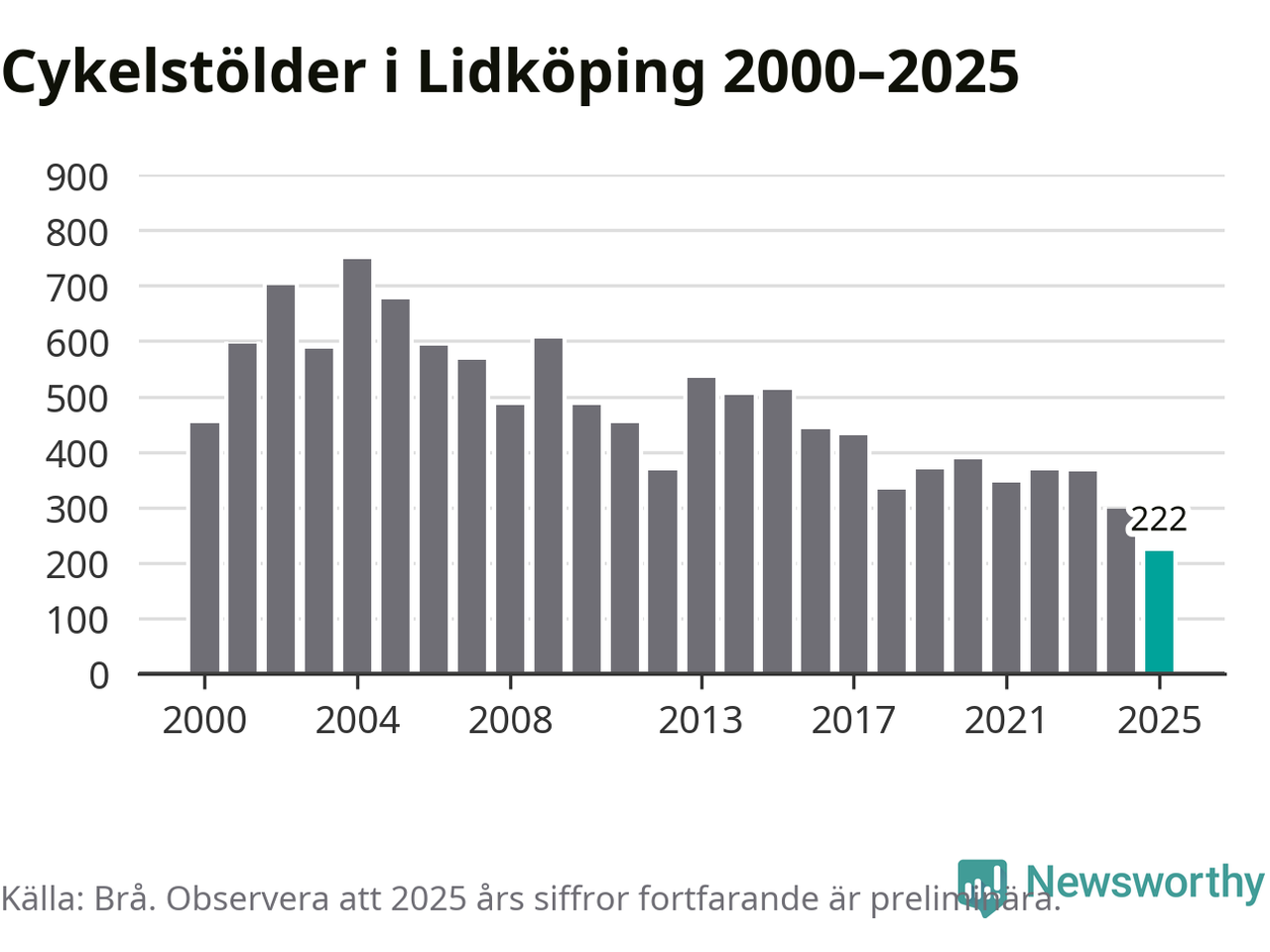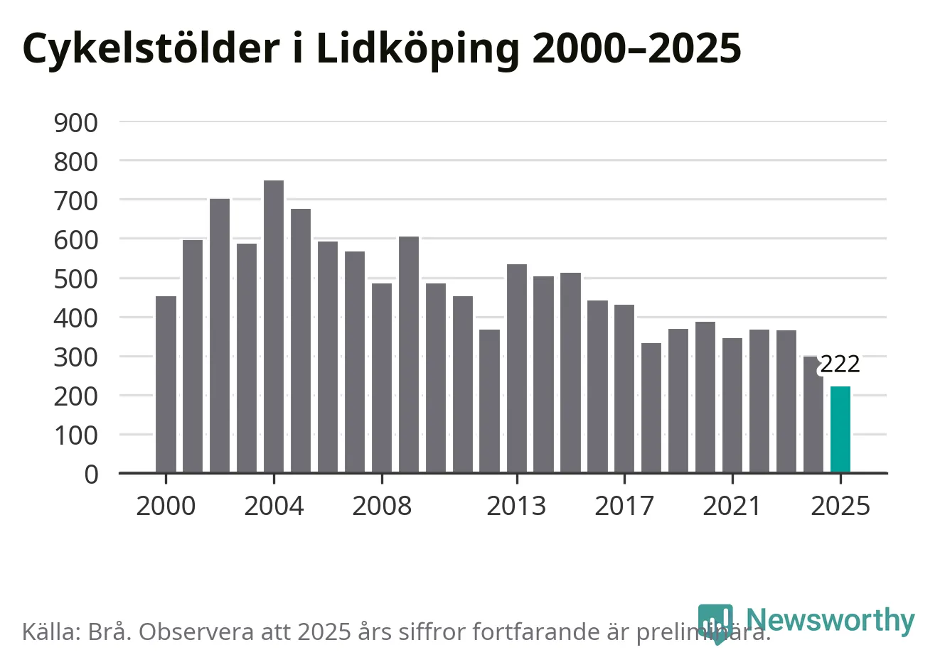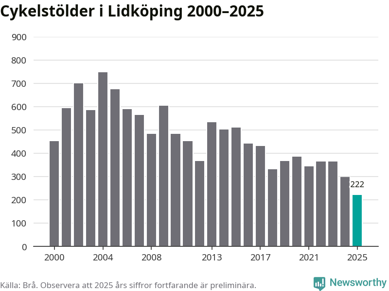 I Lidköpings kommun noterades det lägsta antalet cykelstölder under hela 2000-talet år 2025, även om det fortfarande är preliminära siffror. Under de senaste 25 åren har det som mest anmälts 748 cykelstölder på ett år (2004).