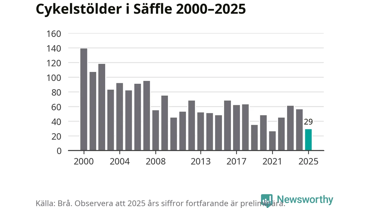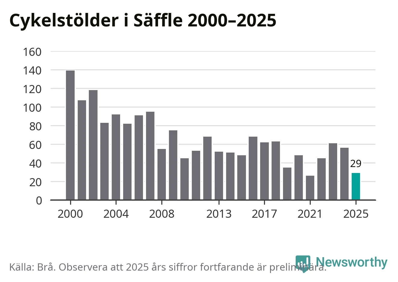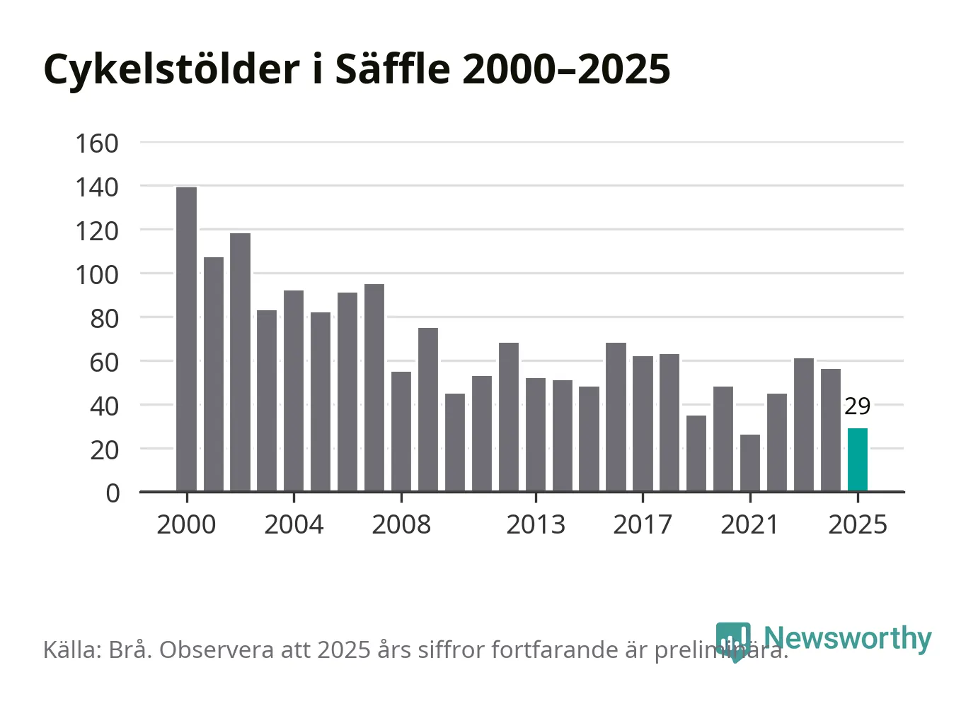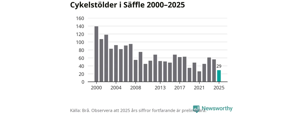I Säffle kommun var antalet cykelstölder relativt få i en historisk kontext år 2025, även om det fortfarande är preliminära siffror. Under de senaste 25 åren har det som mest anmälts 139 cykelstölder på ett år (2000), som minst 26 stycken (2021).