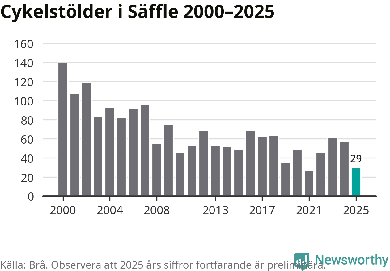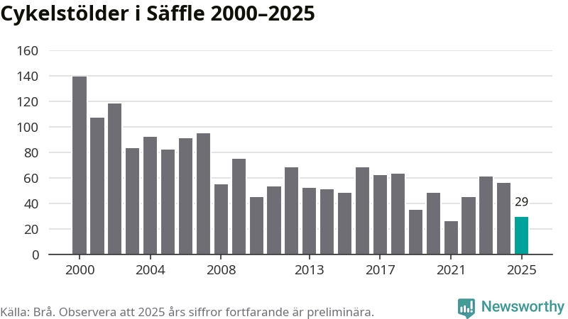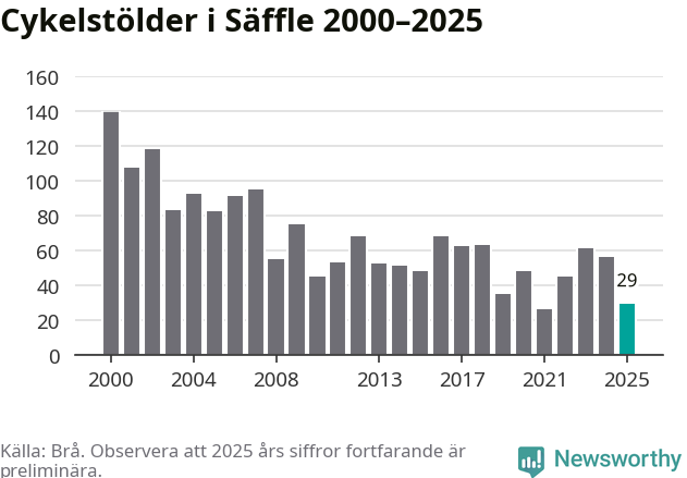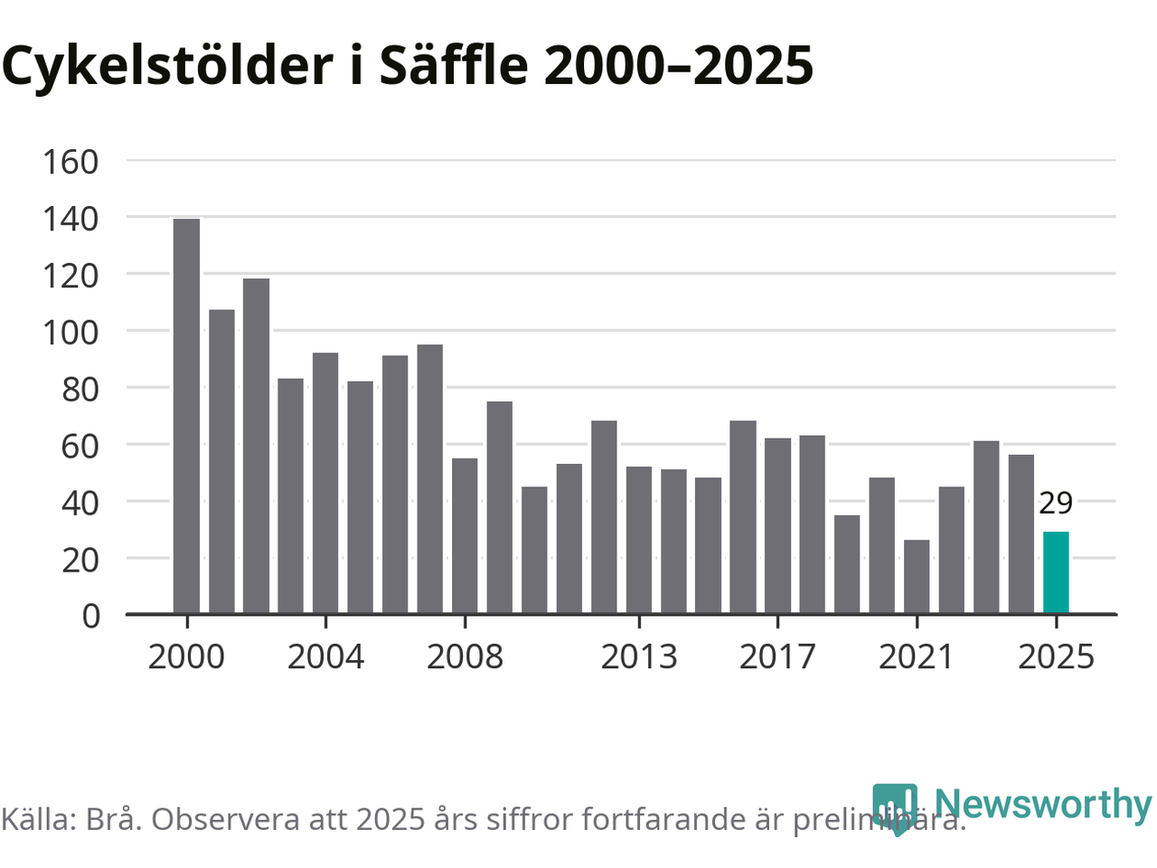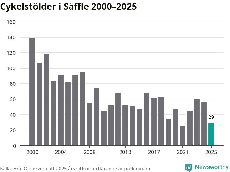 I Säffle kommun var antalet cykelstölder relativt få i en historisk kontext år 2025, även om det fortfarande är preliminära siffror. Under de senaste 25 åren har det som mest anmälts 139 cykelstölder på ett år (2000), som minst 26 stycken (2021).