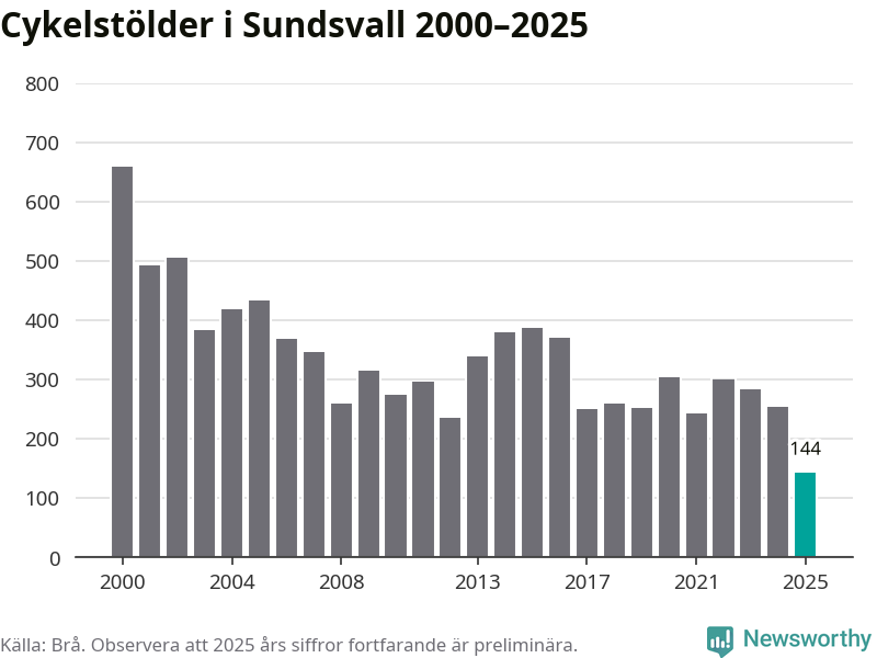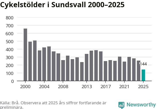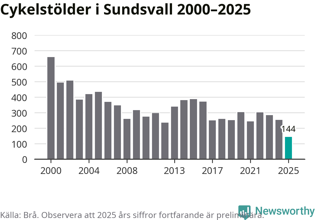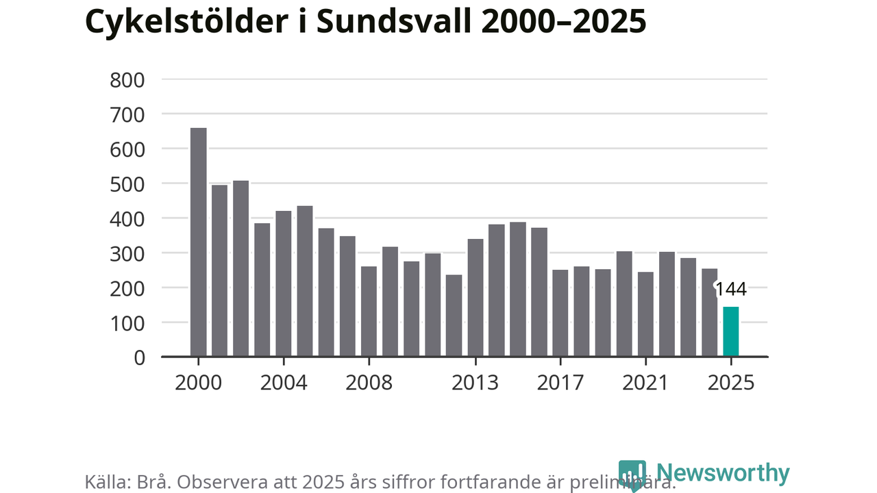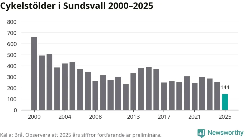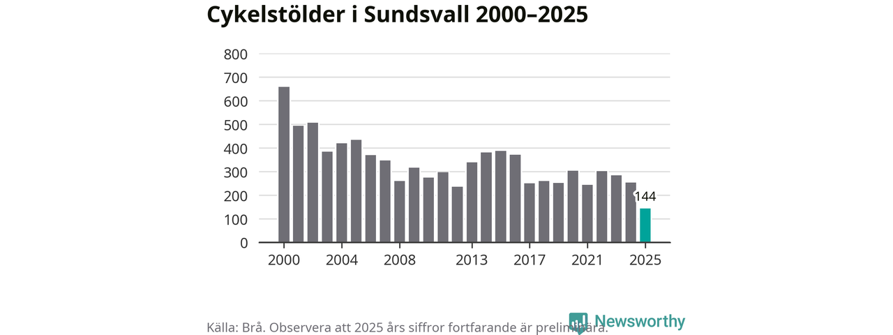 I Sundsvalls kommun noterades det lägsta antalet cykelstölder under hela 2000-talet år 2025, även om det fortfarande är preliminära siffror. Under de senaste 25 åren har det som mest anmälts 659 cykelstölder på ett år (2000).