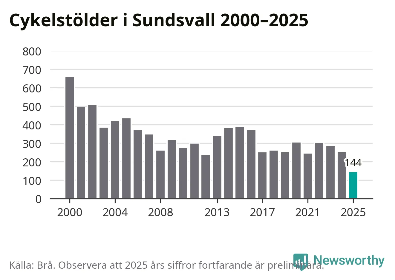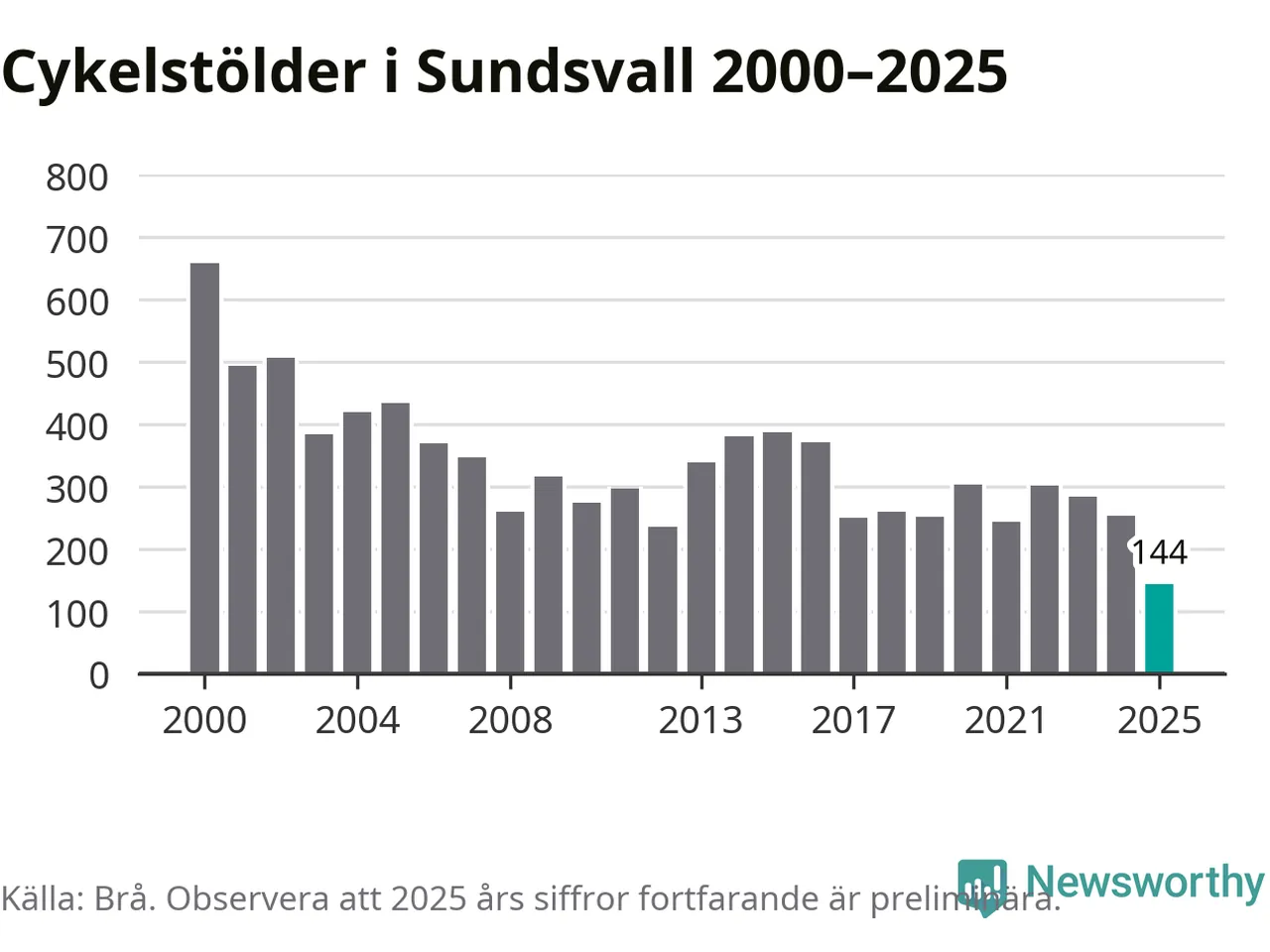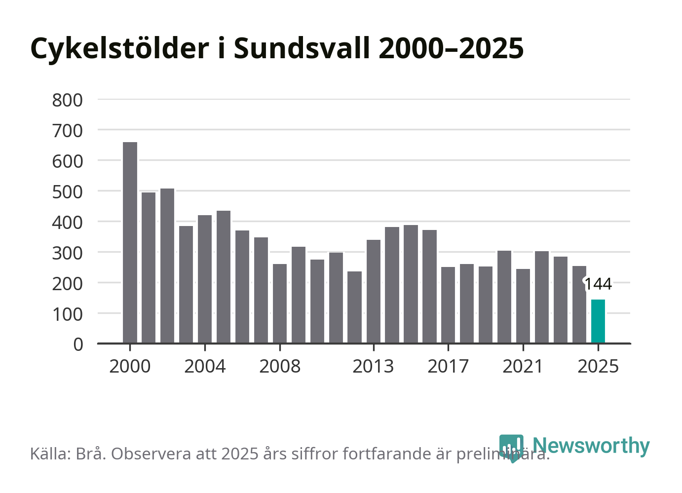I Sundsvalls kommun noterades det lägsta antalet cykelstölder under hela 2000-talet år 2025, även om det fortfarande är preliminära siffror. Under de senaste 25 åren har det som mest anmälts 659 cykelstölder på ett år (2000).