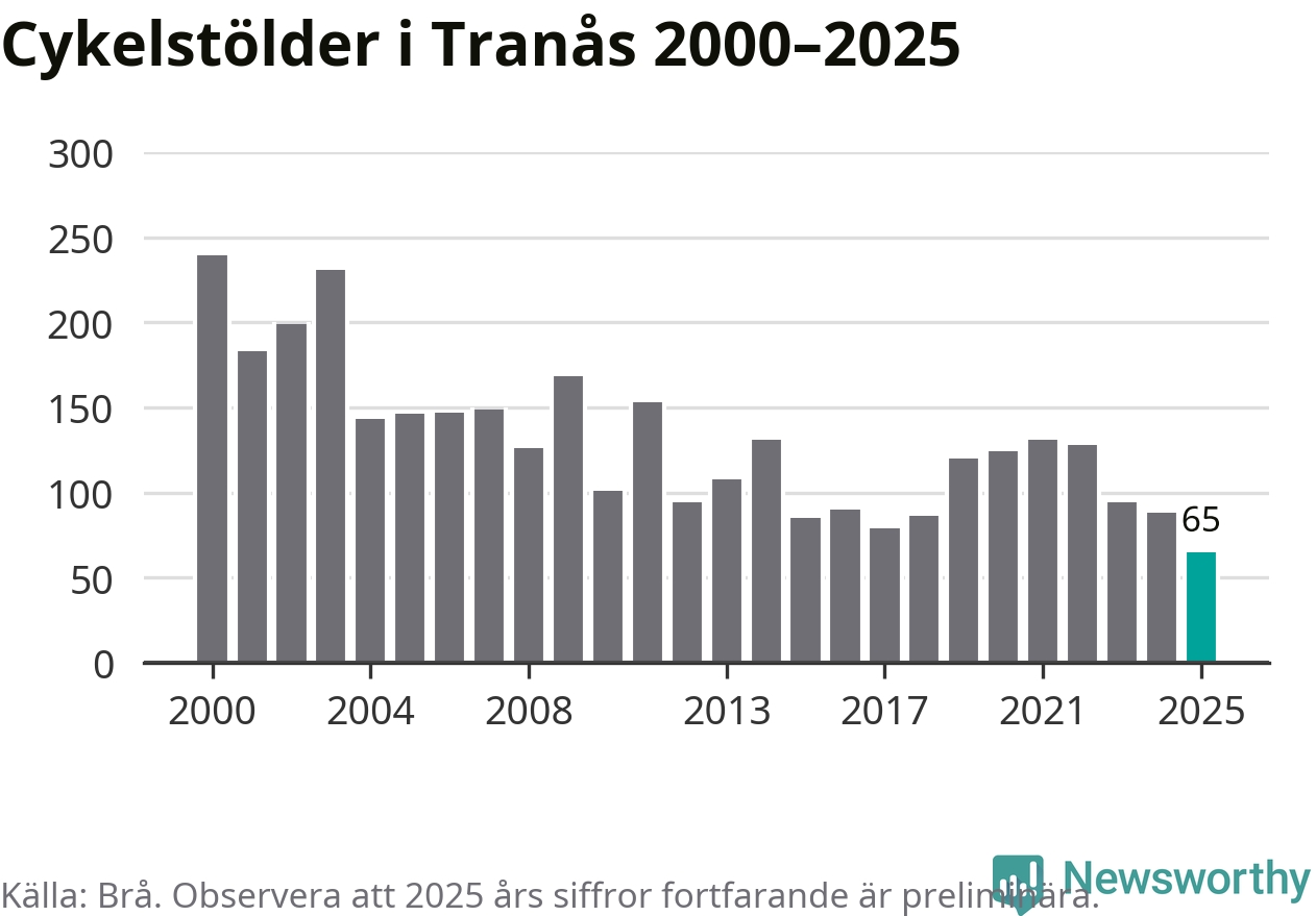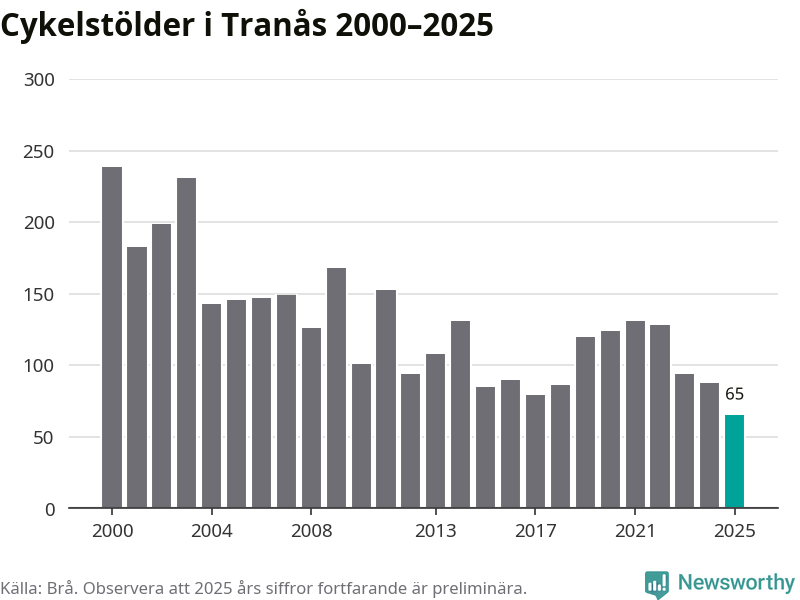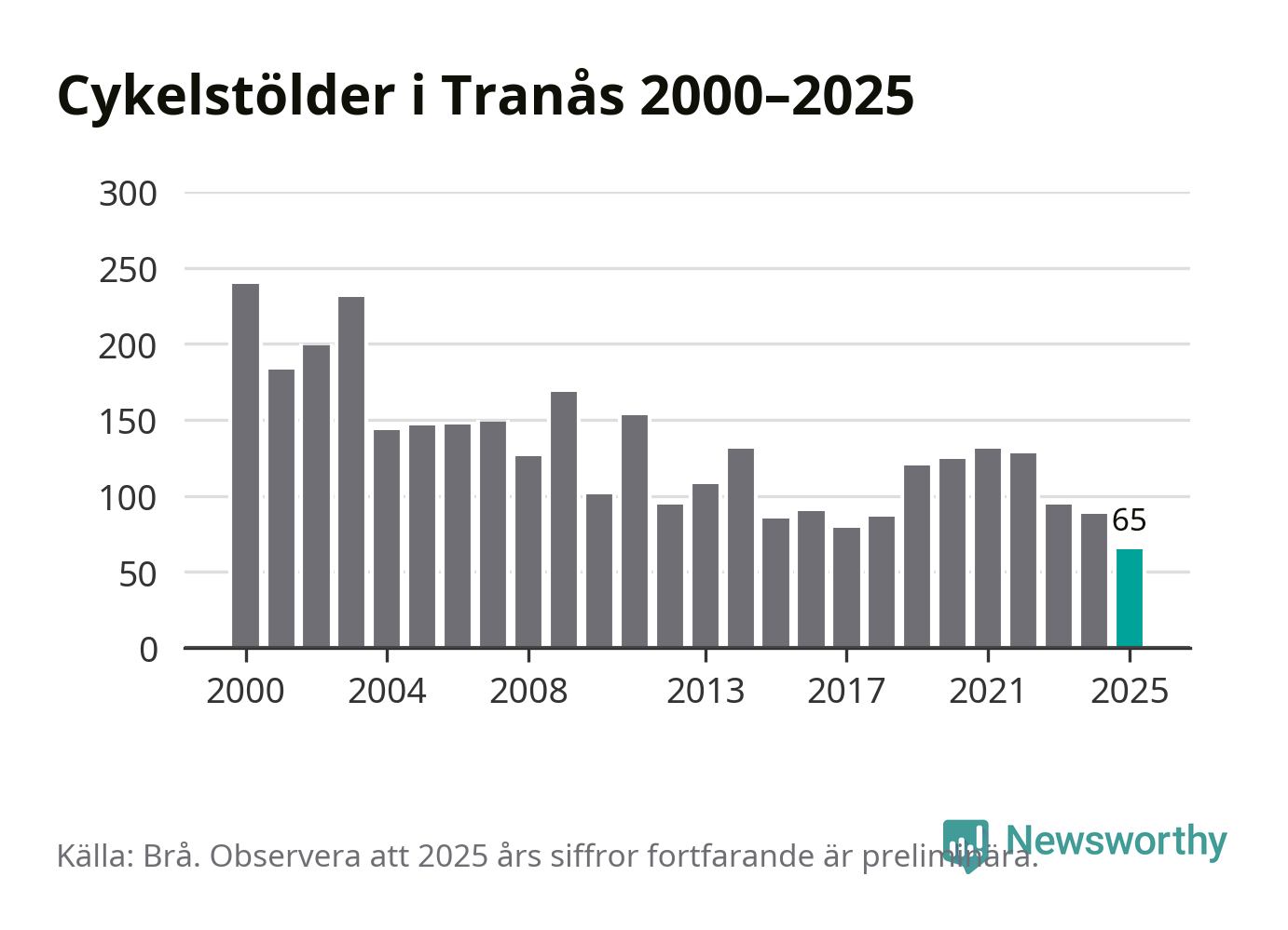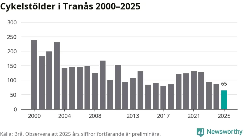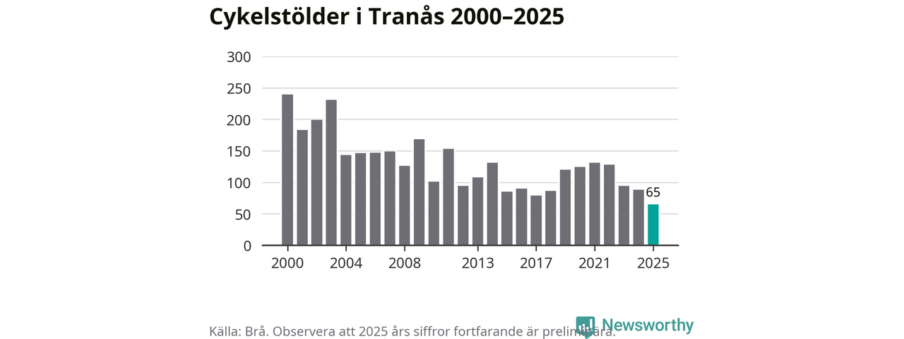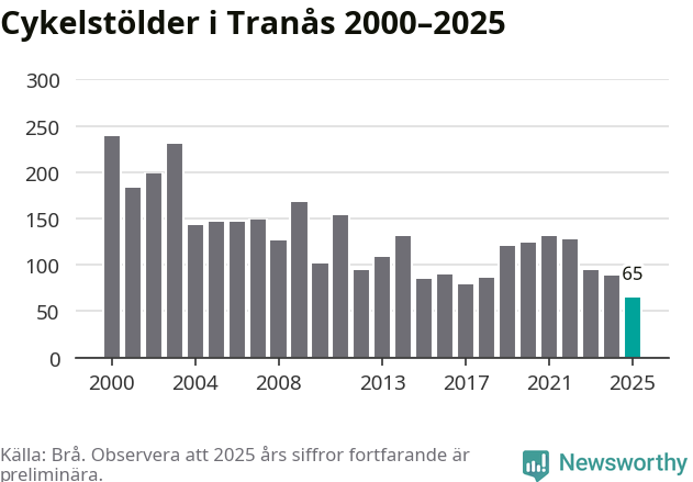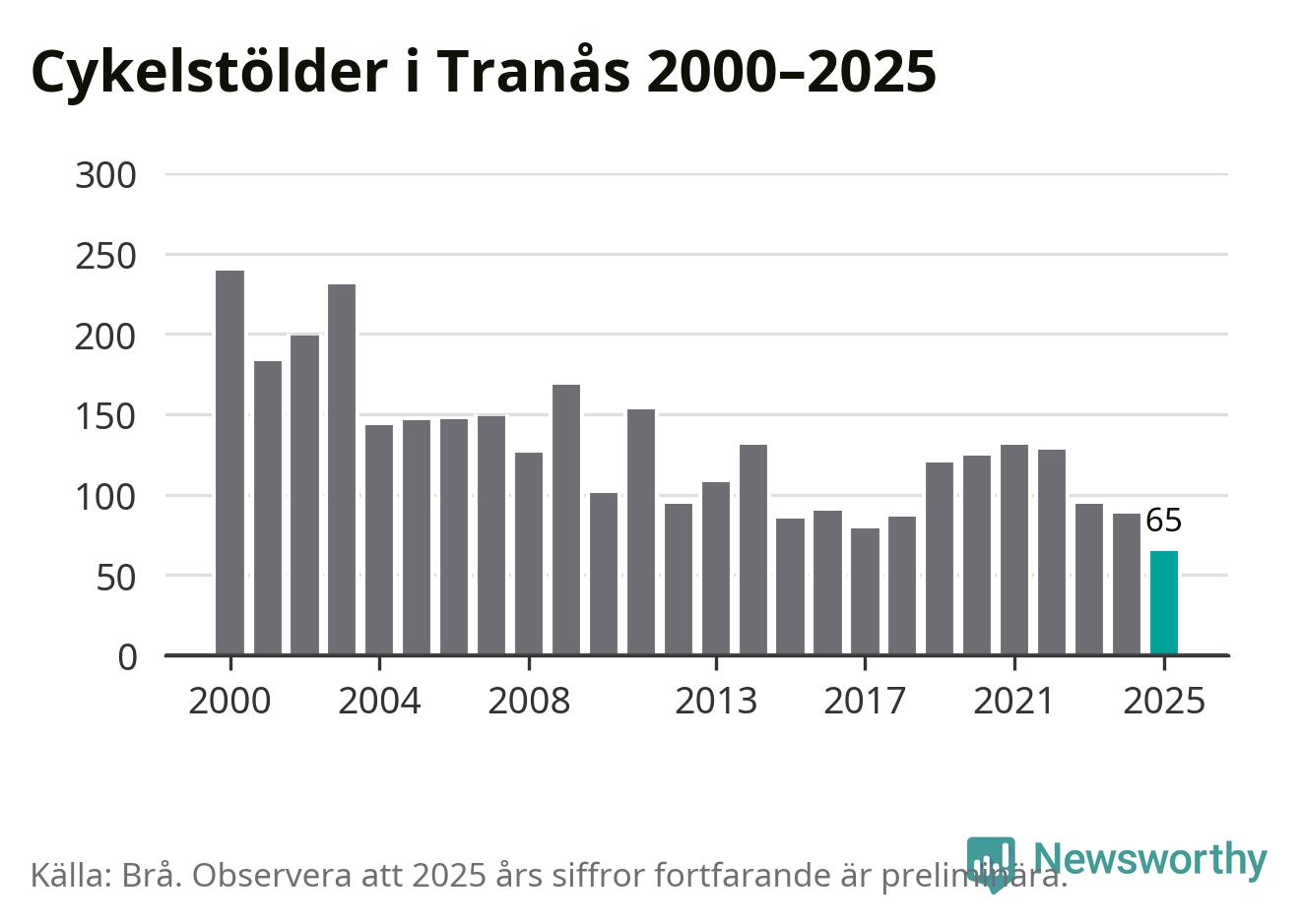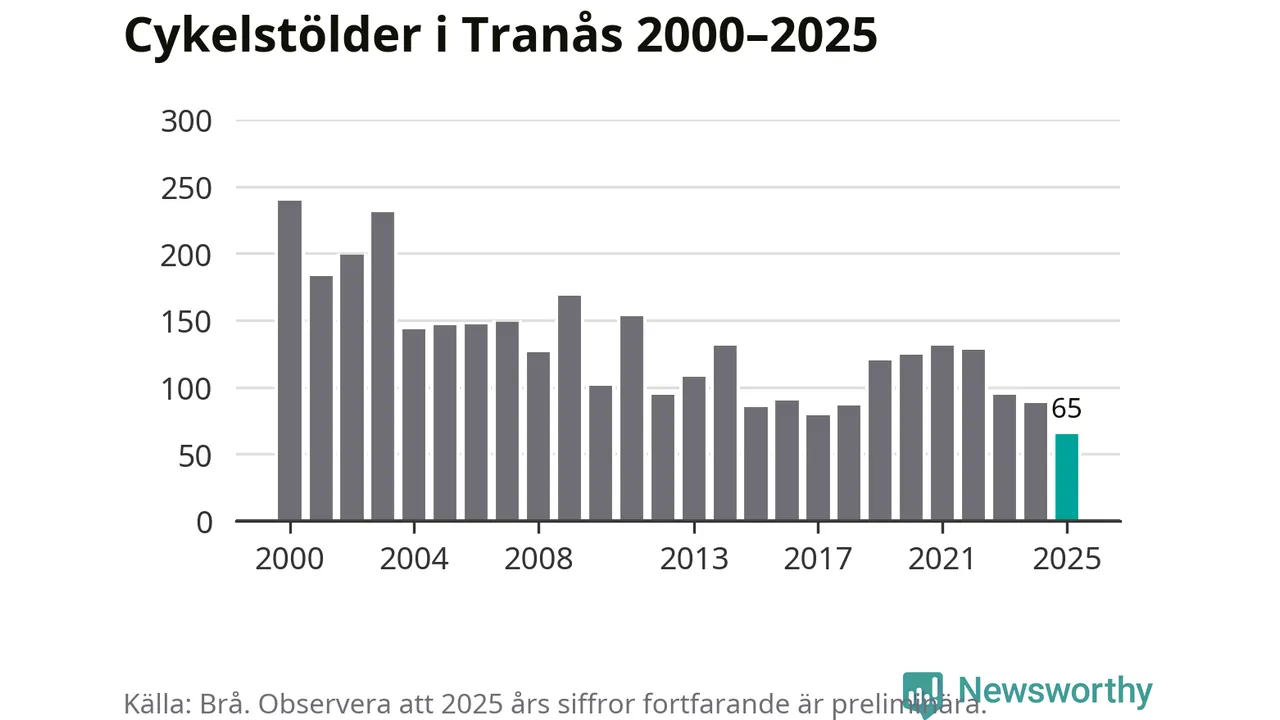 I Tranås kommun noterades det lägsta antalet cykelstölder under hela 2000-talet år 2025, även om det fortfarande är preliminära siffror. Under de senaste 25 åren har det som mest anmälts 239 cykelstölder på ett år (2000).