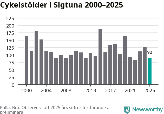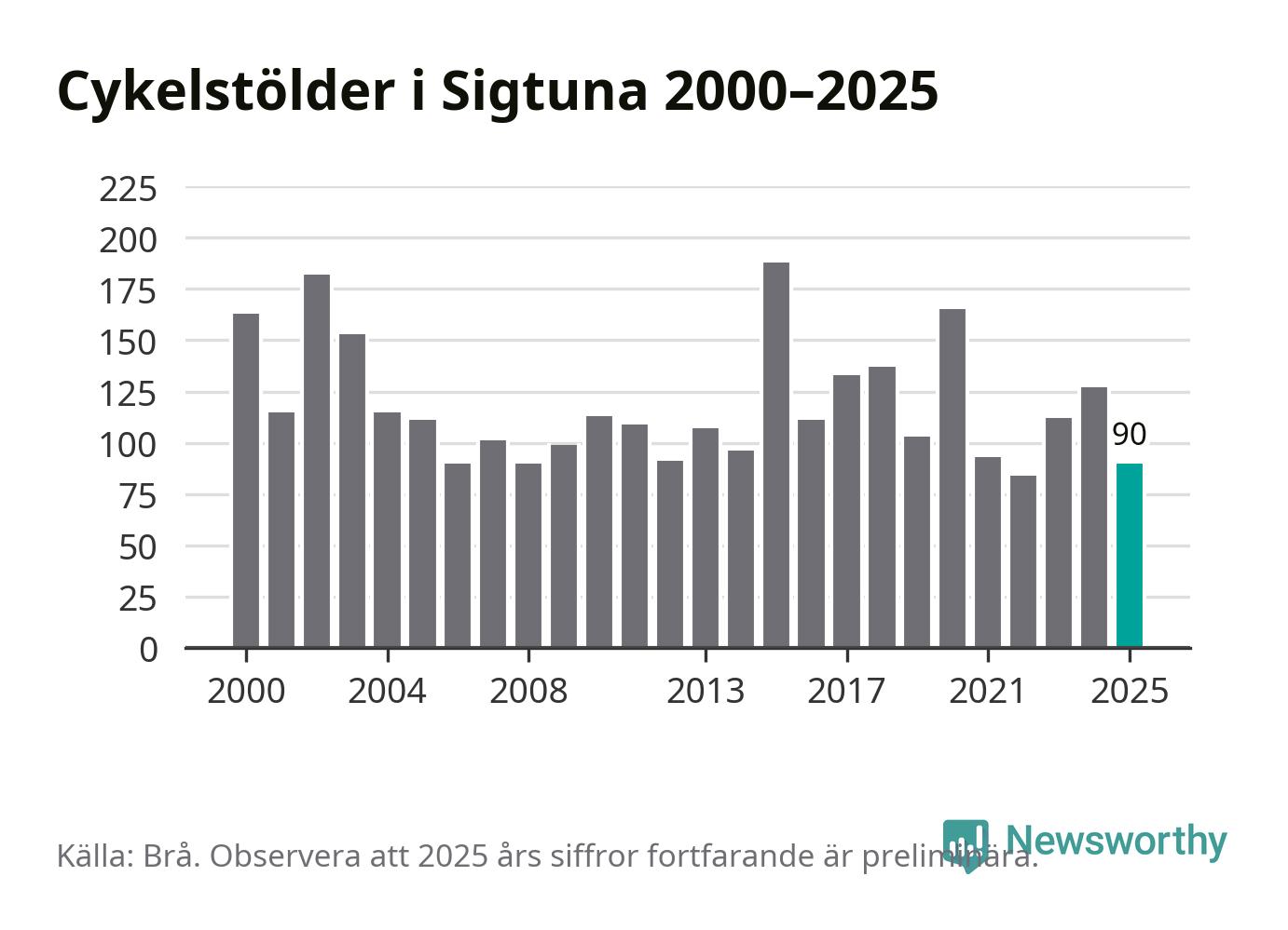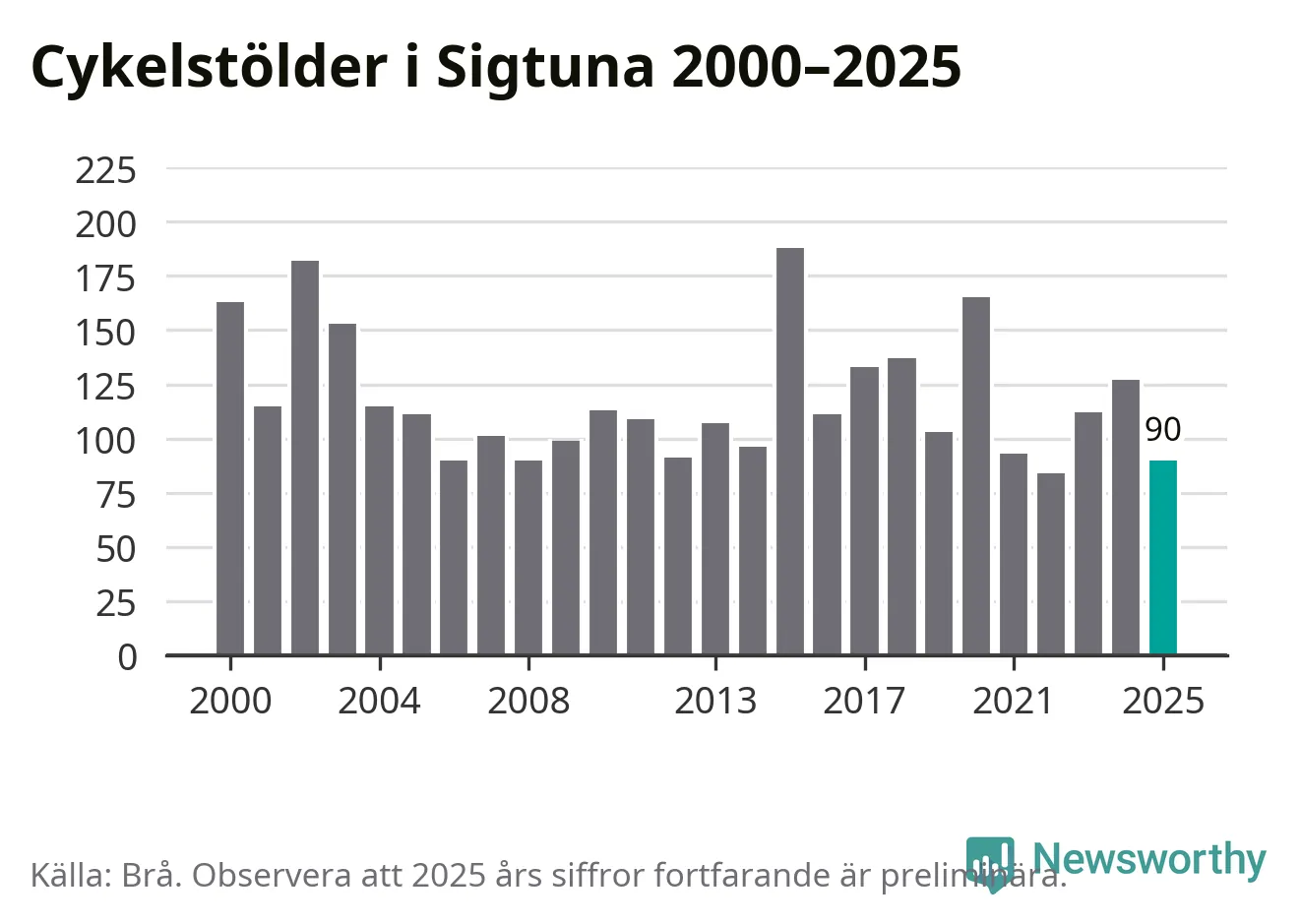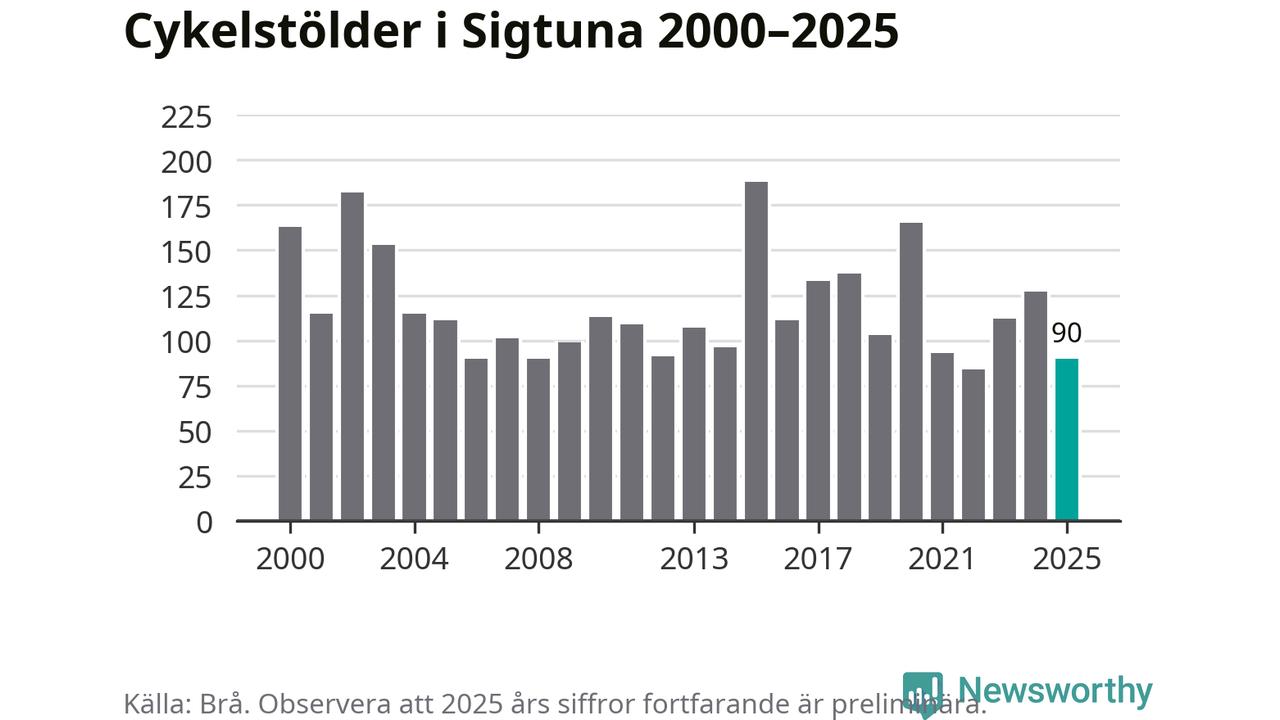 I Sigtuna kommun var antalet cykelstölder relativt få i en historisk kontext år 2025, även om det fortfarande är preliminära siffror. Under de senaste 25 åren har det som mest anmälts 188 cykelstölder på ett år (2015), som minst 84 stycken (2022).