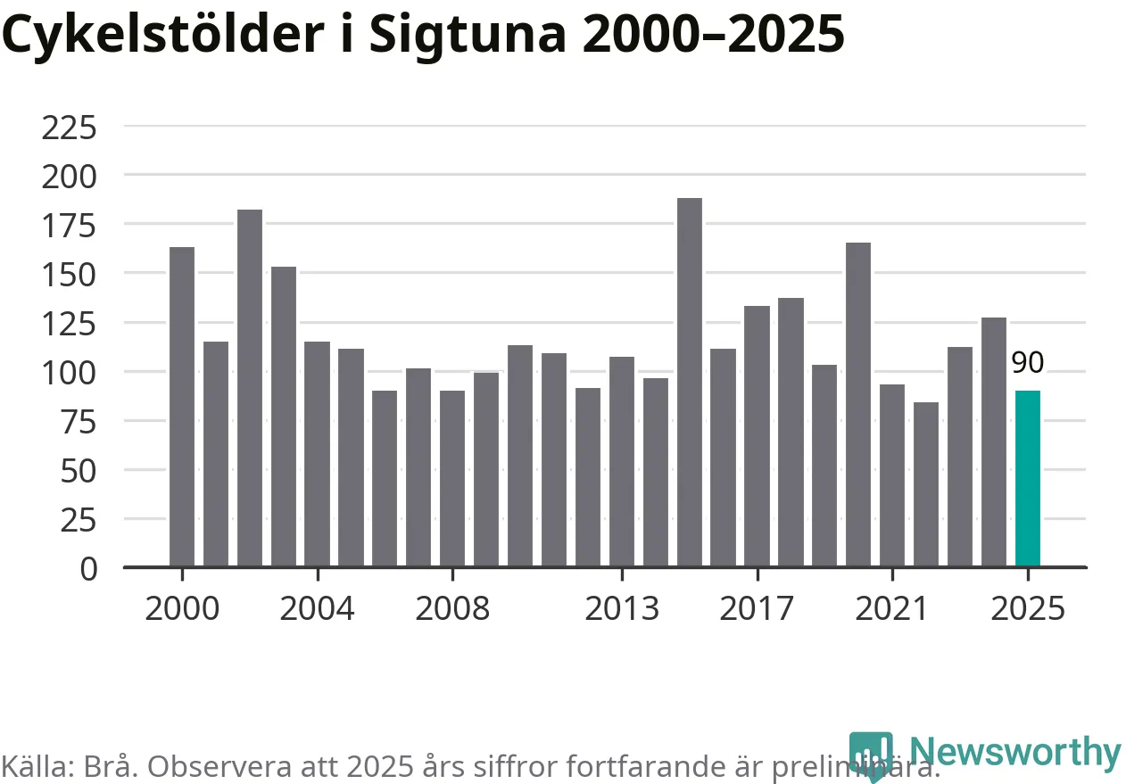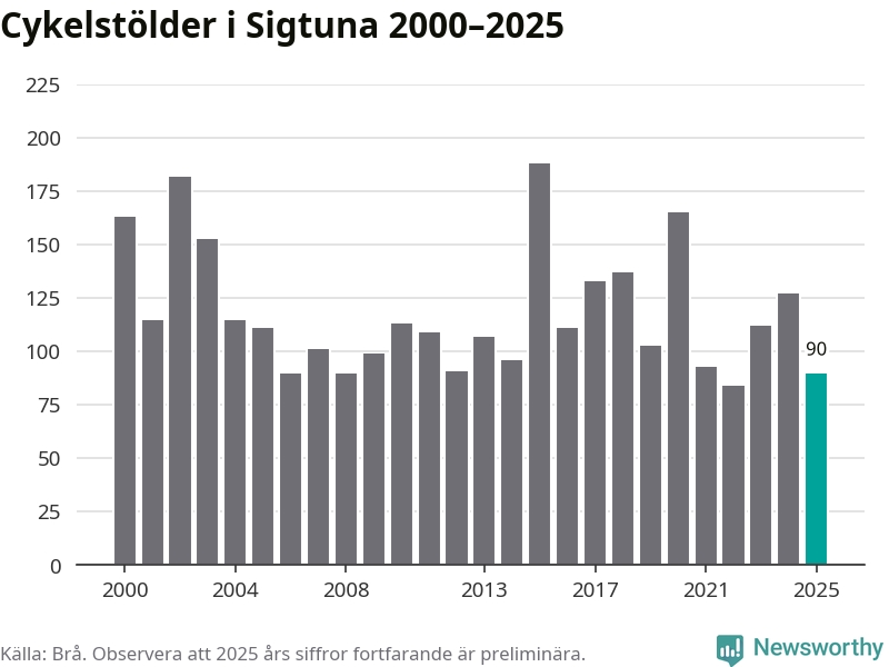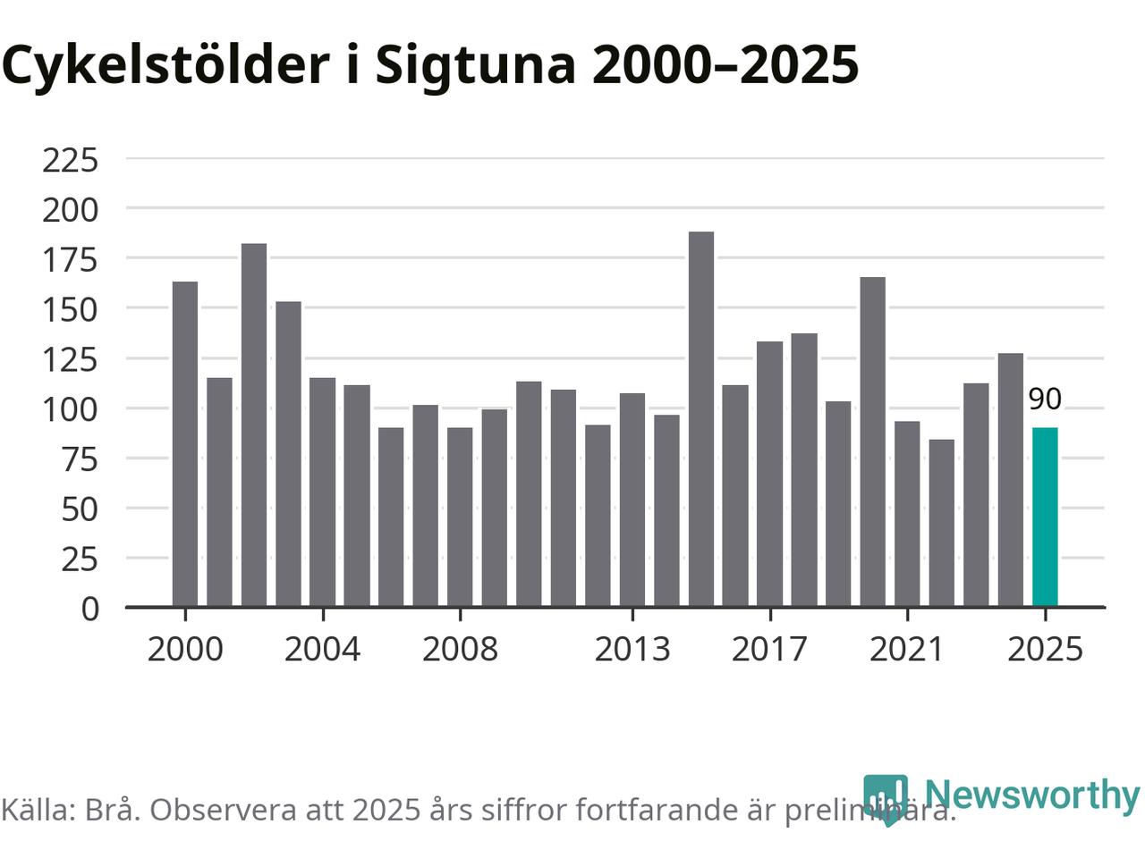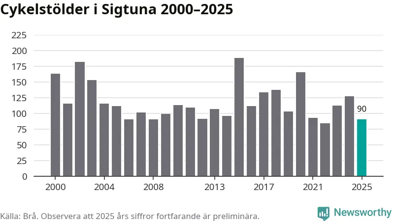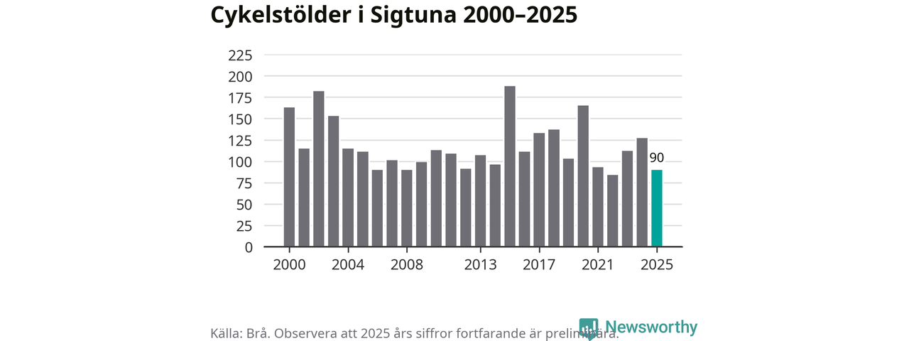 I Sigtuna kommun var antalet cykelstölder relativt få i en historisk kontext år 2025, även om det fortfarande är preliminära siffror. Under de senaste 25 åren har det som mest anmälts 188 cykelstölder på ett år (2015), som minst 84 stycken (2022).