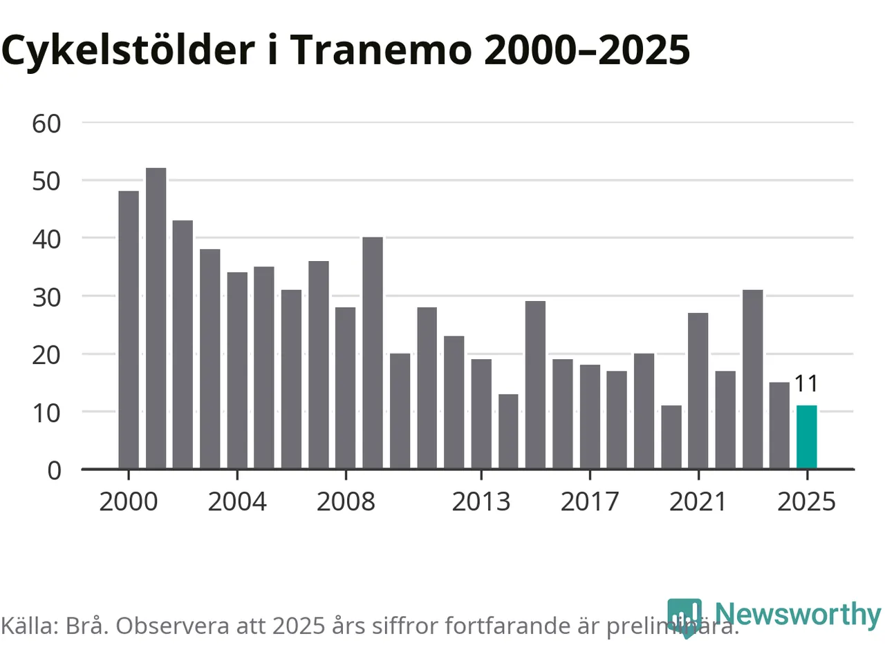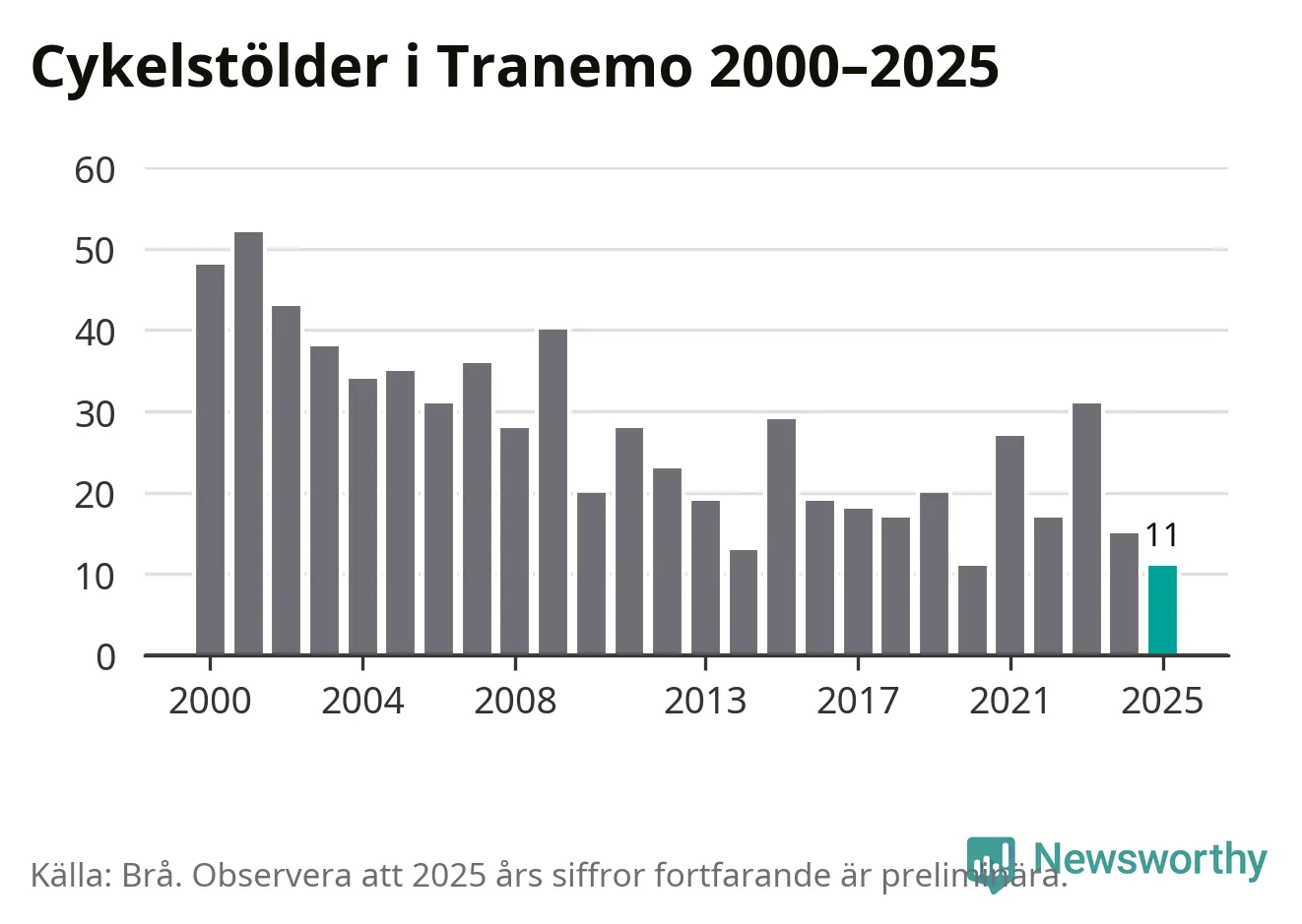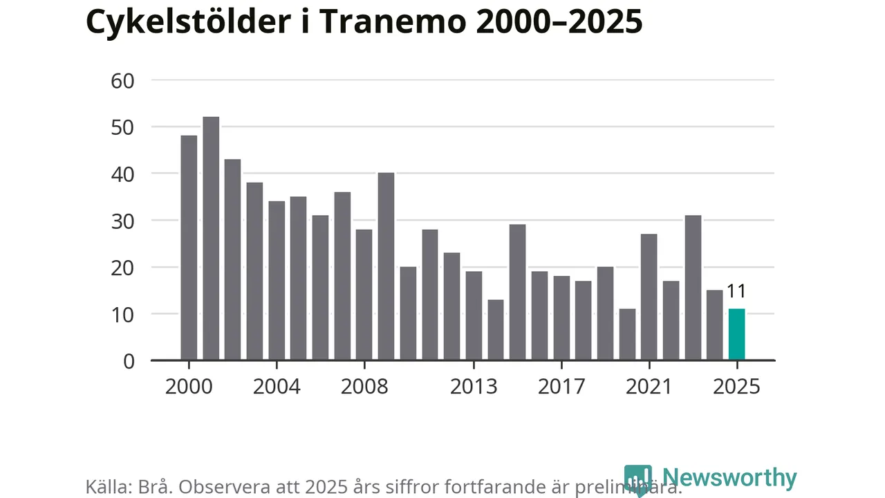 I Tranemo kommun noterades det lägsta antalet cykelstölder under hela 2000-talet år 2025, även om det fortfarande är preliminära siffror. Under de senaste 25 åren har det som mest anmälts 52 cykelstölder på ett år (2001).