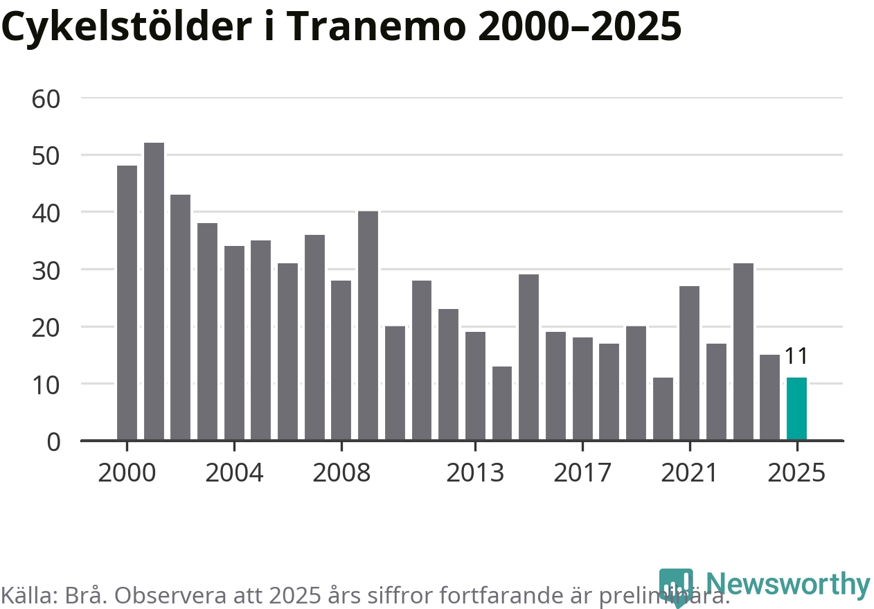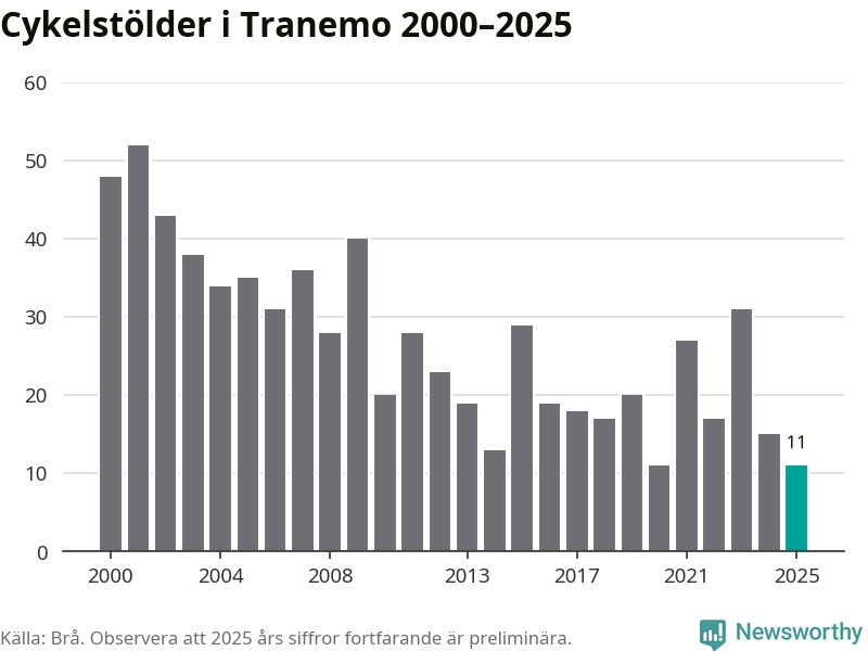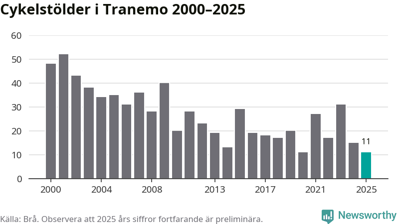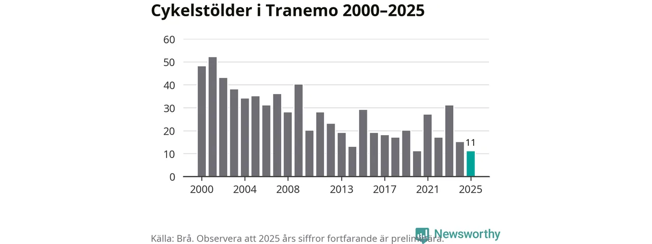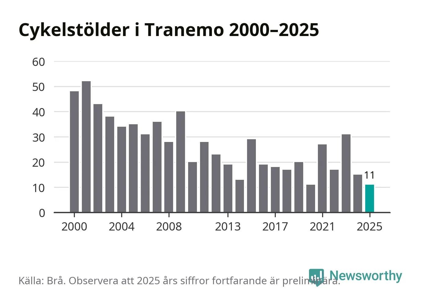 I Tranemo kommun noterades det lägsta antalet cykelstölder under hela 2000-talet år 2025, även om det fortfarande är preliminära siffror. Under de senaste 25 åren har det som mest anmälts 52 cykelstölder på ett år (2001).