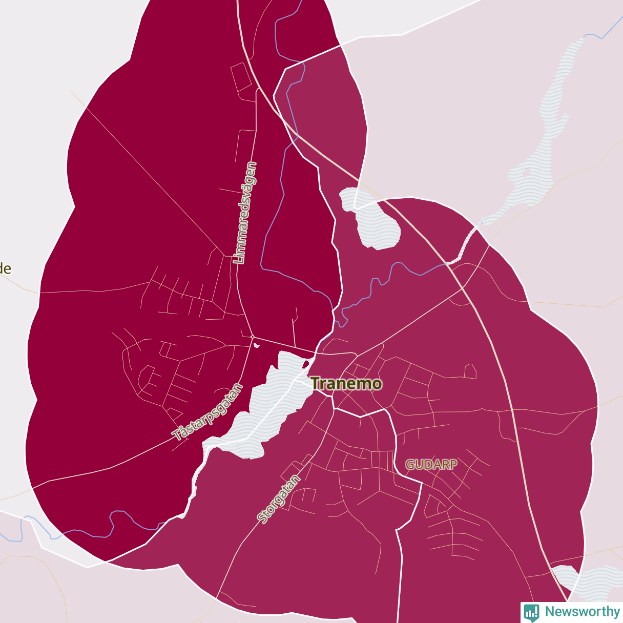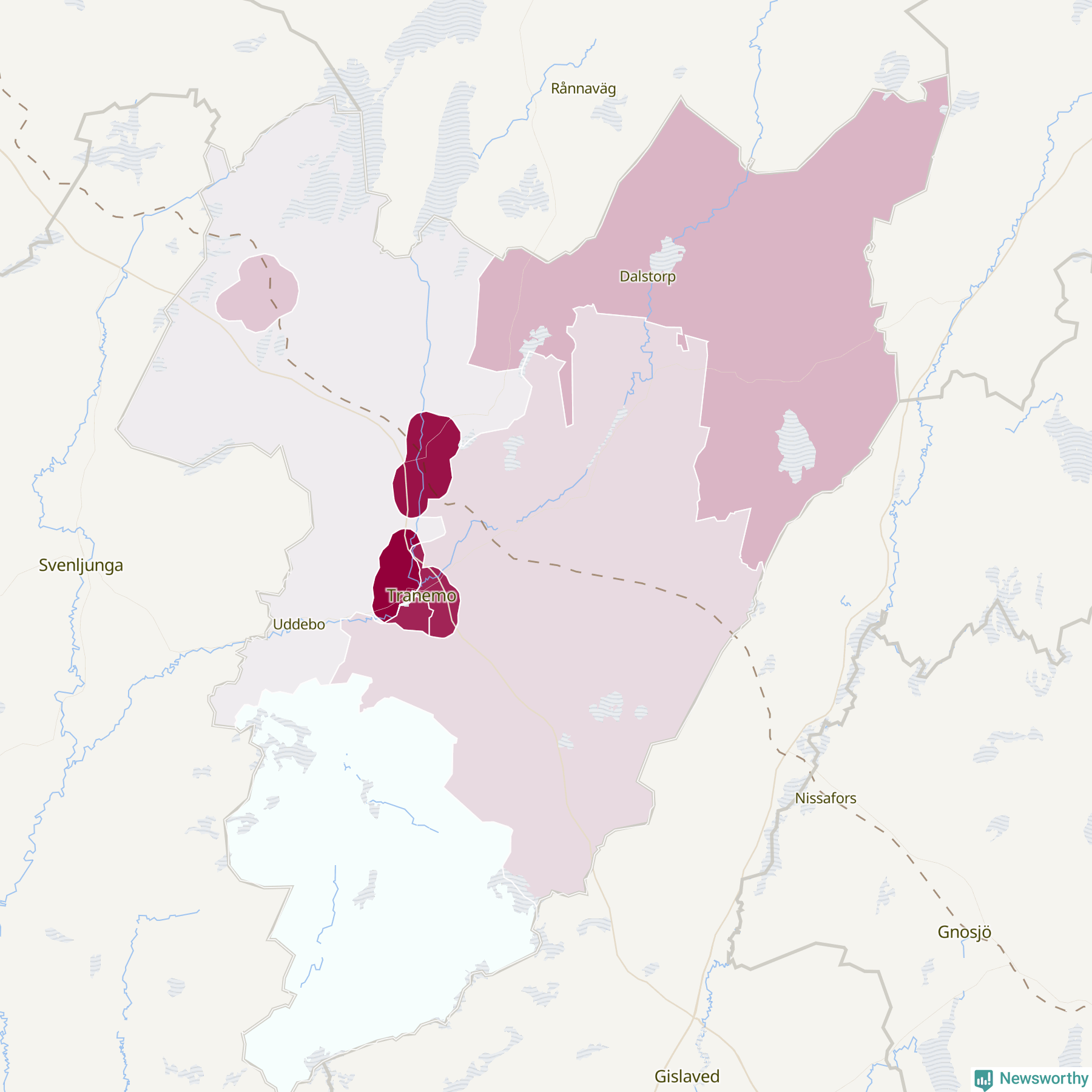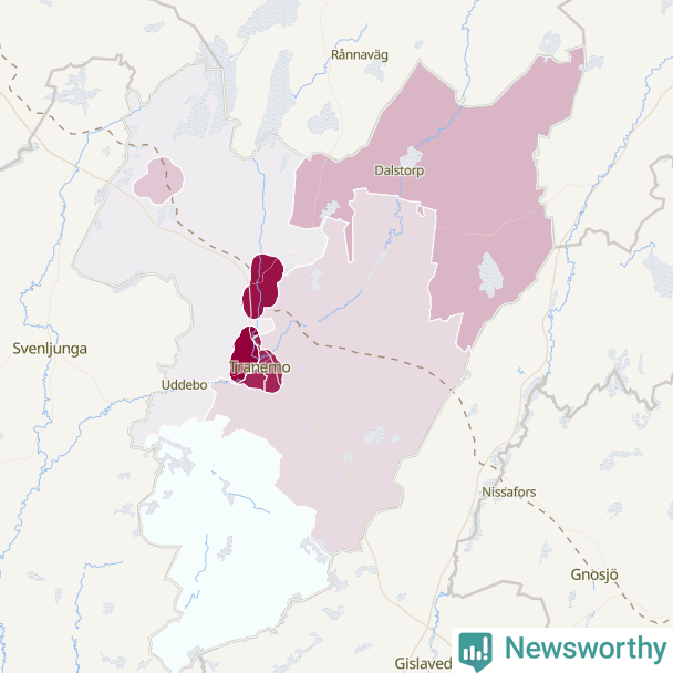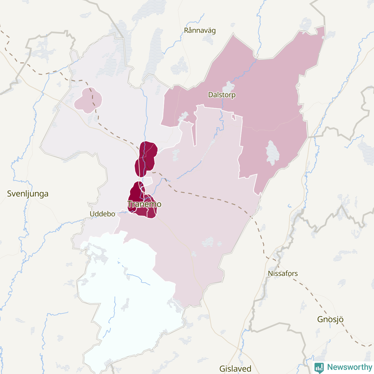 Skillnaderna mellan olika områden i Tranemo är relativt små. Det visar data för de senaste fem åren, som Newsworthy har begärt ut från polisen. De anmälda stölderna har kopplats till SCB:s nio statistiska områden i kommunen. Det rör sig om mellan en handfull och ett femtontal anmälda stölder per område.