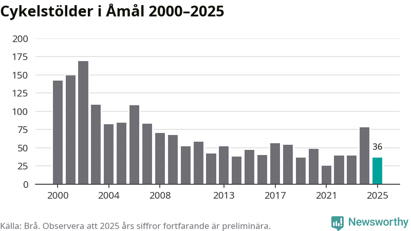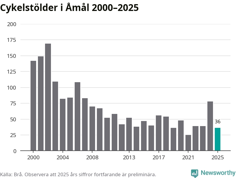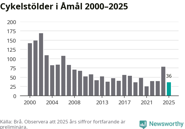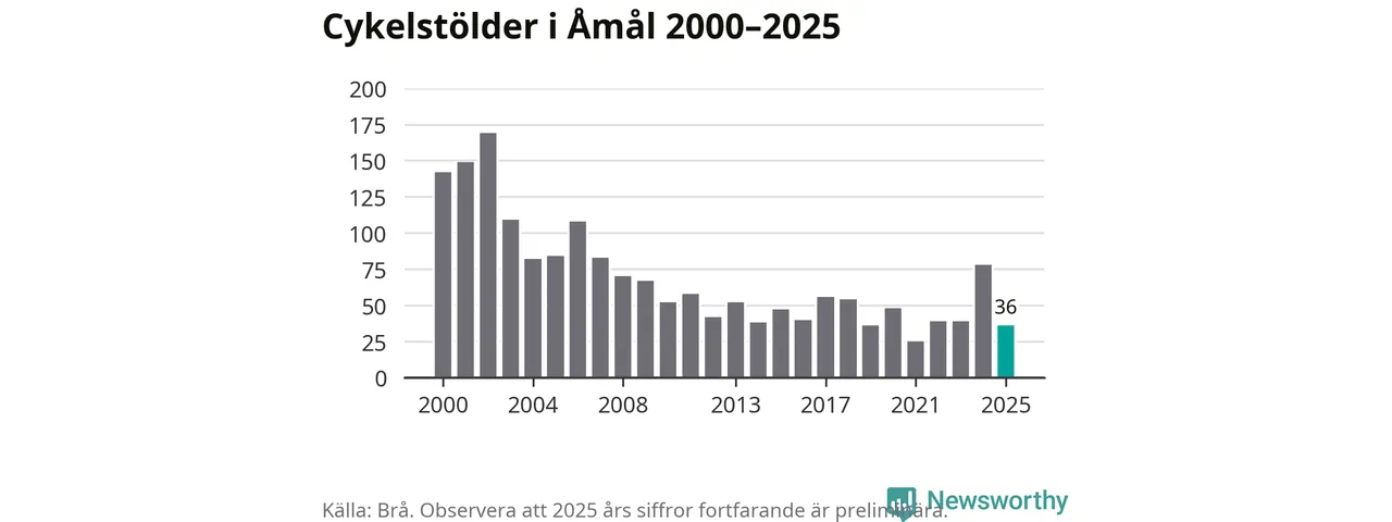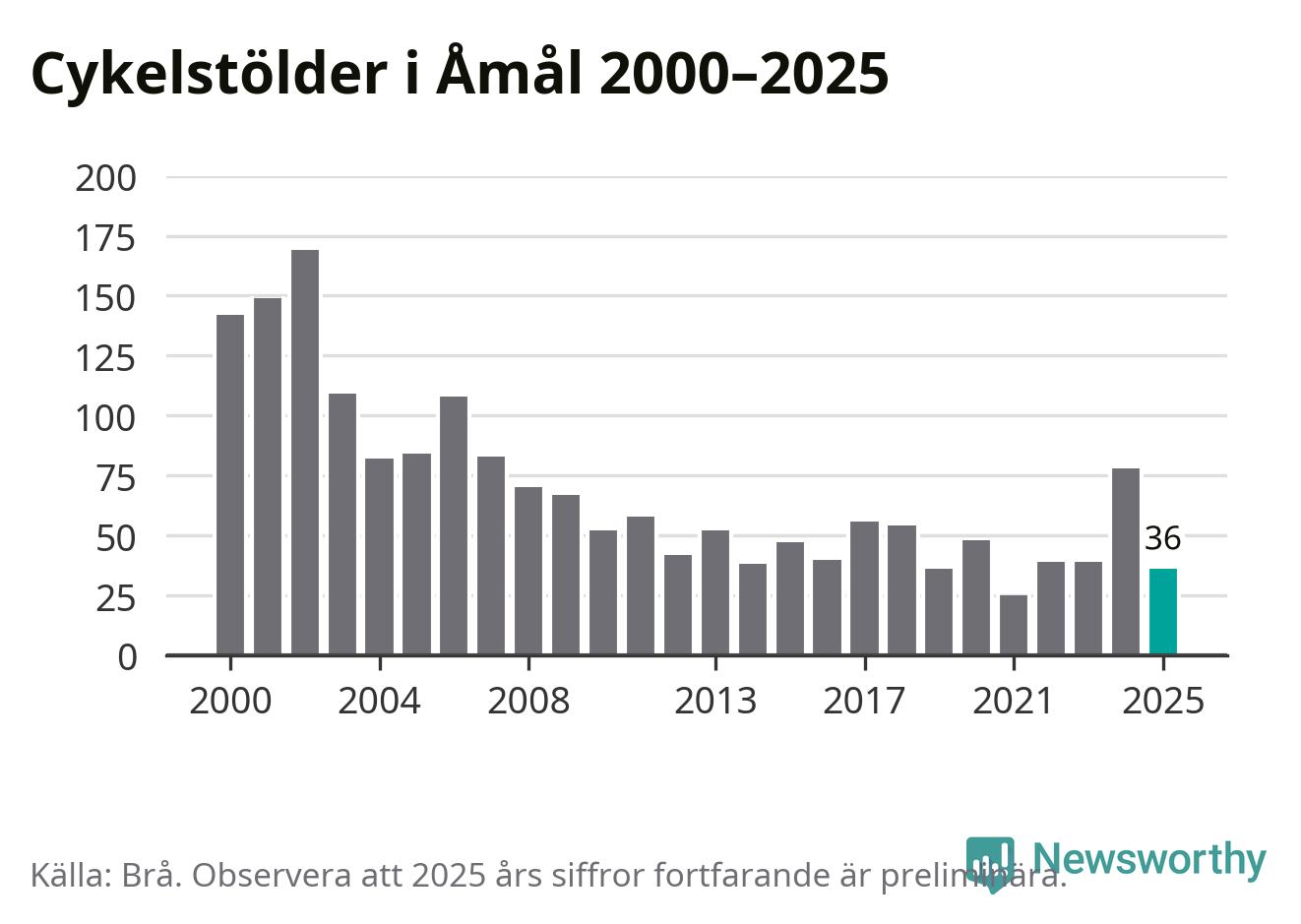 I Åmåls kommun var antalet cykelstölder relativt få i en historisk kontext år 2025, även om det fortfarande är preliminära siffror. Under de senaste 25 åren har det som mest anmälts 169 cykelstölder på ett år (2002), som minst 25 stycken (2021).