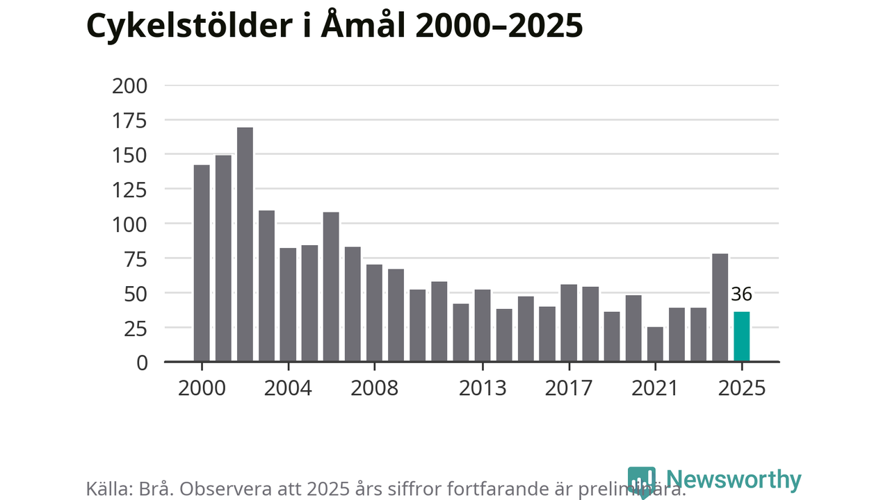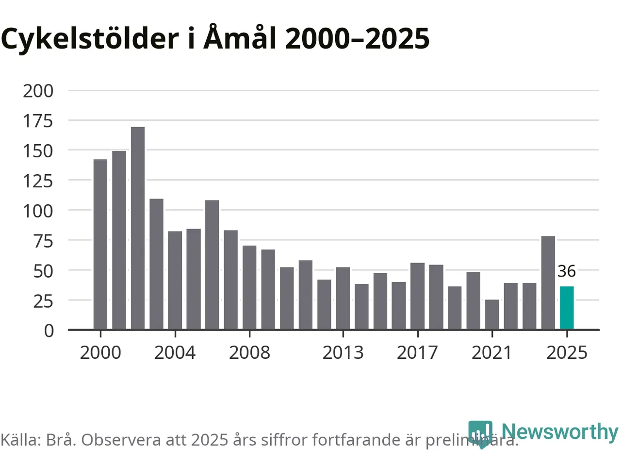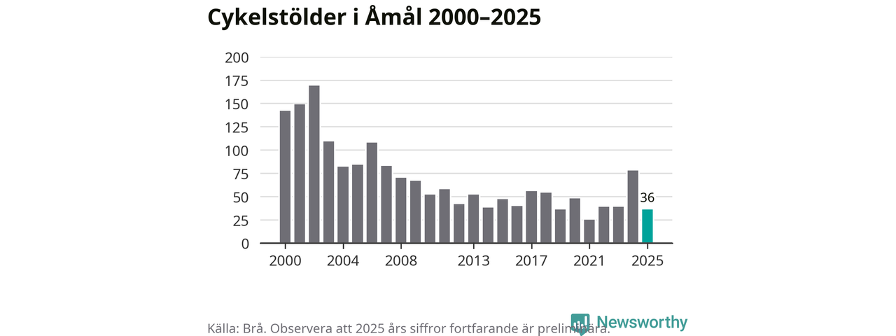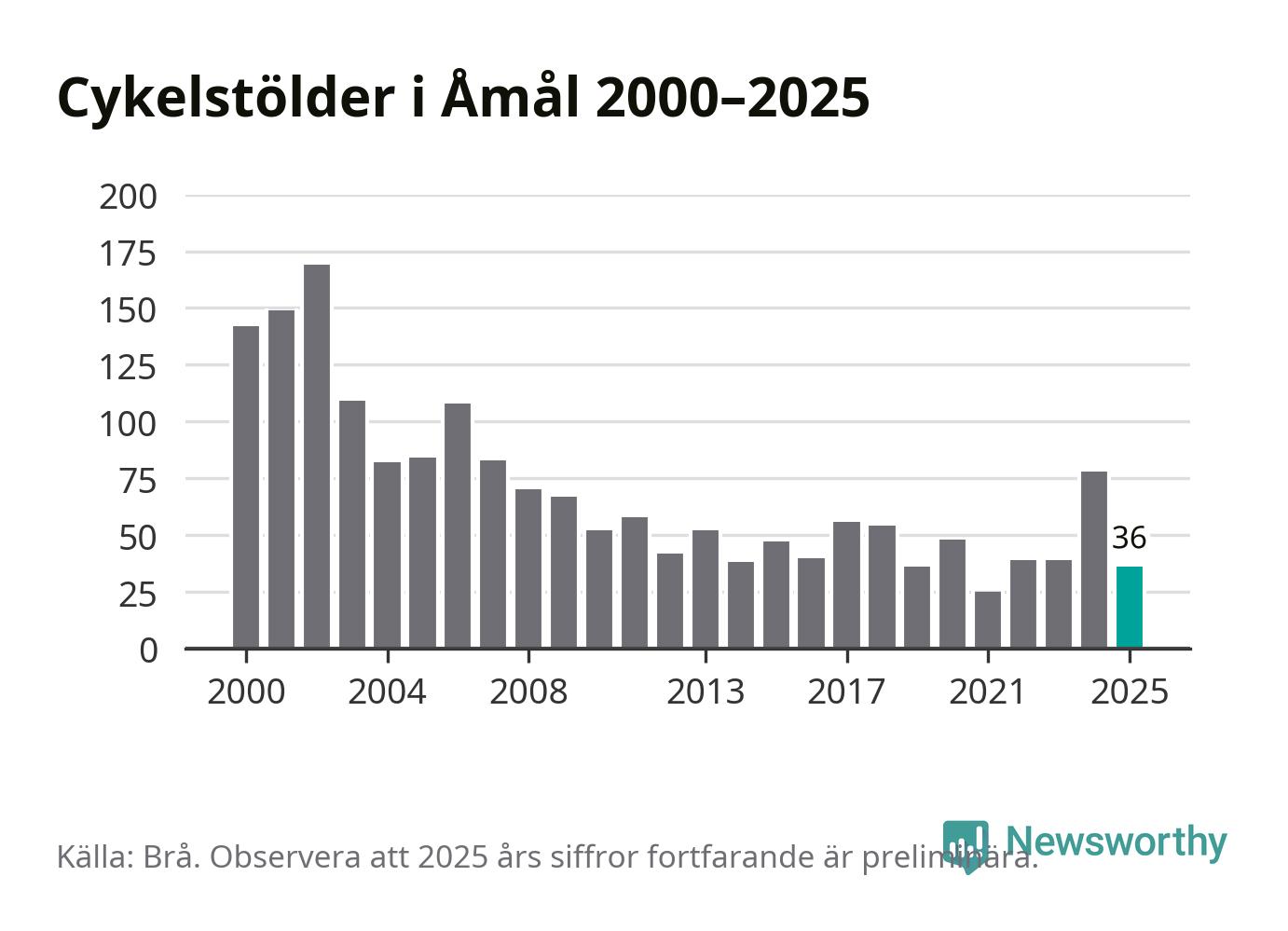 Av de 36 stöldanmälningar i Åmål 2025 gällde sex elcyklar, det motsvarar 17 procent. Brå särredovisar elcyklar sedan 2020 och i riket som helhet ökade anmälningarna om stulna elcyklar kraftigt de första åren, för att de senaste tre åren ha legat relativt stilla. Eftersom antalet cykelstölder totalt har minskat under samma tid har andelen elcyklar ökat. I fjol stod elcyklar för 28 procent av alla anmälda cykelstölder i landet.