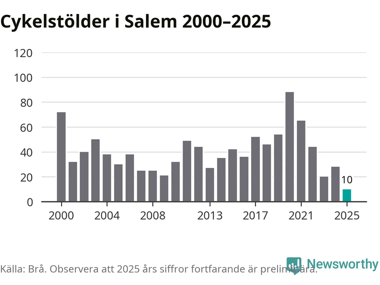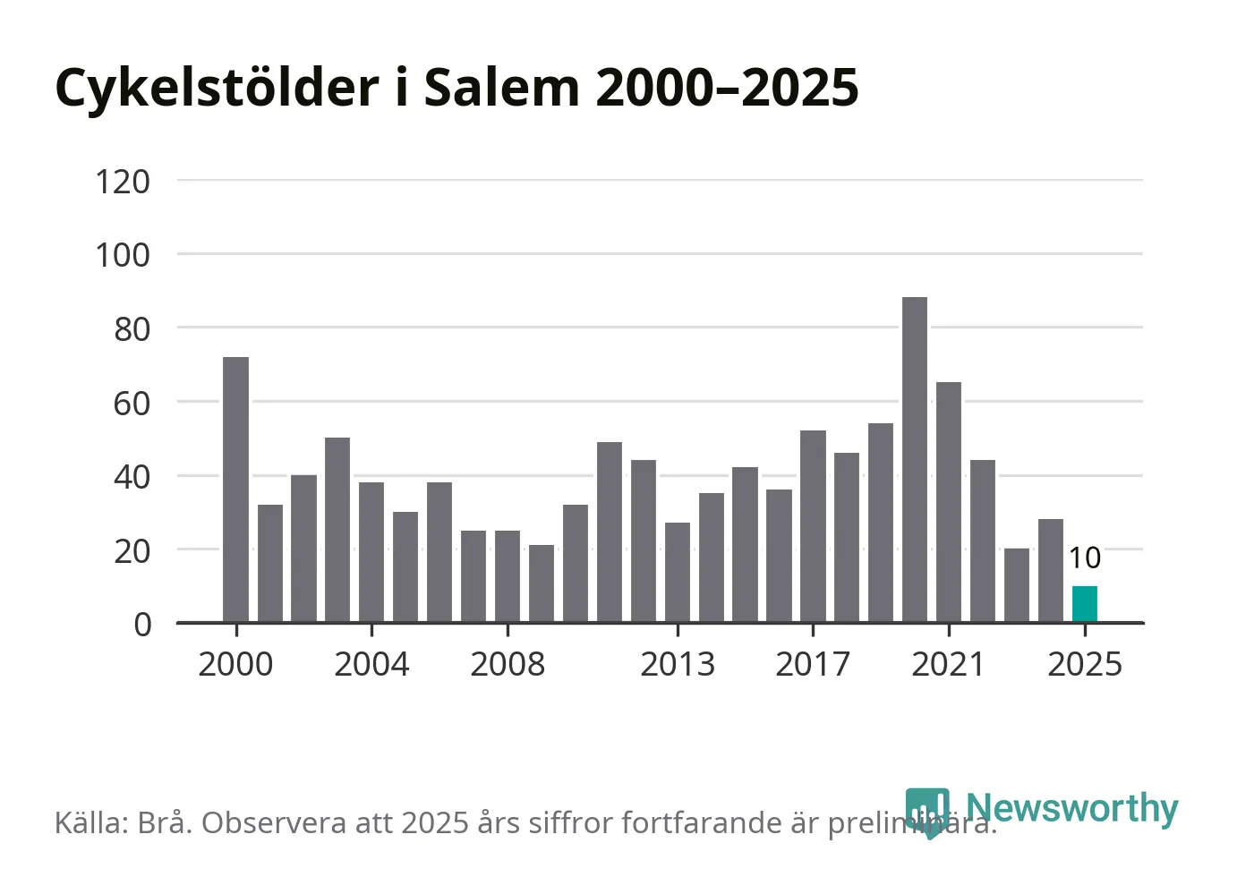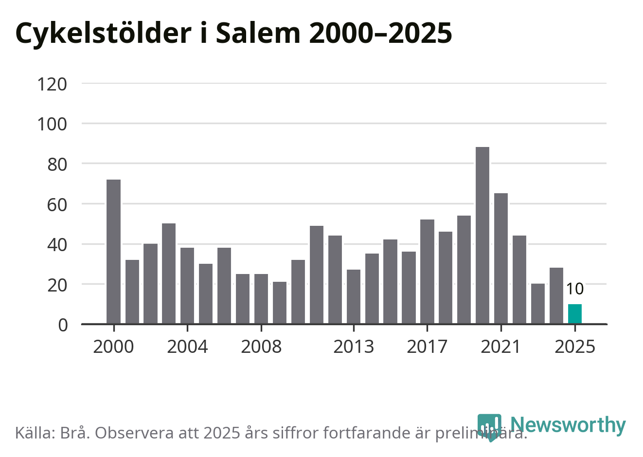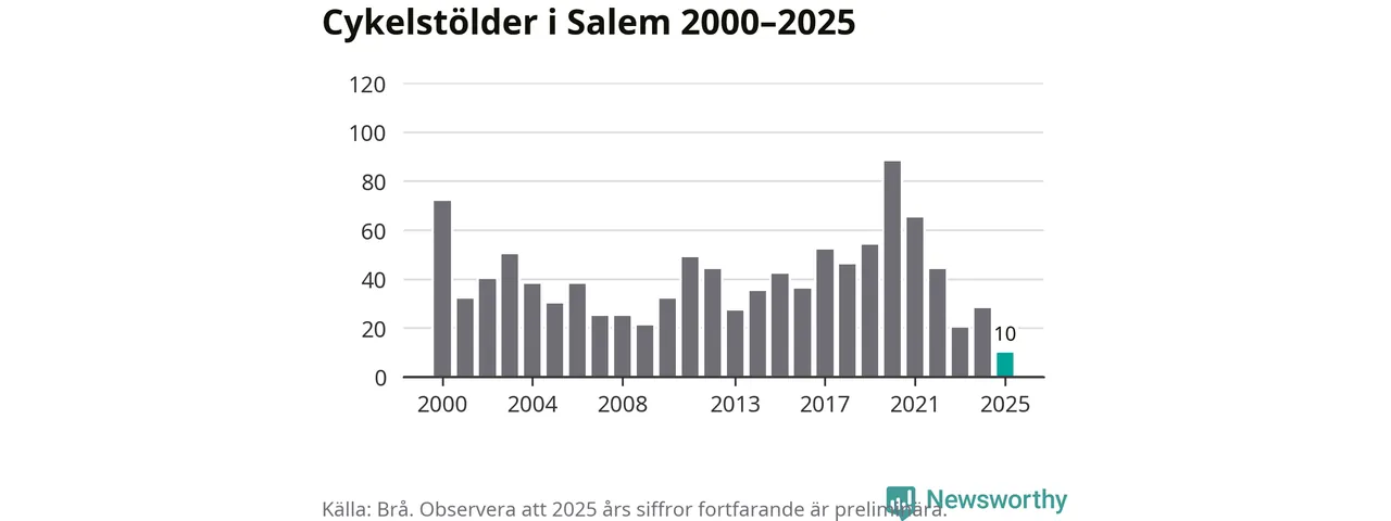 I Salems kommun noterades det lägsta antalet cykelstölder under hela 2000-talet år 2025, även om det fortfarande är preliminära siffror. Under de senaste 25 åren har det som mest anmälts 88 cykelstölder på ett år (2020).