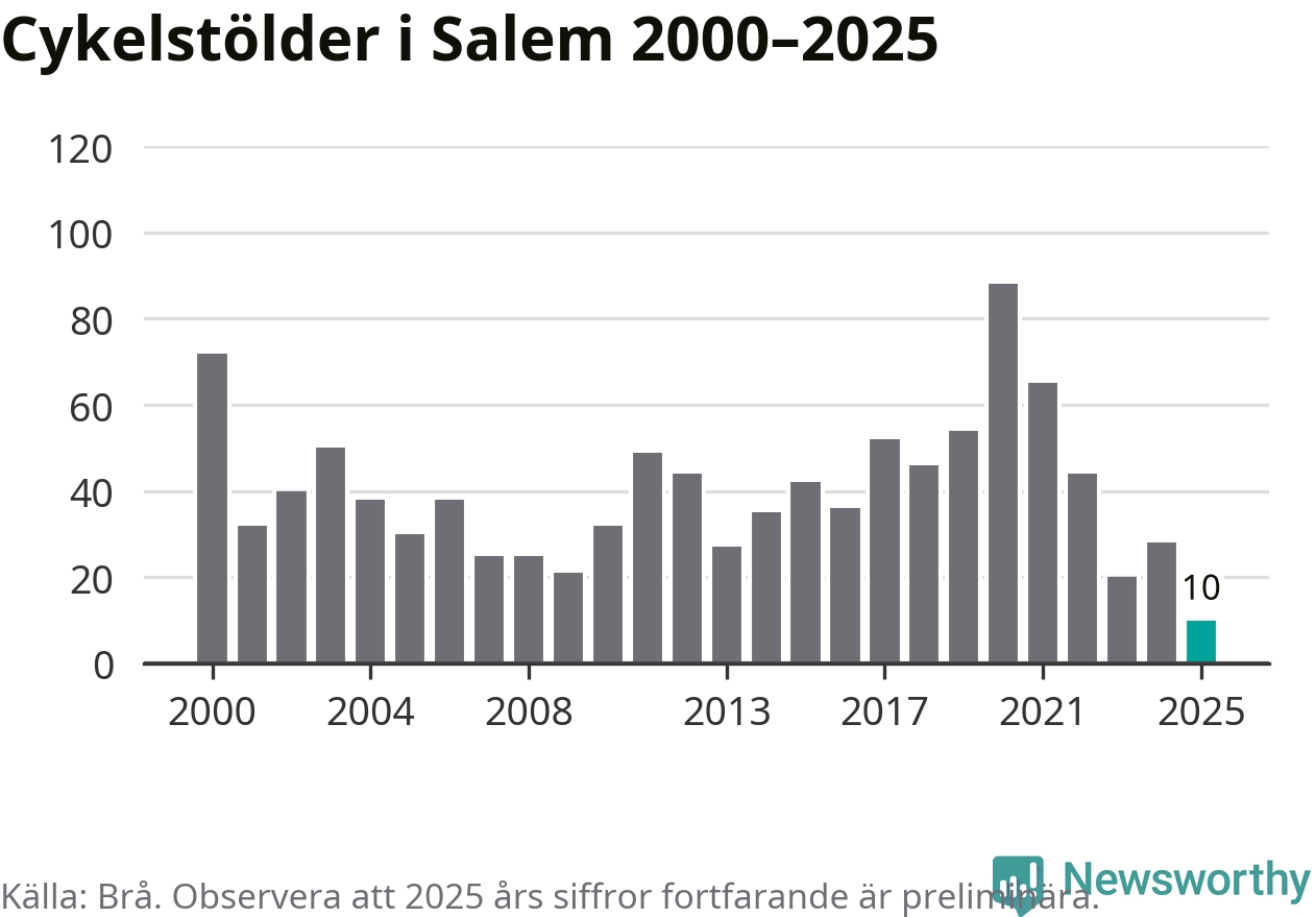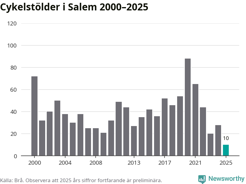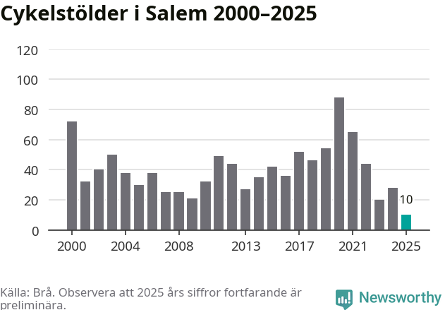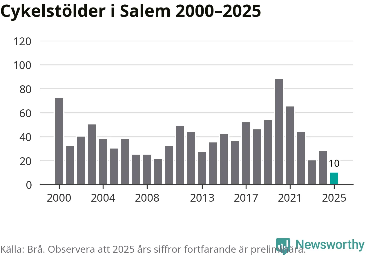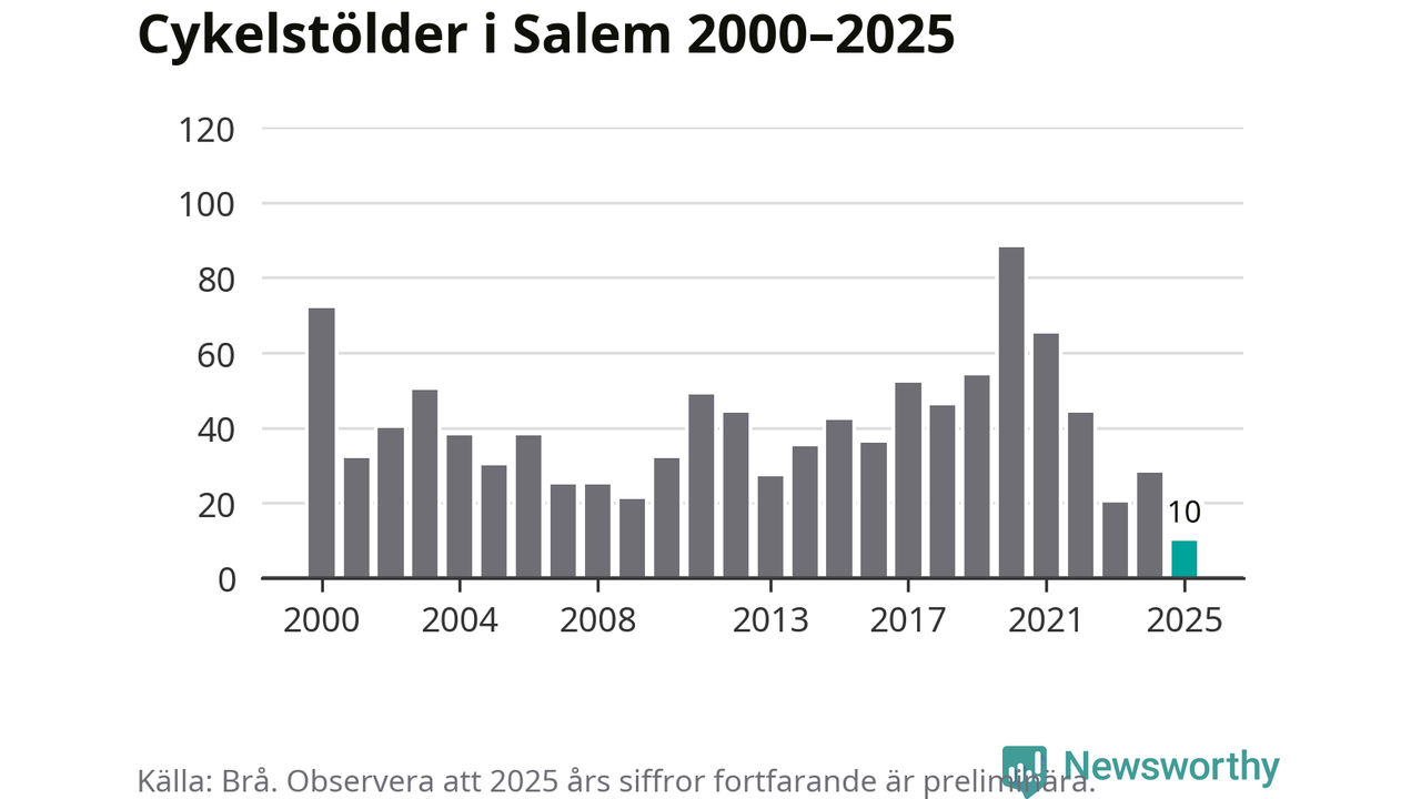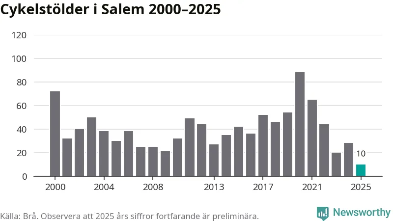 I Salems kommun noterades det lägsta antalet cykelstölder under hela 2000-talet år 2025, även om det fortfarande är preliminära siffror. Under de senaste 25 åren har det som mest anmälts 88 cykelstölder på ett år (2020).