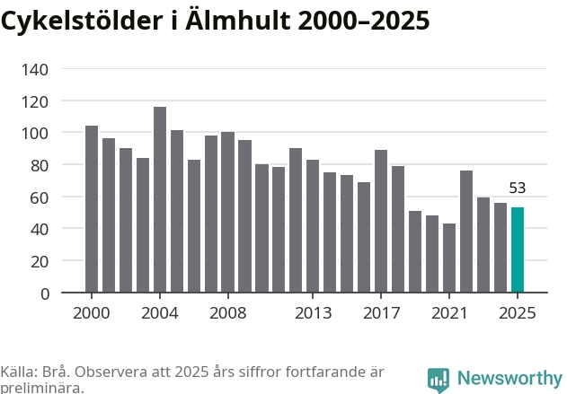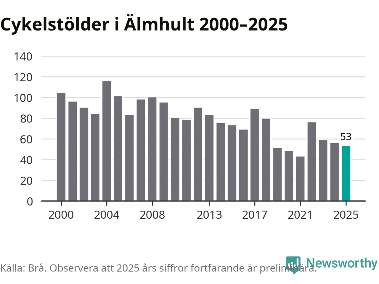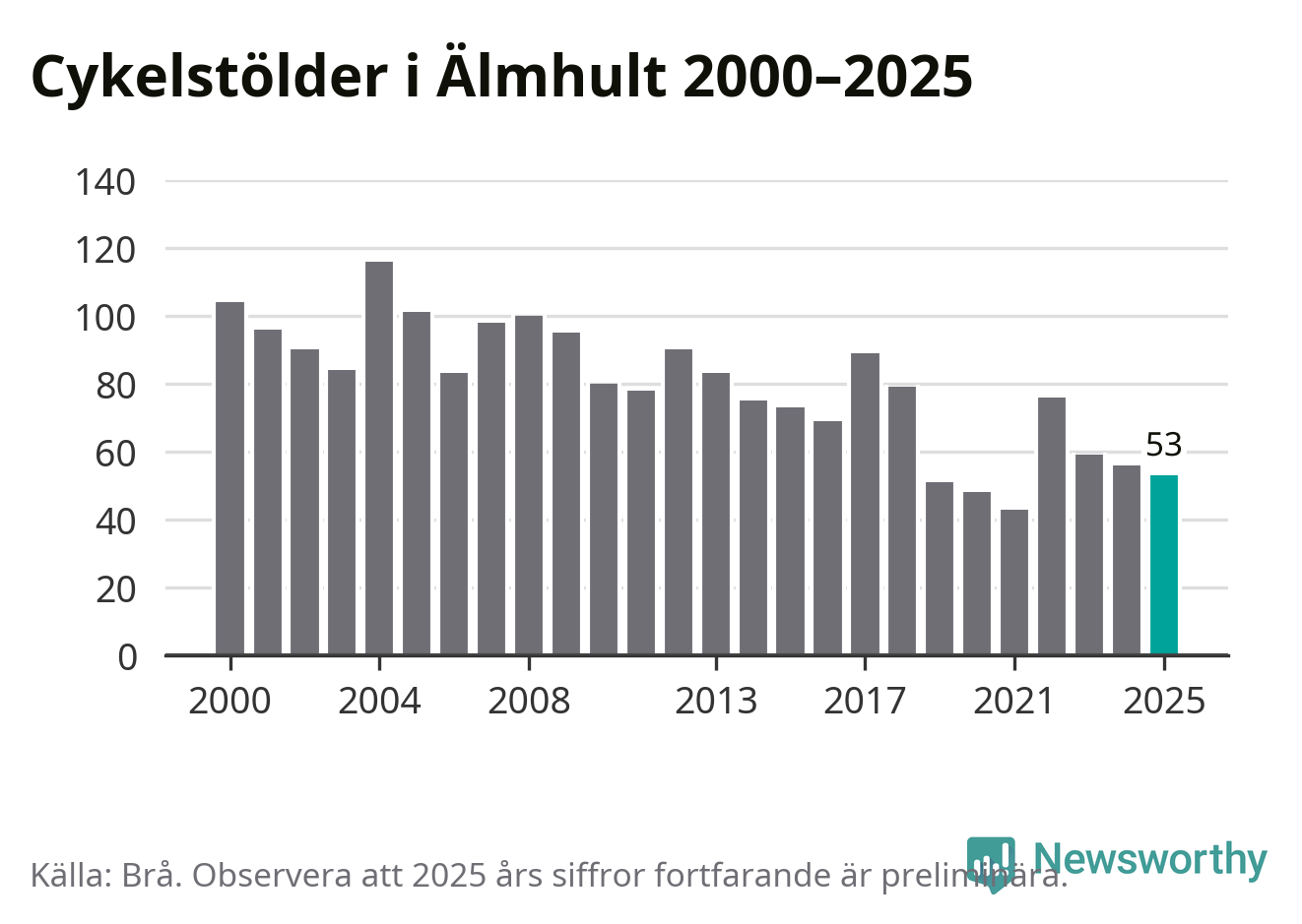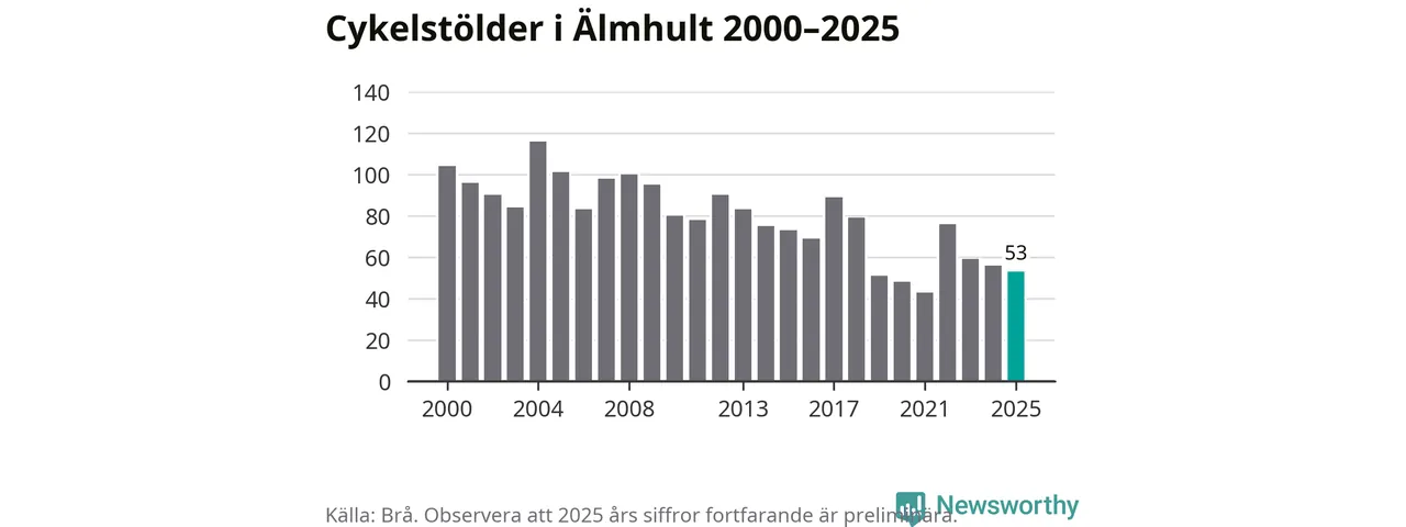 I Älmhults kommun var antalet cykelstölder relativt få i en historisk kontext år 2025, även om det fortfarande är preliminära siffror. Under de senaste 25 åren har det som mest anmälts 116 cykelstölder på ett år (2004), som minst 43 stycken (2021).