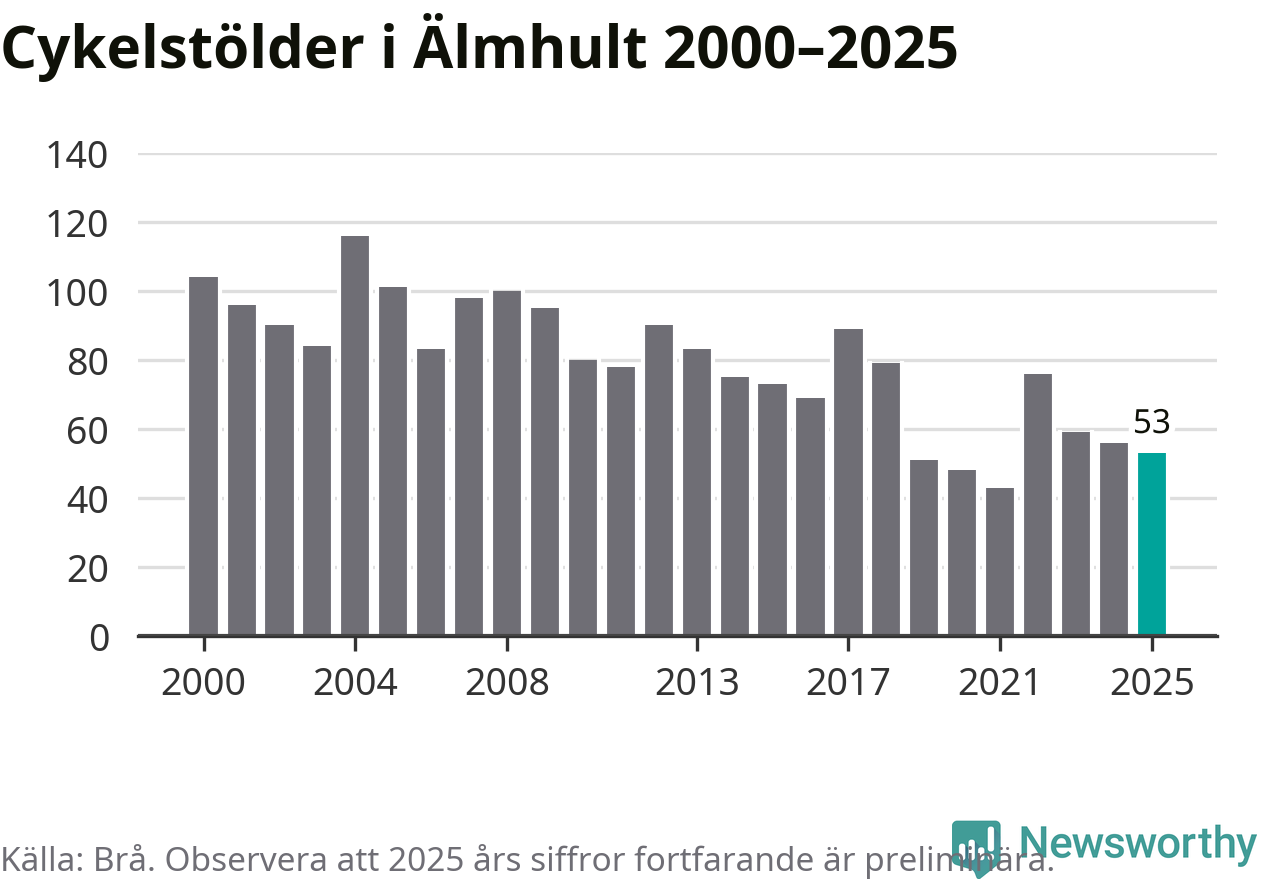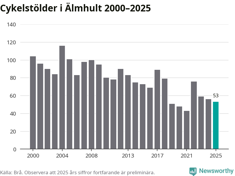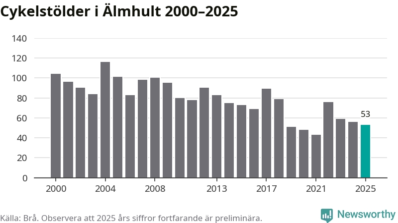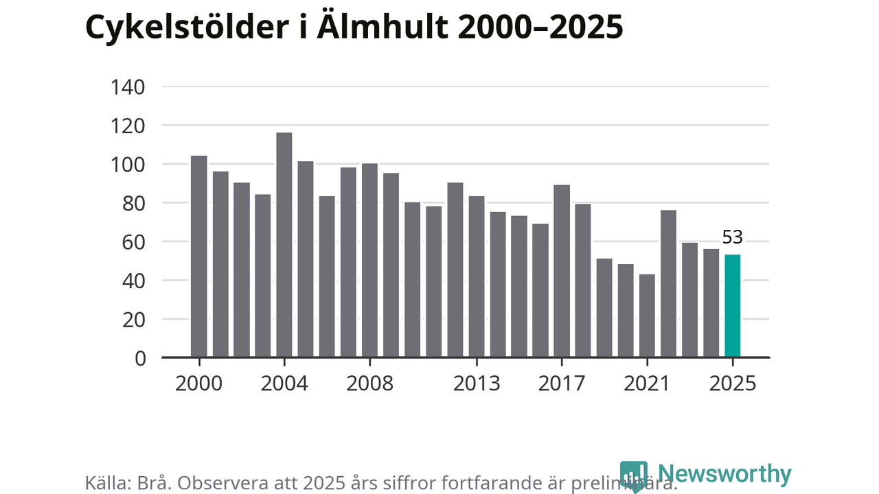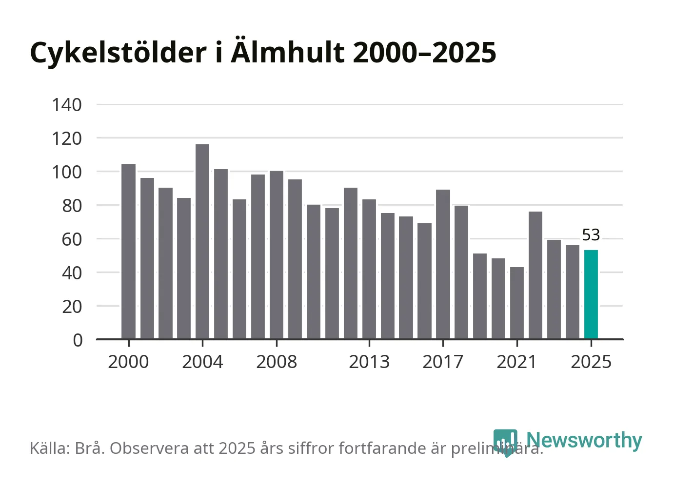 I Älmhults kommun var antalet cykelstölder relativt få i en historisk kontext år 2025, även om det fortfarande är preliminära siffror. Under de senaste 25 åren har det som mest anmälts 116 cykelstölder på ett år (2004), som minst 43 stycken (2021).
