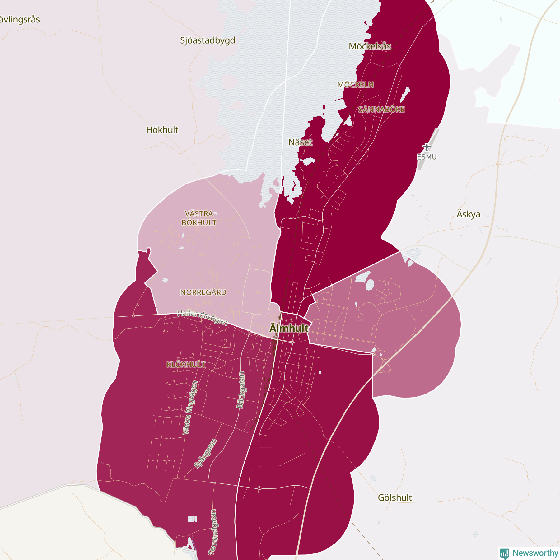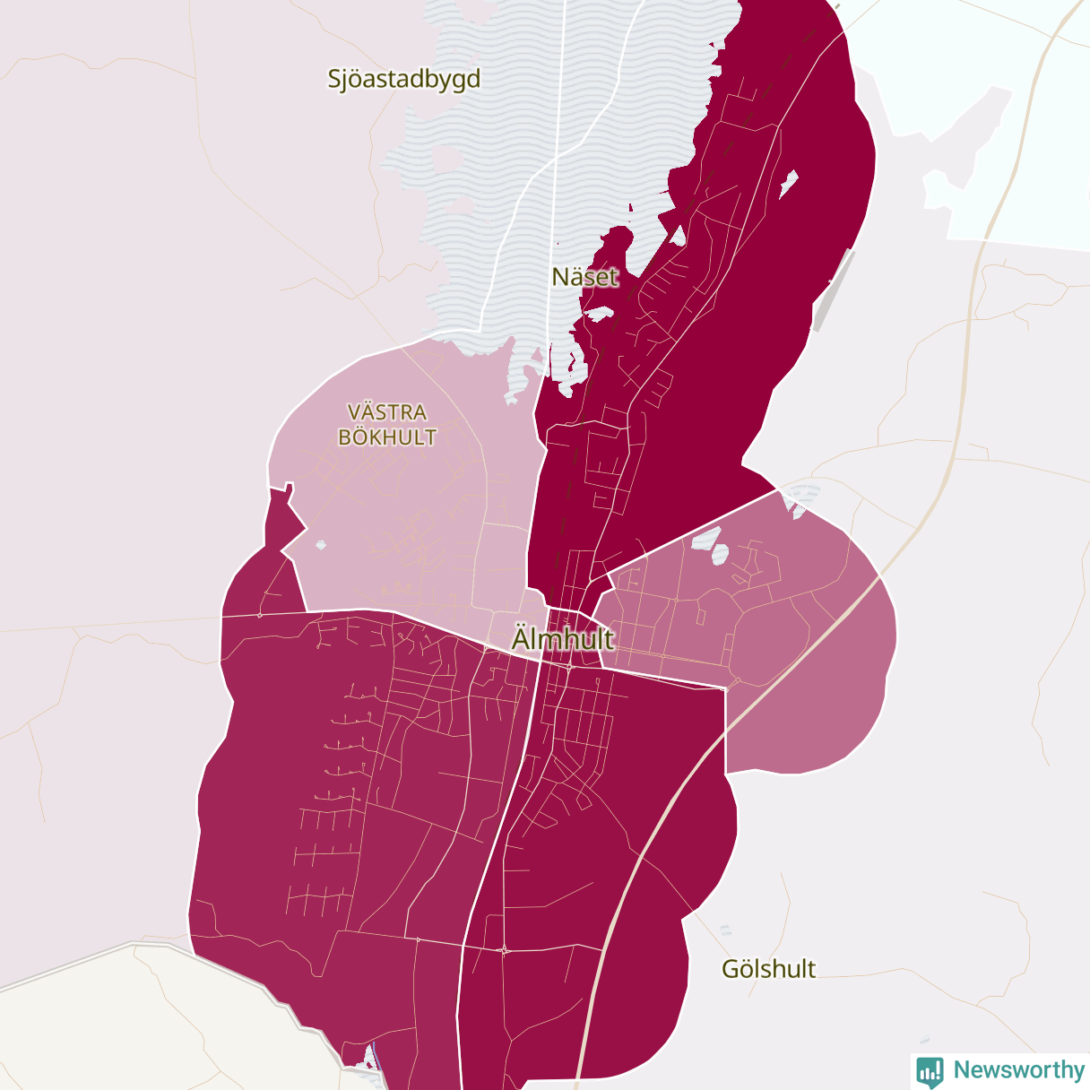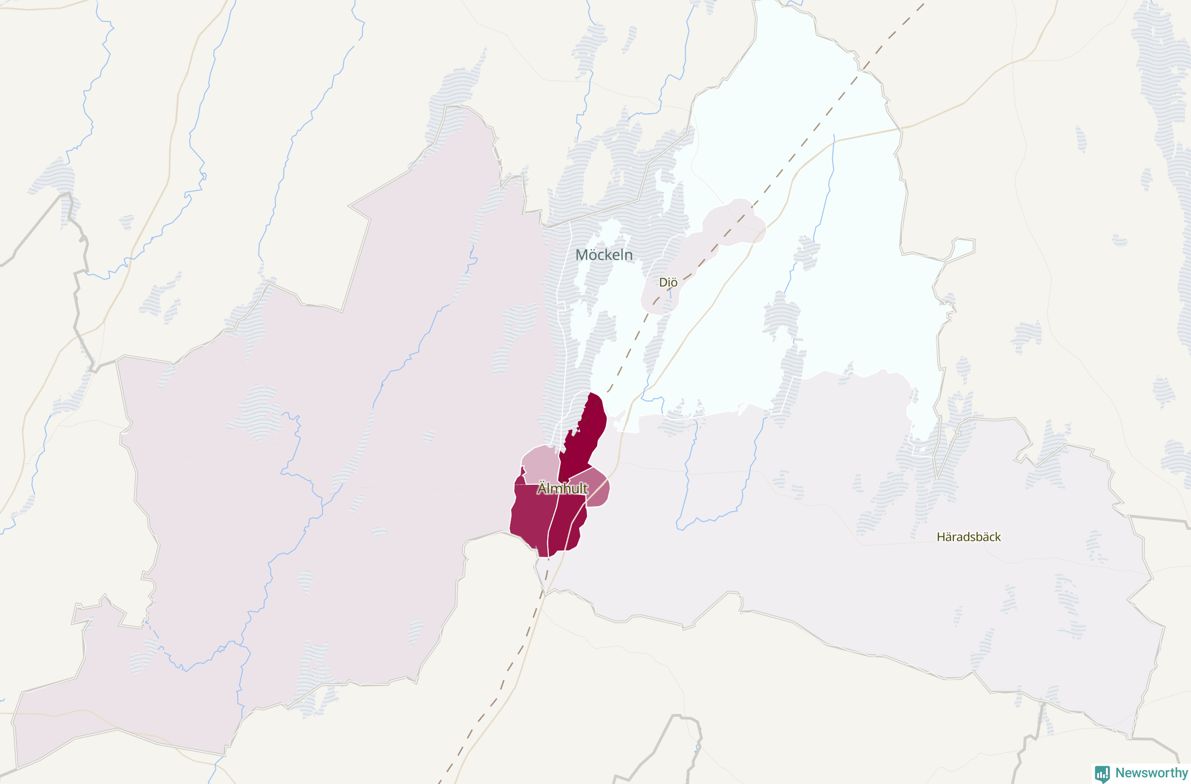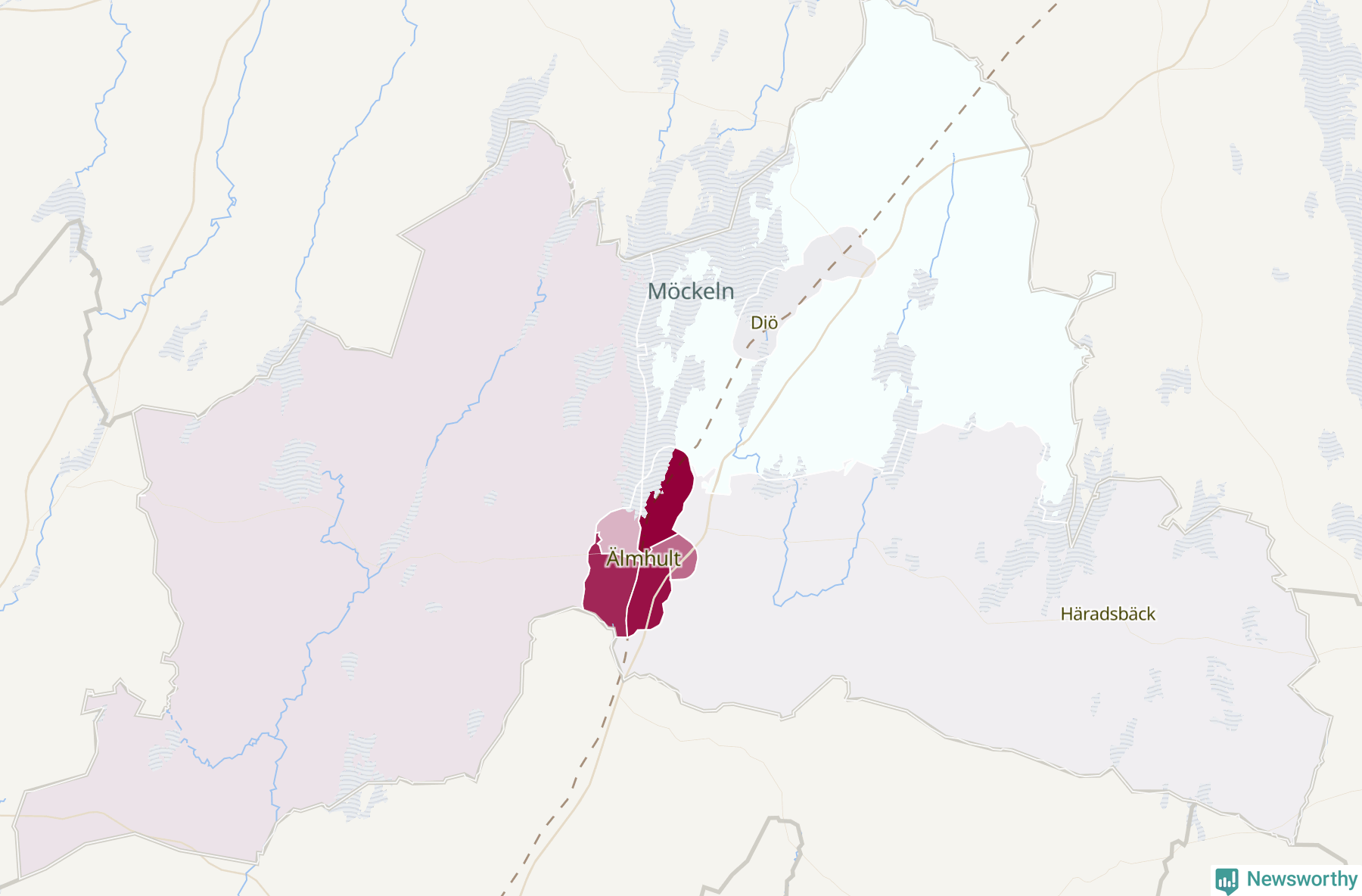 Området med flest anmälda cykelstölder i Älmhults kommun är Älmhult norra, där det handlar om 49 anmälningar under perioden 2020–2025. Det är ett av de områden i Kronoberg där allra flest cykelstölder har anmälts. Tar man hänsyn till folkmängden är Älmhult sydöstra hårdast drabbade i kommunen. Där har totalt 46 anmälningar gjorts under perioden 2020–2025, vilket motsvarar ett snitt på 4,9 anmälningar per 1 000 invånare och år.