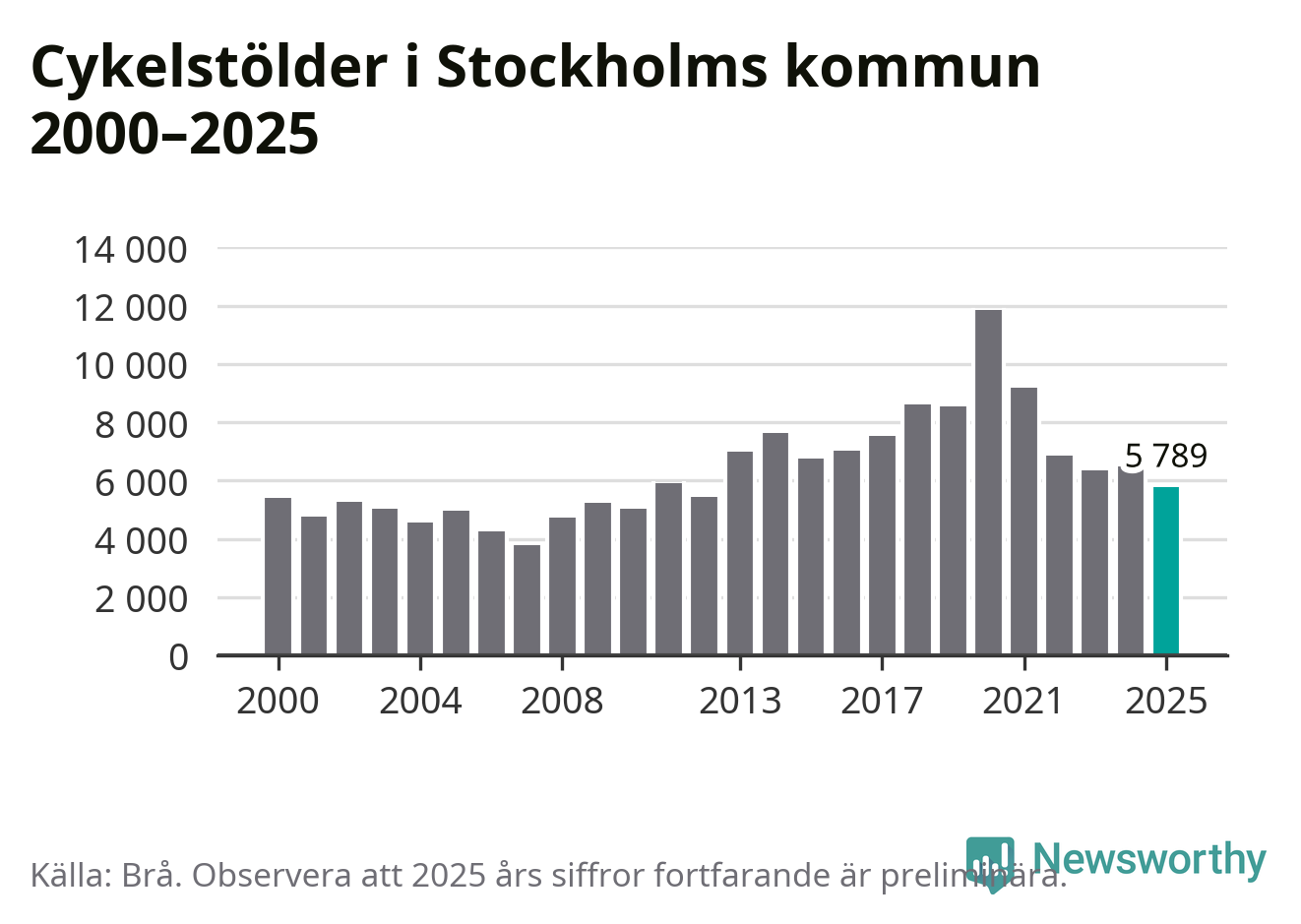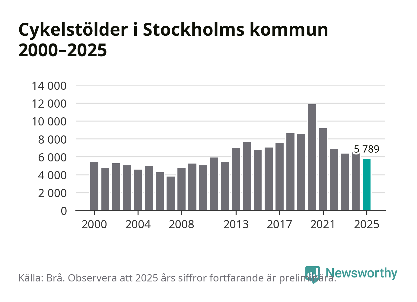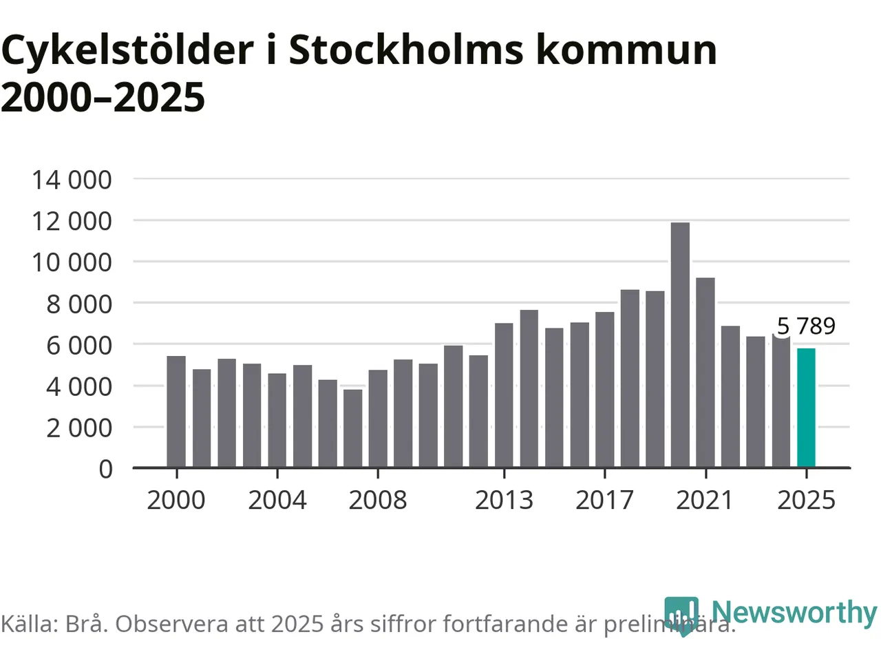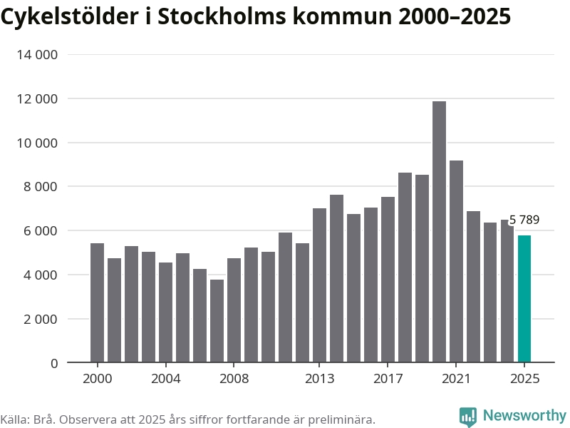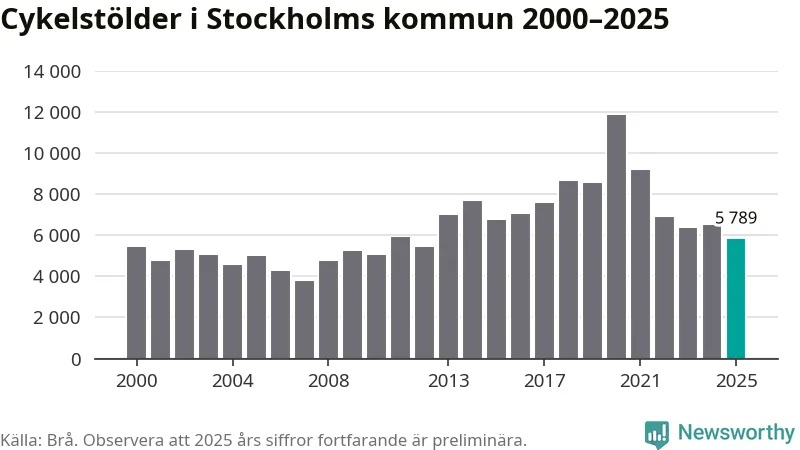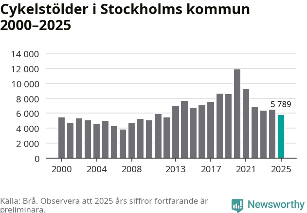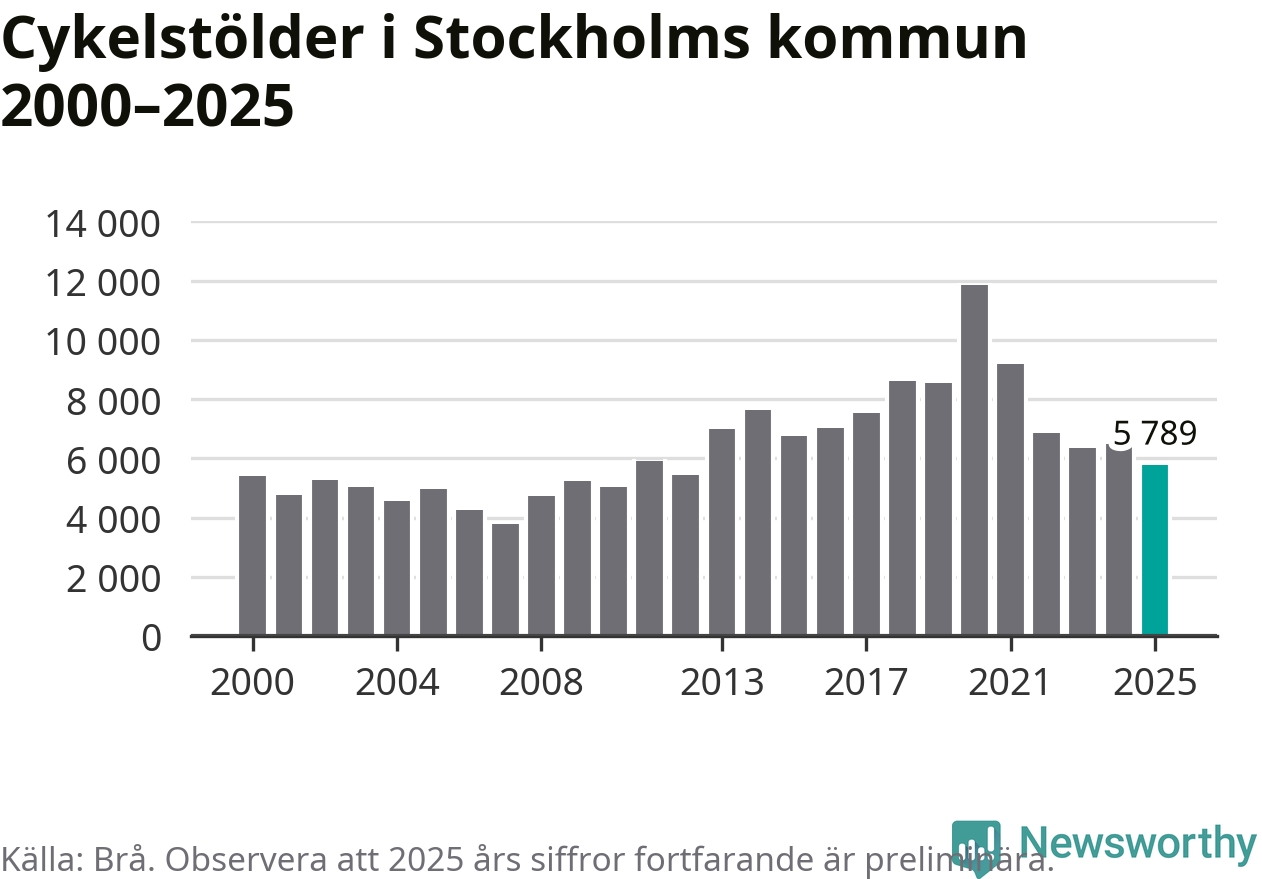 I Stockholms kommun var antalet cykelstölder det lägsta sedan 2012. Under de senaste 25 åren har det som mest anmälts 11 863 cykelstölder på ett år (2020), som minst 3 789 stycken (2007).