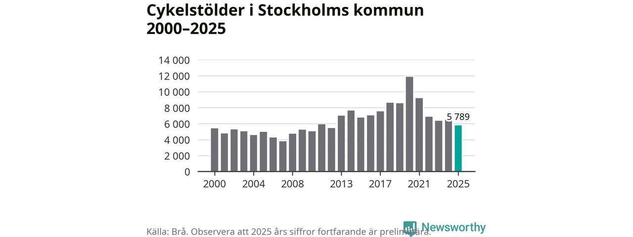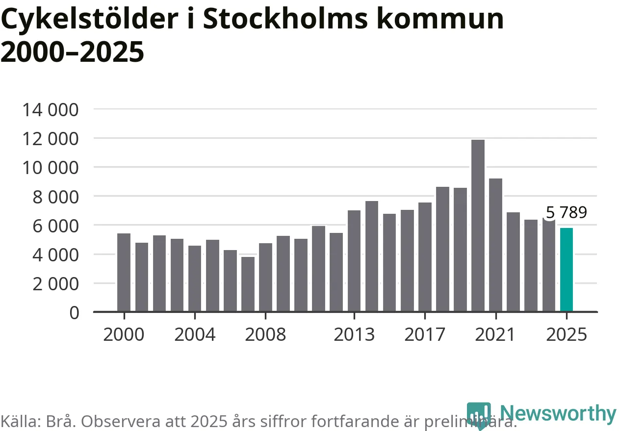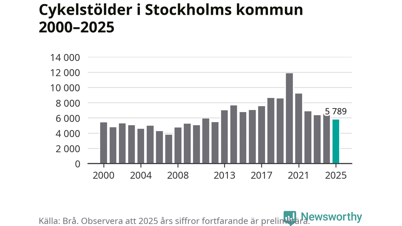 Av de 5 789 stöldanmälningar i Stockholms kommun 2025 gällde 1 462 elcyklar, det motsvarar 25 procent. Brå särredovisar elcyklar sedan 2020 och i riket som helhet ökade anmälningarna om stulna elcyklar kraftigt de första åren, för att de senaste tre åren ha legat relativt stilla. Eftersom antalet cykelstölder totalt har minskat under samma tid har andelen elcyklar ökat. I fjol stod elcyklar för 28 procent av alla anmälda cykelstölder i landet.