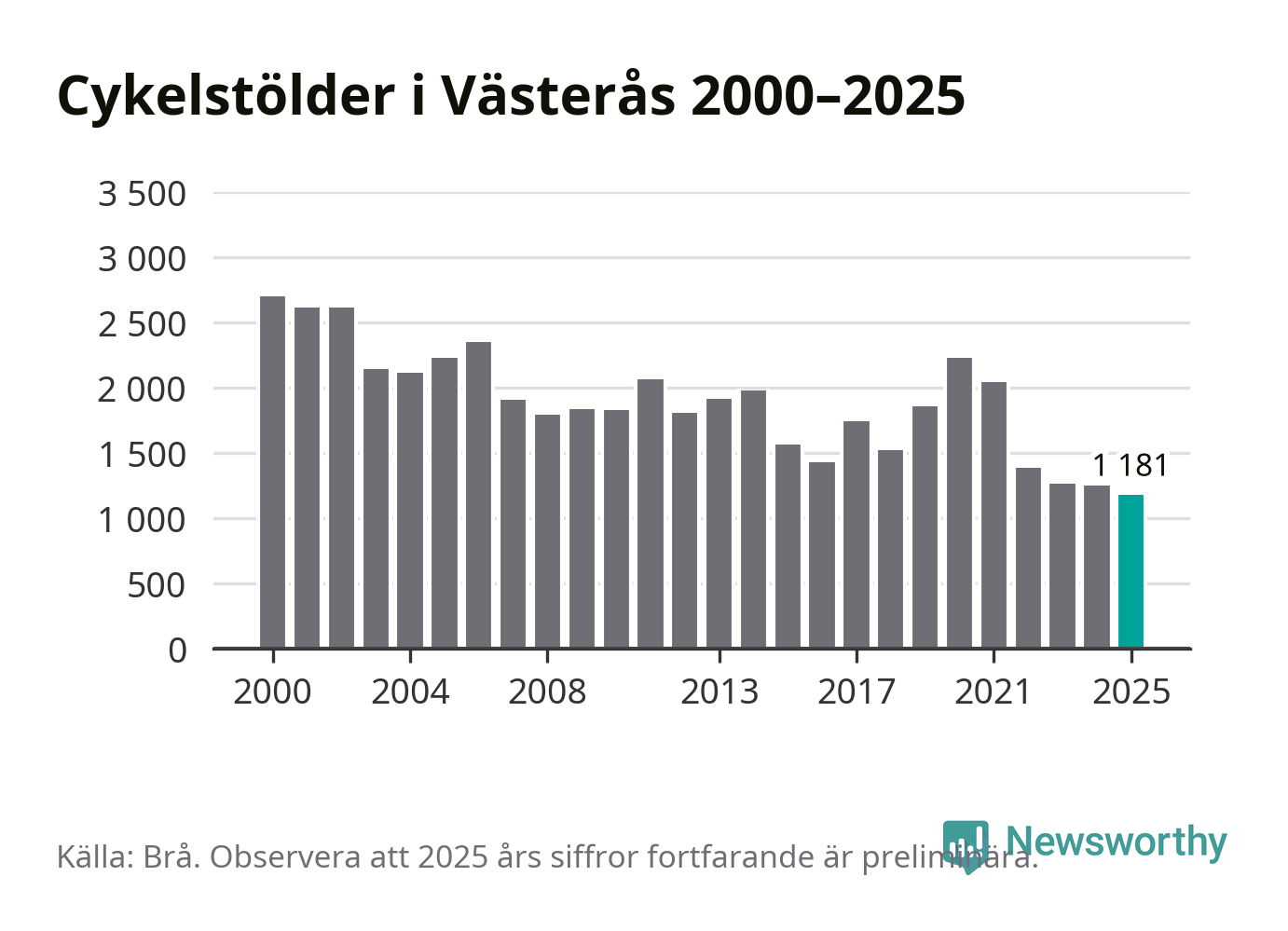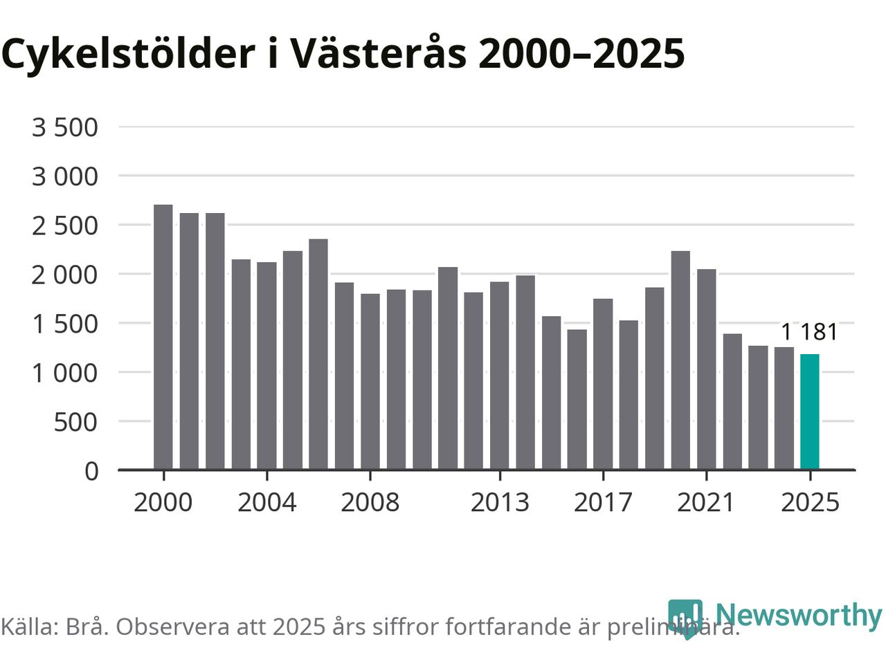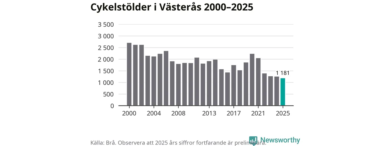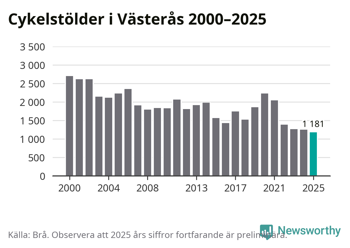 I Västerås kommun noterades det lägsta antalet cykelstölder under hela 2000-talet år 2025, även om det fortfarande är preliminära siffror. Under de senaste 25 åren har det som mest anmälts 2 702 cykelstölder på ett år (2000).