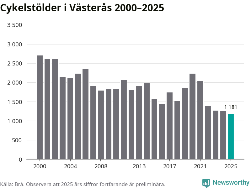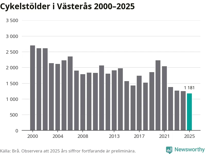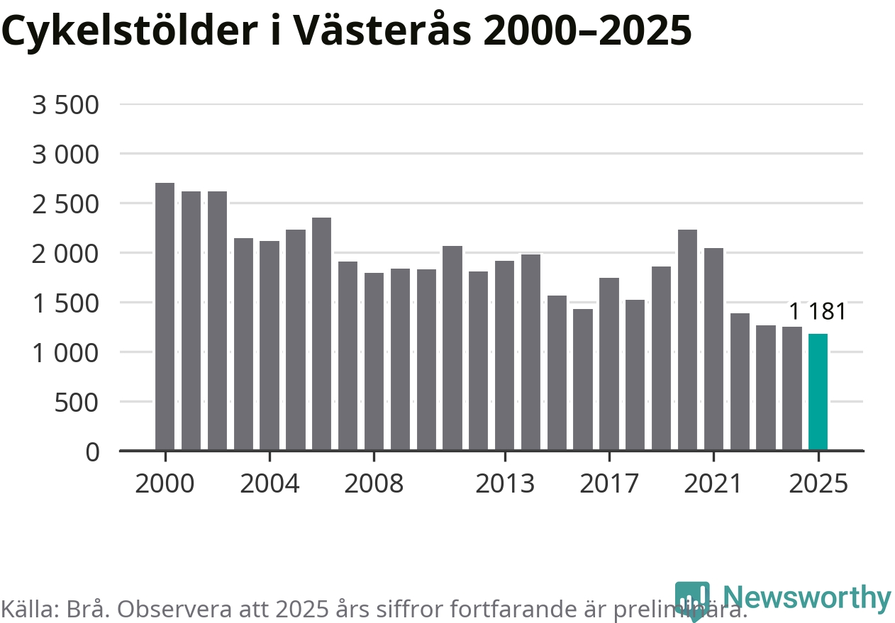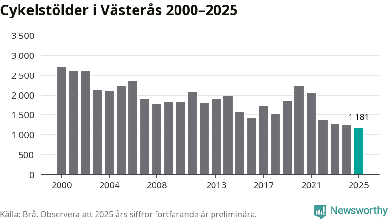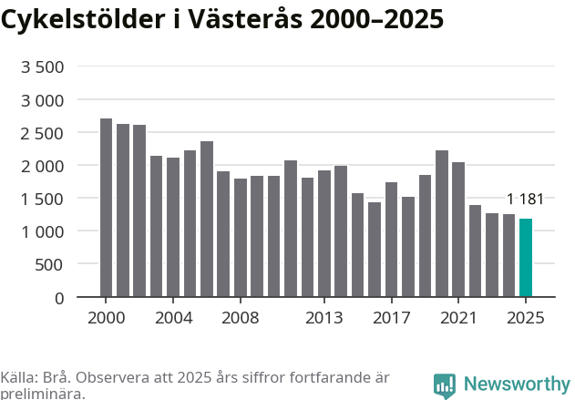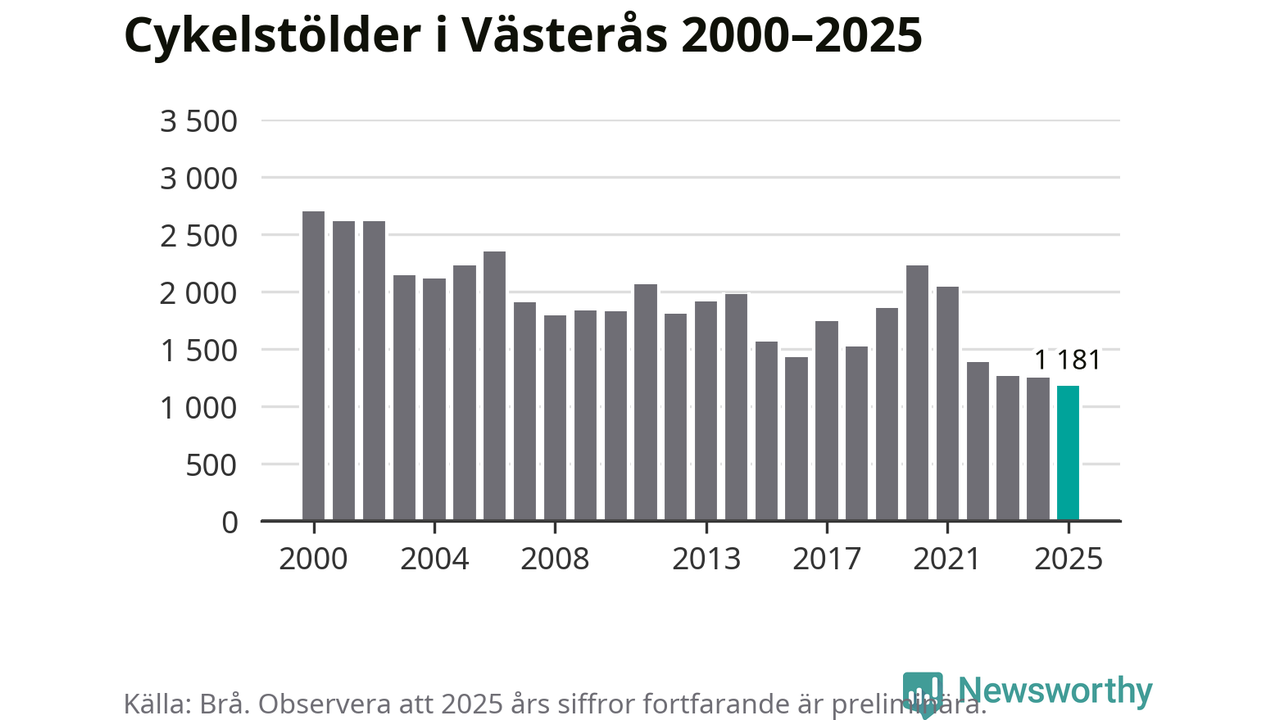 I Västerås kommun noterades det lägsta antalet cykelstölder under hela 2000-talet år 2025, även om det fortfarande är preliminära siffror. Under de senaste 25 åren har det som mest anmälts 2 702 cykelstölder på ett år (2000).