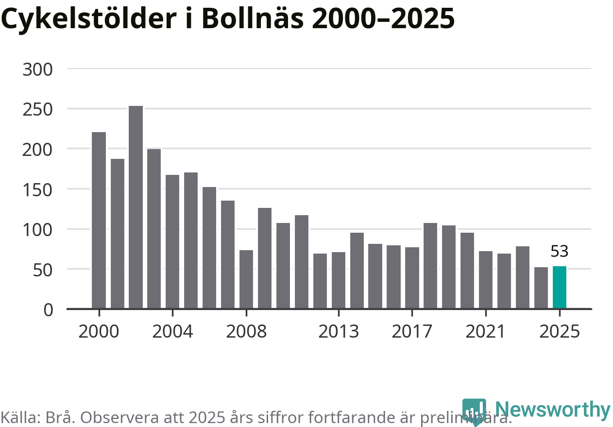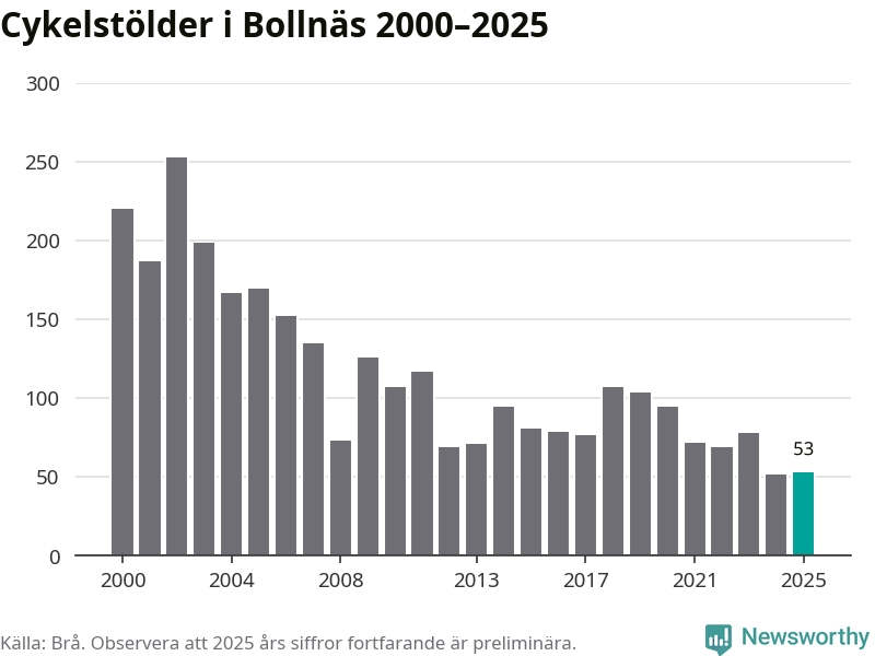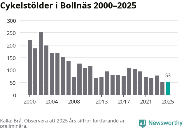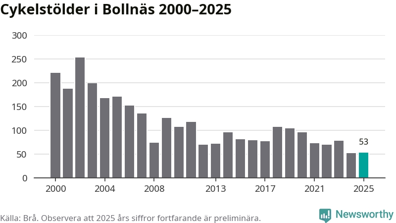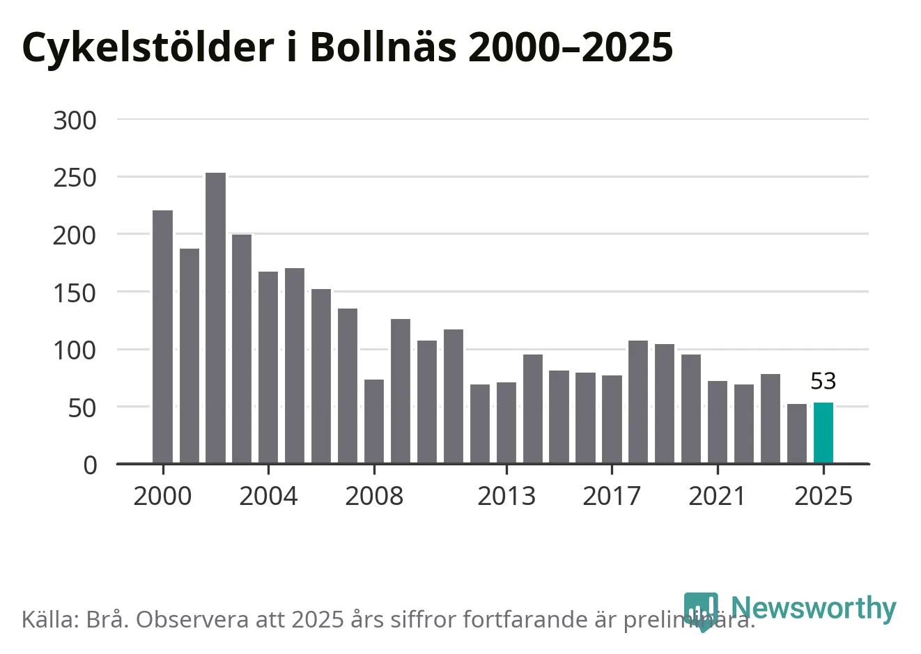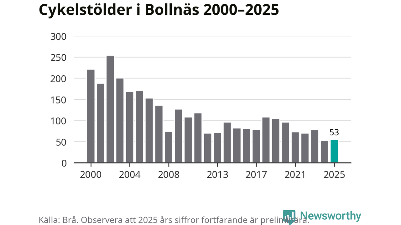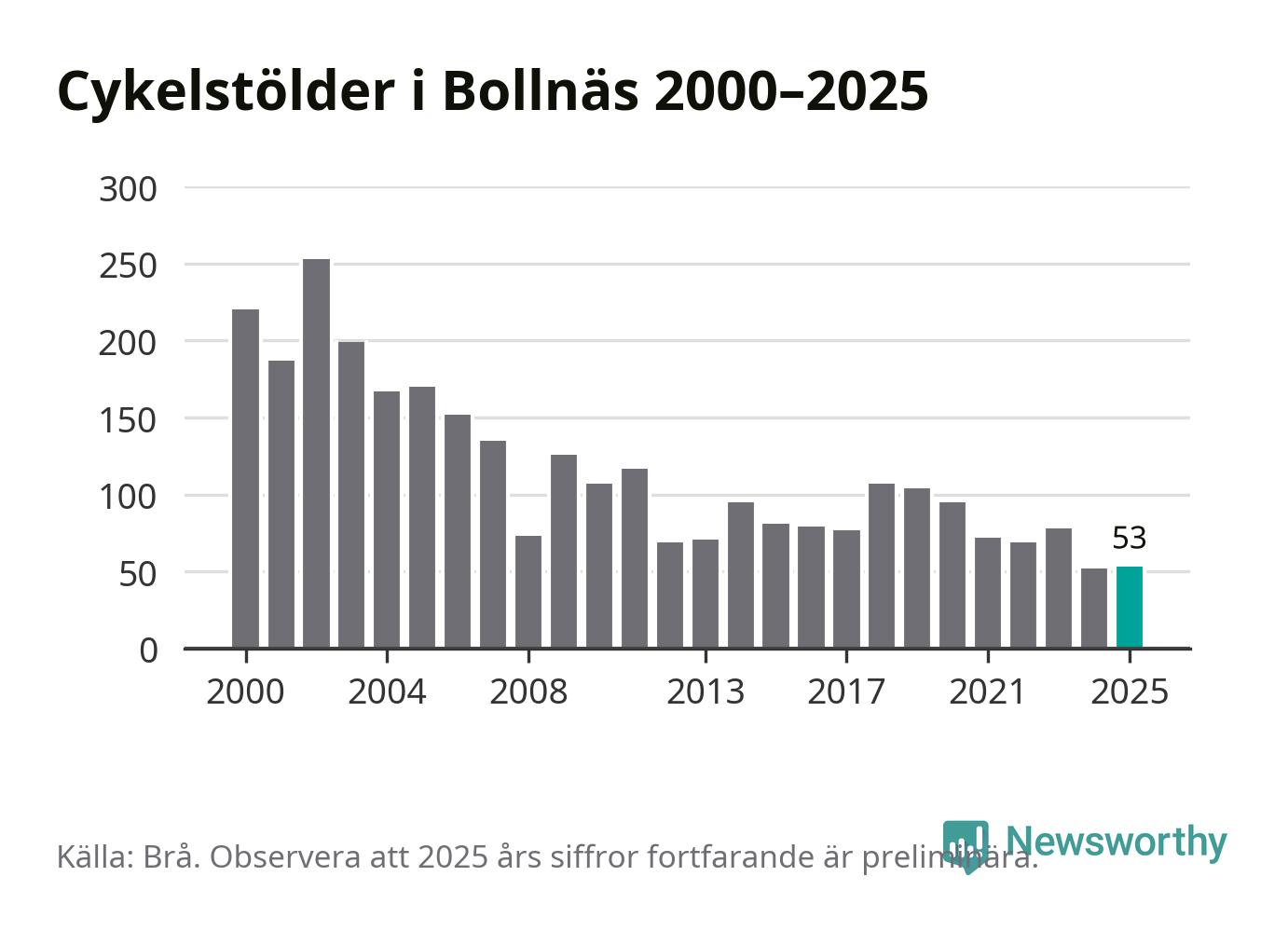 I Bollnäs kommun var antalet cykelstölder relativt få i en historisk kontext år 2025, även om det fortfarande är preliminära siffror. Under de senaste 25 åren har det som mest anmälts 253 cykelstölder på ett år (2002), som minst 52 stycken (2024).