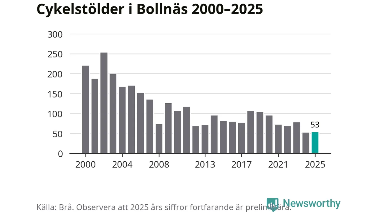 Av de 53 stöldanmälningar i Bollnäs 2025 gällde sju elcyklar, det motsvarar 13 procent. Brå särredovisar elcyklar sedan 2020 och i riket som helhet ökade anmälningarna om stulna elcyklar kraftigt de första åren, för att de senaste tre åren ha legat relativt stilla. Eftersom antalet cykelstölder totalt har minskat under samma tid har andelen elcyklar ökat. I fjol stod elcyklar för 28 procent av alla anmälda cykelstölder i landet.