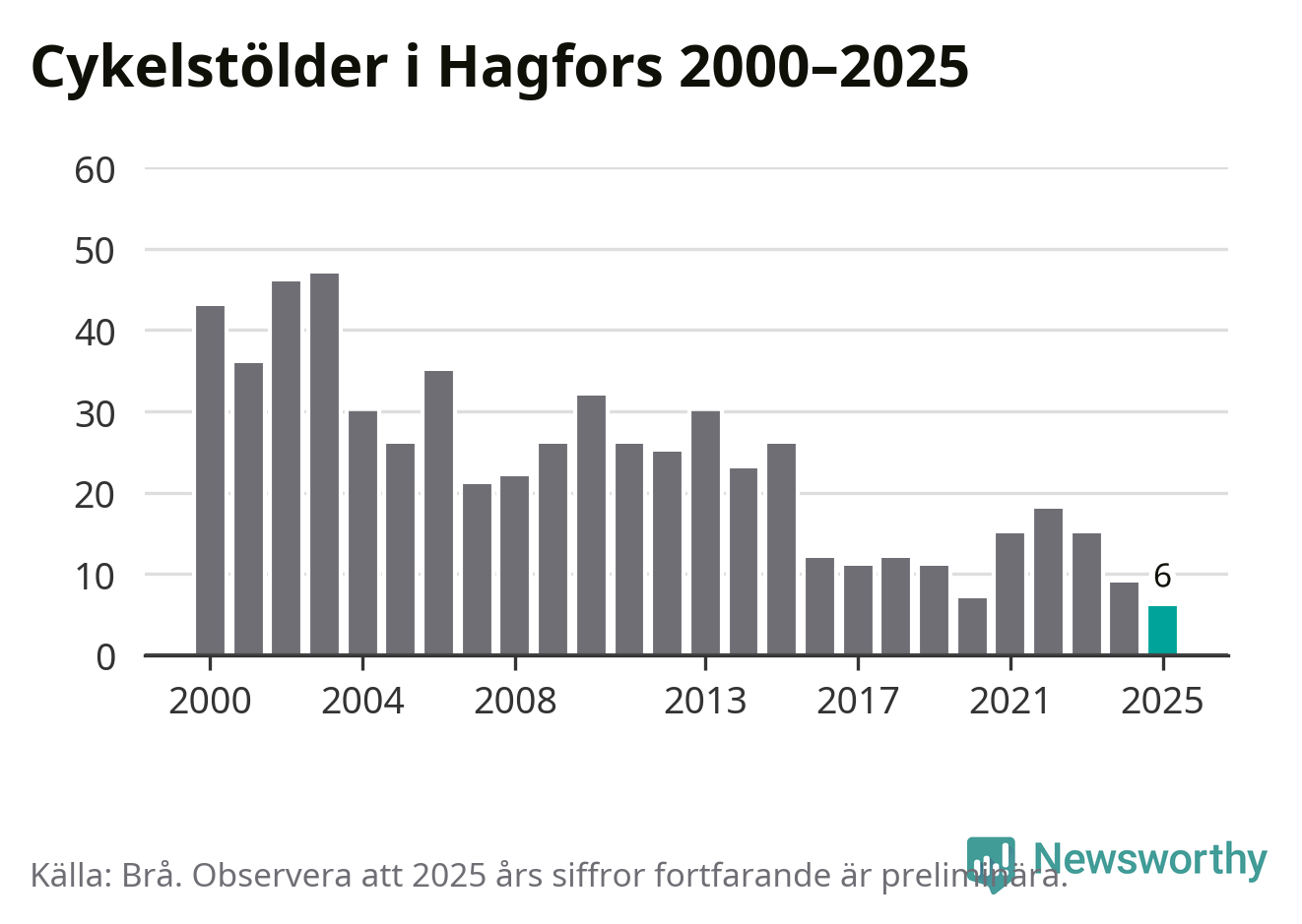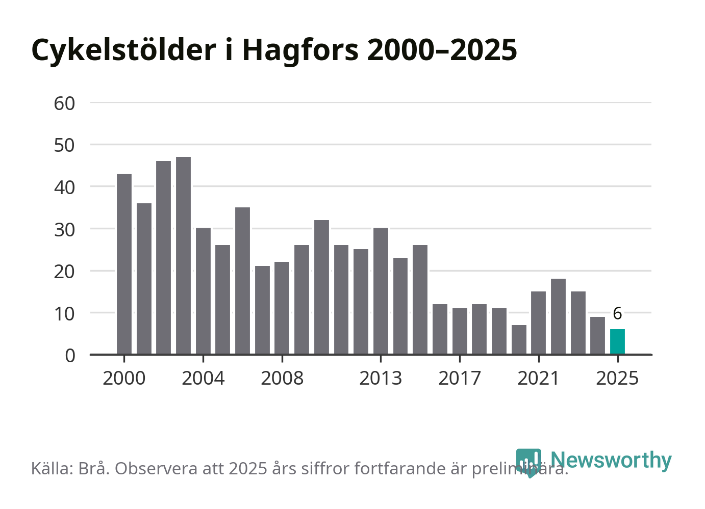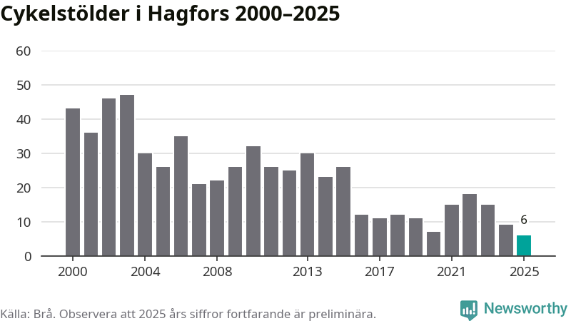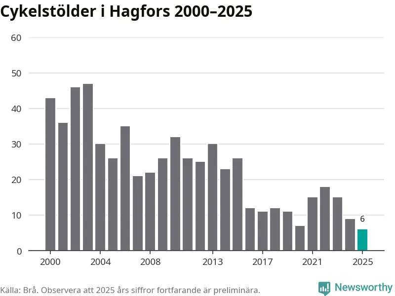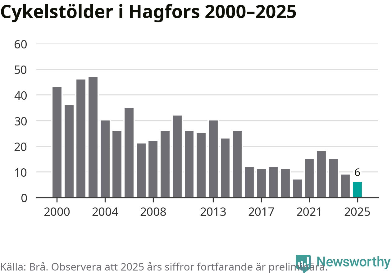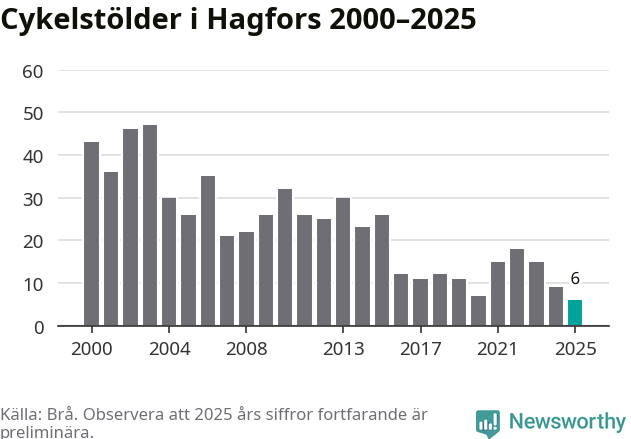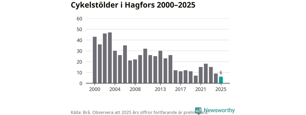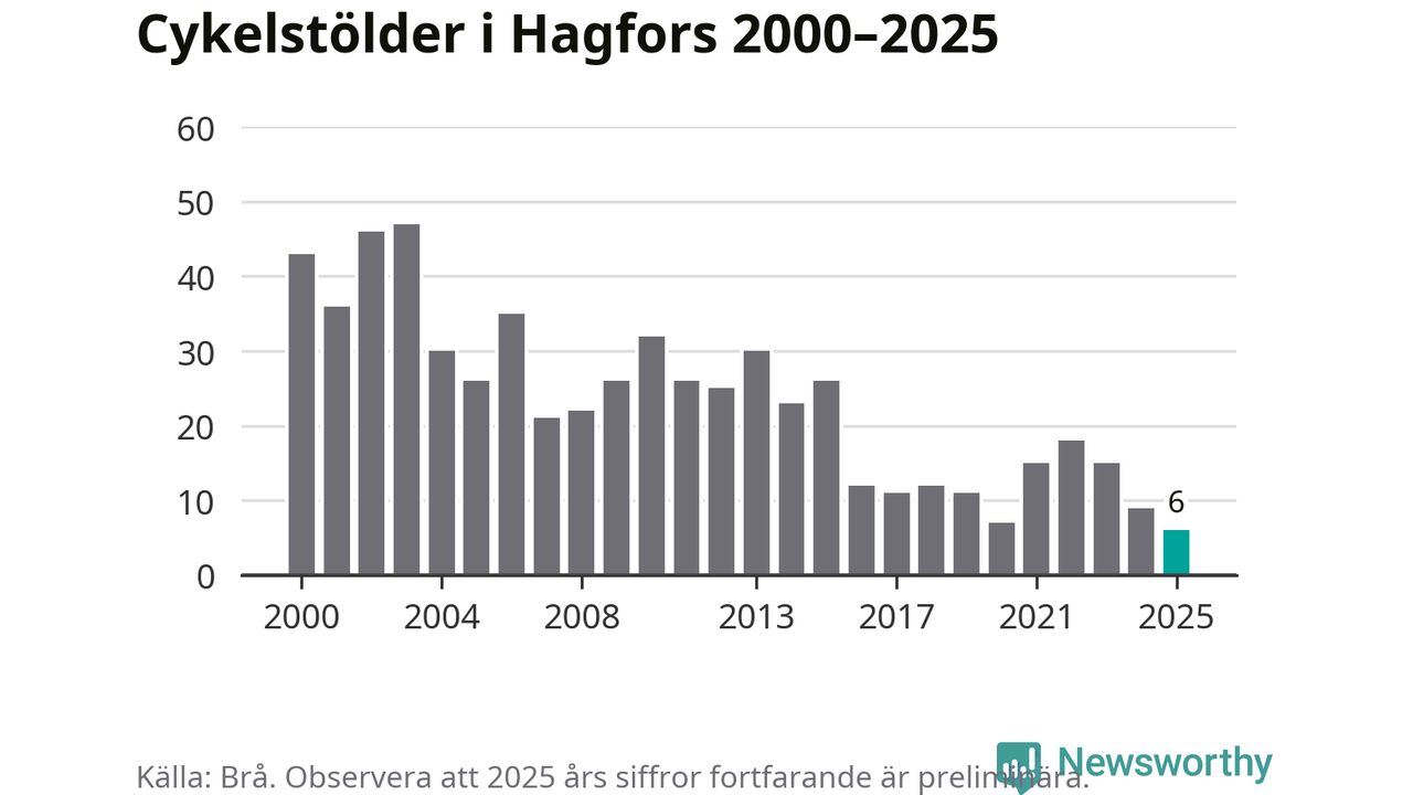 I Hagfors kommun noterades det lägsta antalet cykelstölder under hela 2000-talet år 2025, även om det fortfarande är preliminära siffror. Under de senaste 25 åren har det som mest anmälts 47 cykelstölder på ett år (2003).