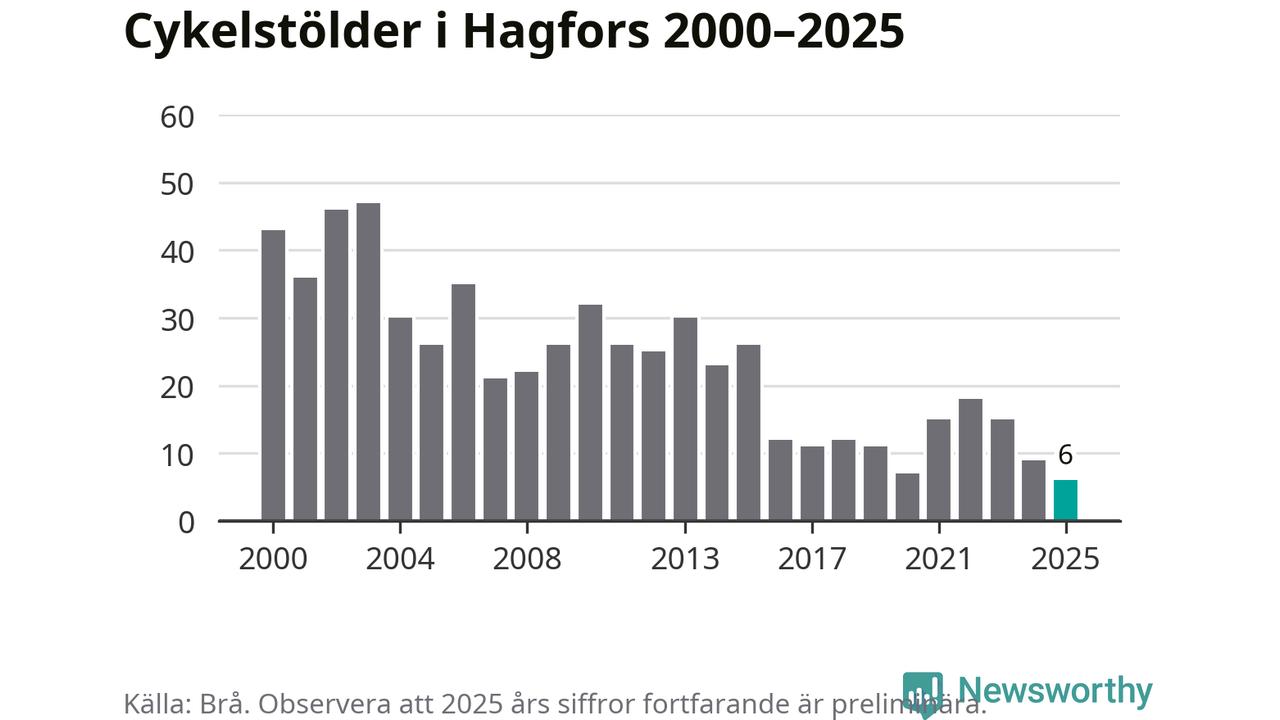 Av de sex stöldanmälningar i Hagfors 2025 gällde ett elcyklar, det motsvarar 17 procent. Brå särredovisar elcyklar sedan 2020 och i riket som helhet ökade anmälningarna om stulna elcyklar kraftigt de första åren, för att de senaste tre åren ha legat relativt stilla. Eftersom antalet cykelstölder totalt har minskat under samma tid har andelen elcyklar ökat. I fjol stod elcyklar för 28 procent av alla anmälda cykelstölder i landet.