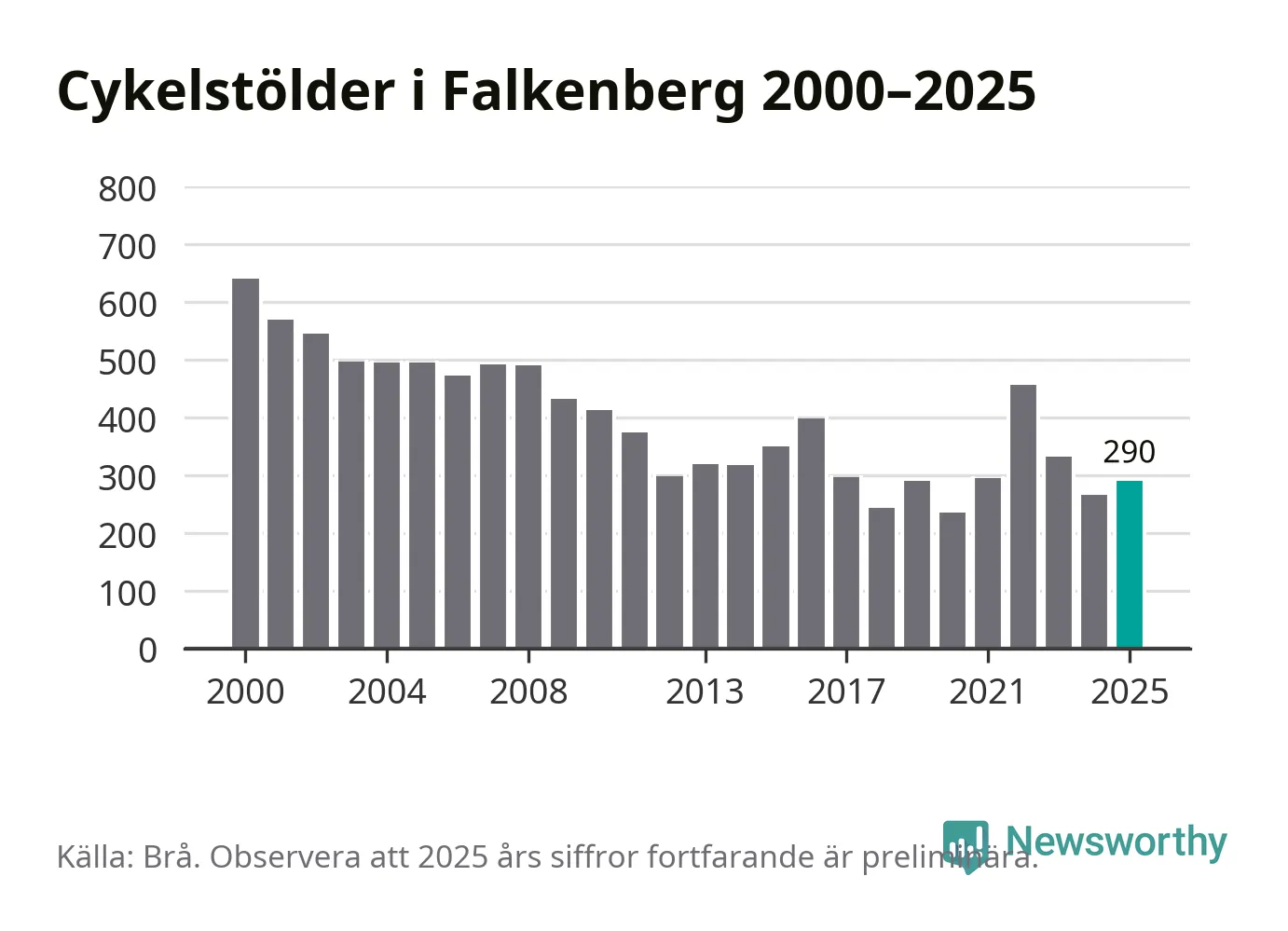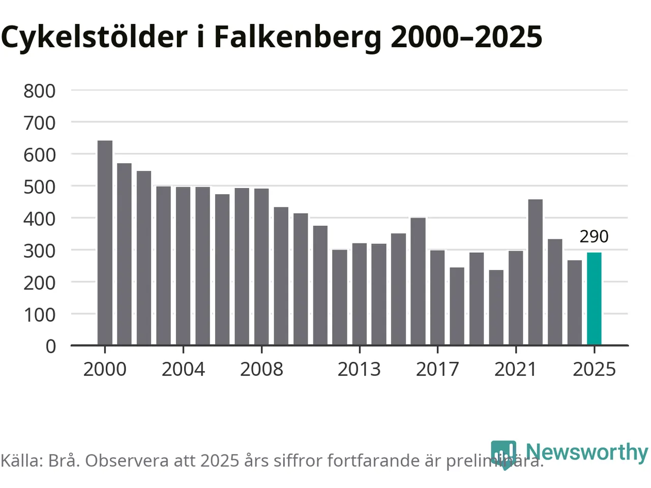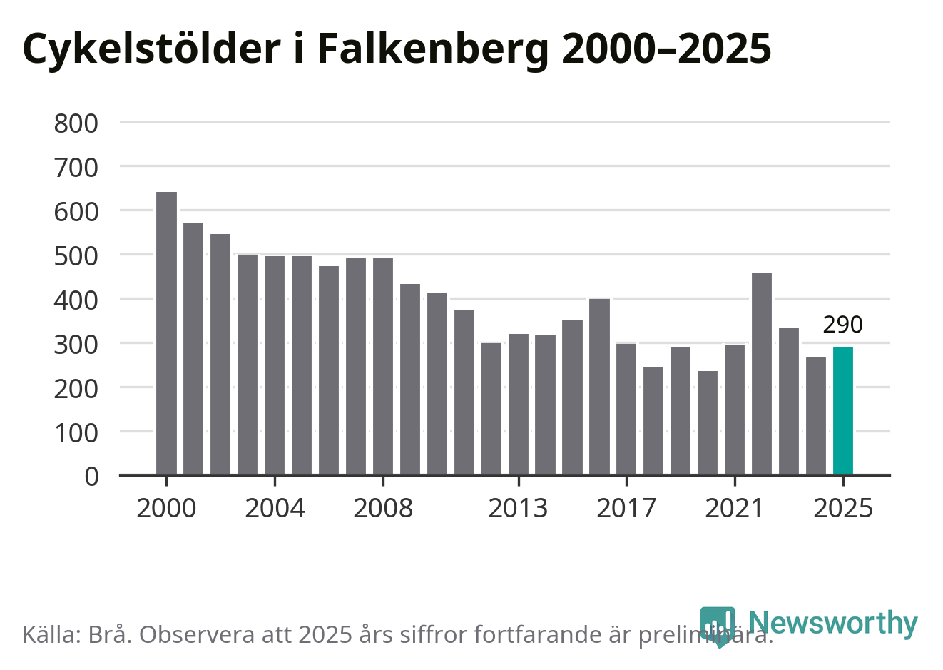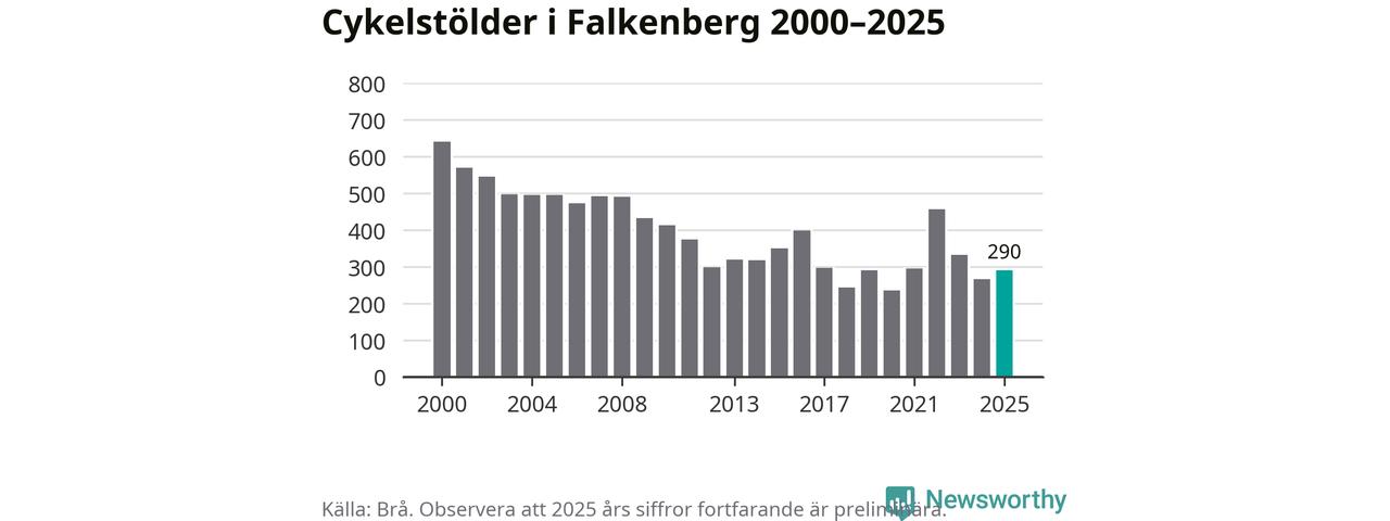 I Falkenbergs kommun var antalet cykelstölder relativt få i en historisk kontext år 2025, även om det fortfarande är preliminära siffror. Under de senaste 25 åren har det som mest anmälts 640 cykelstölder på ett år (2000), som minst 236 stycken (2020).