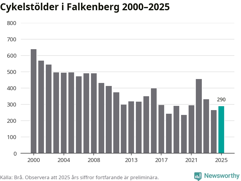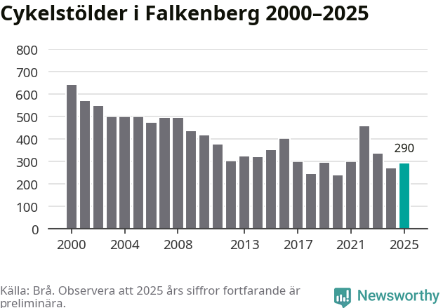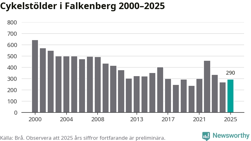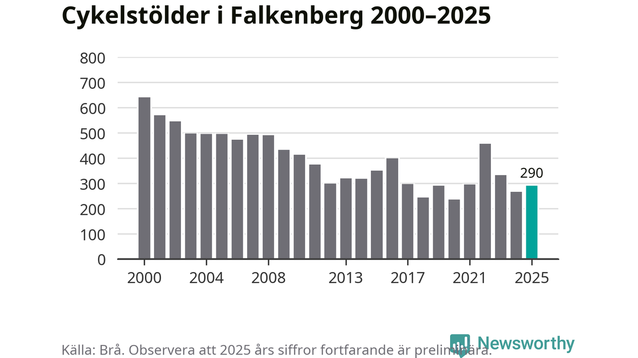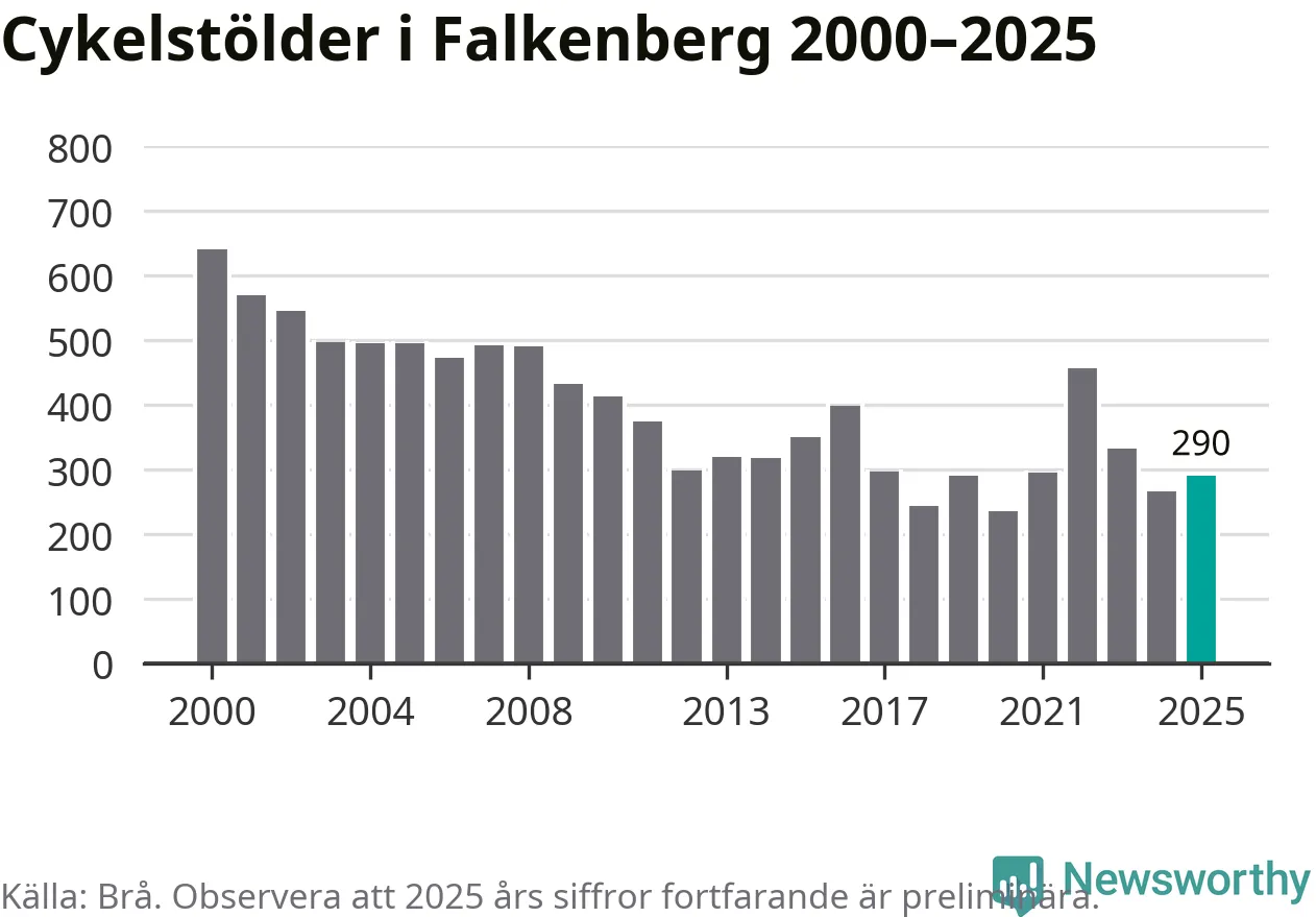 I Falkenbergs kommun var antalet cykelstölder relativt få i en historisk kontext år 2025, även om det fortfarande är preliminära siffror. Under de senaste 25 åren har det som mest anmälts 640 cykelstölder på ett år (2000), som minst 236 stycken (2020).