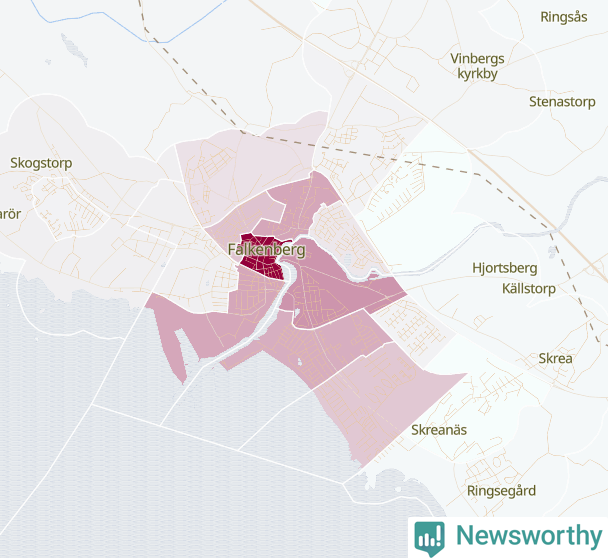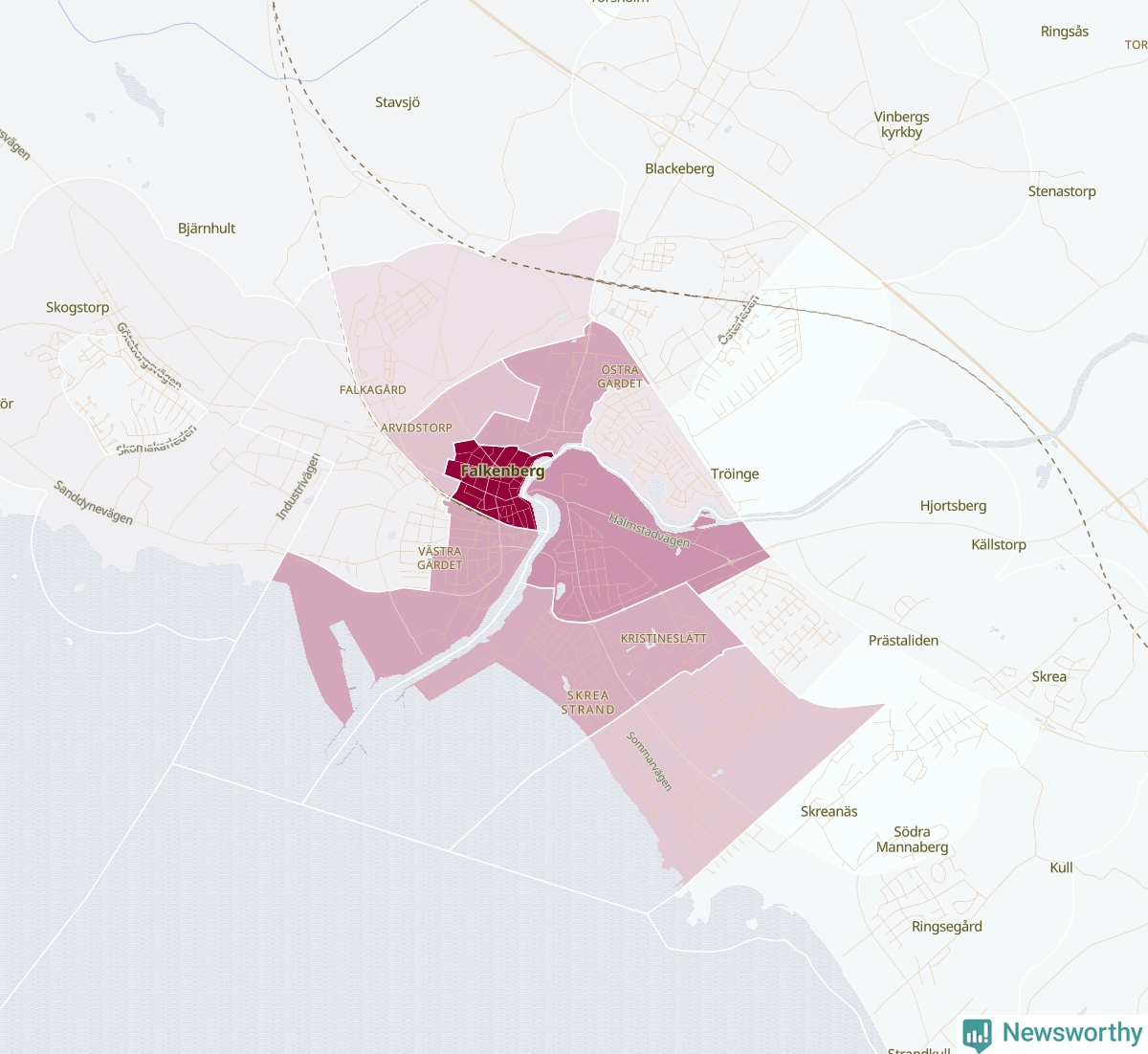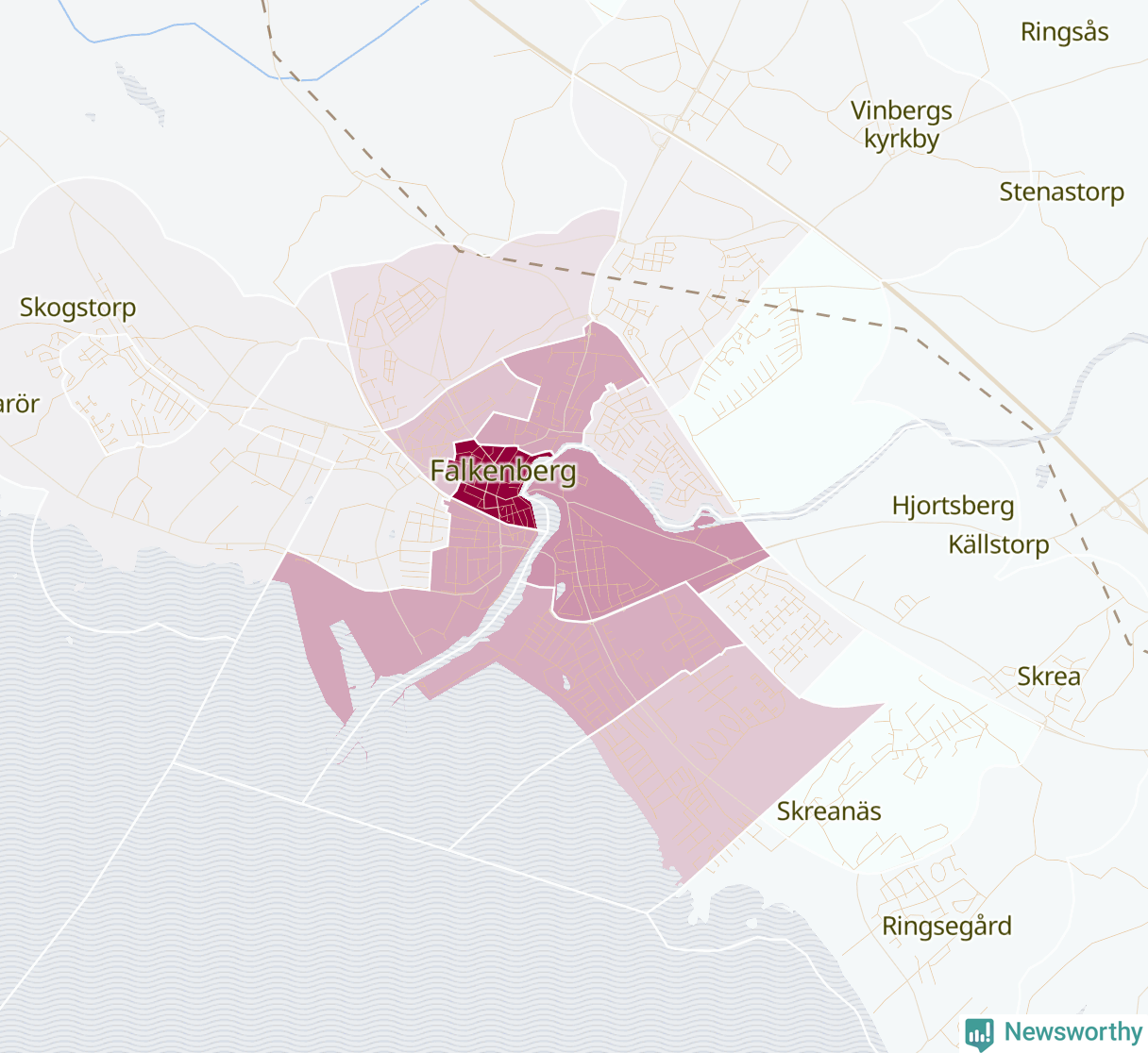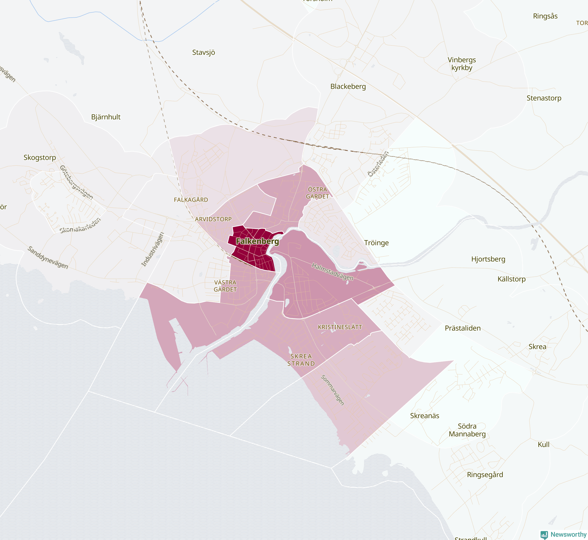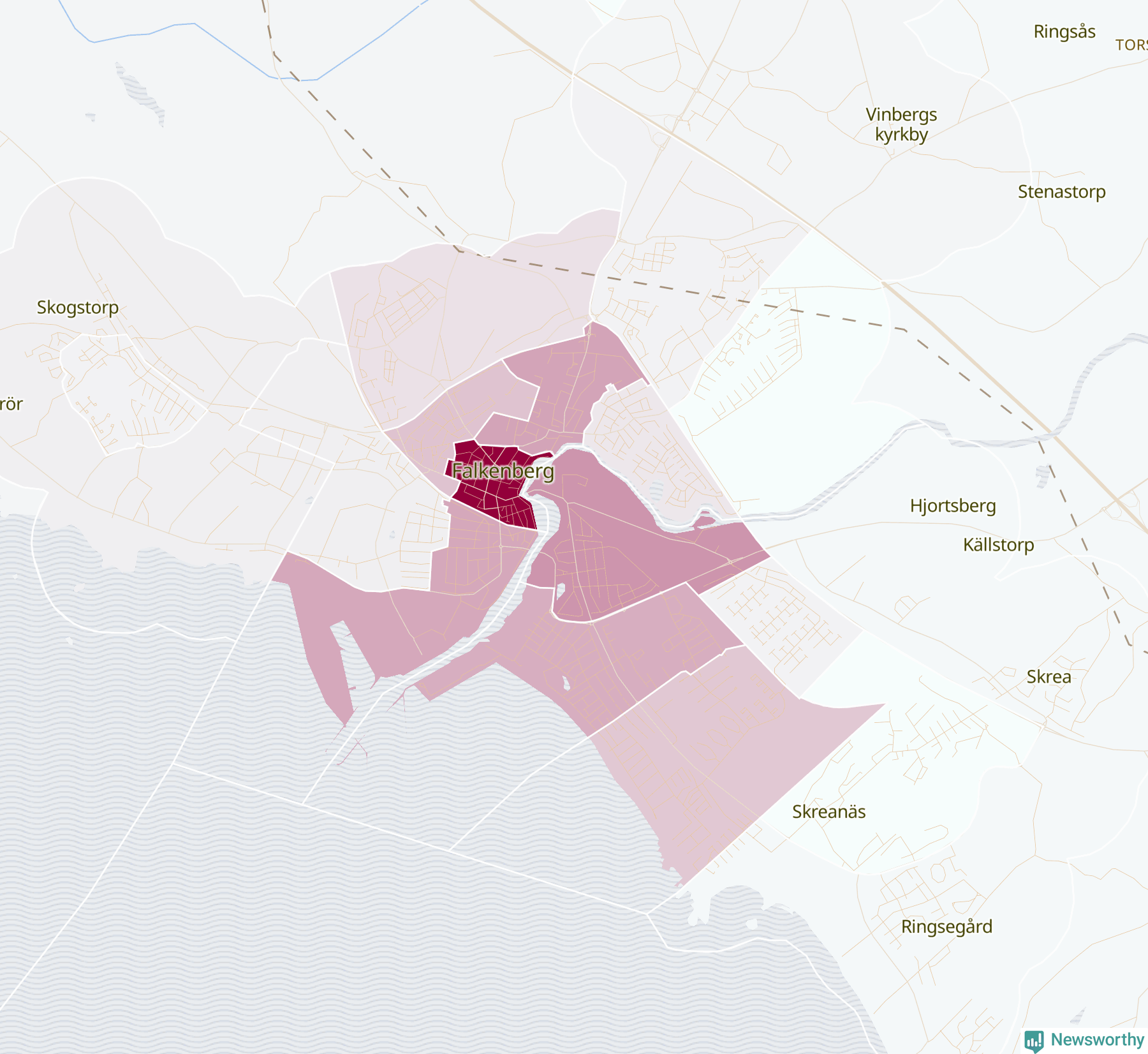 Men alla delar av Falkenberg är inte lika hårt drabbade. Det visar data för de senaste fem åren, som Newsworthy har begärt ut från polisen. De anmälda stölderna har kopplats till SCB:s 29 statistiska områden i kommunen. I ett område finns inga cykelstölder registrerade, men i de övriga rör det sig om mellan en handfull och omkring 300 anmälda stölder per område.