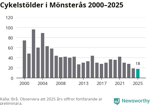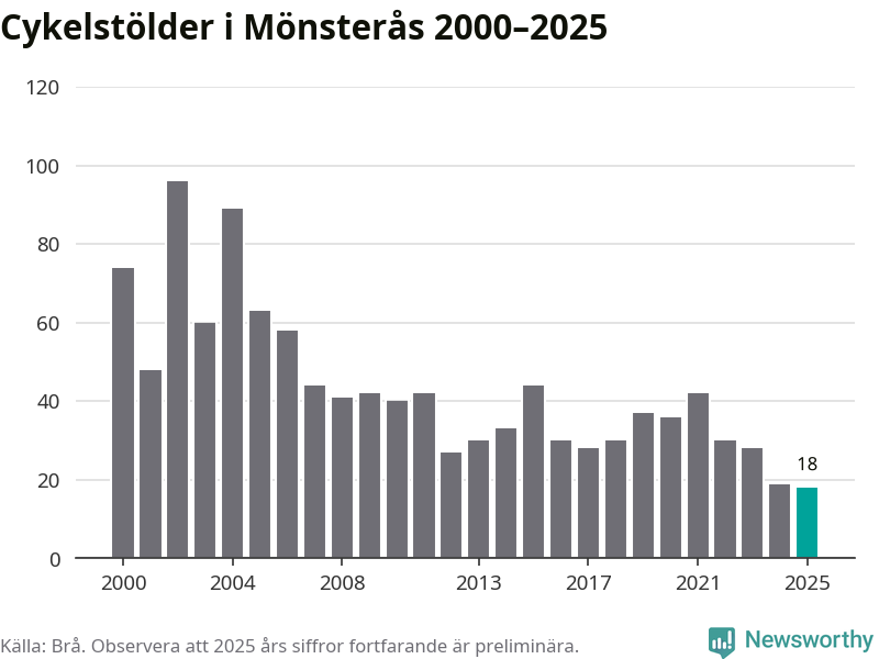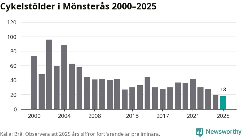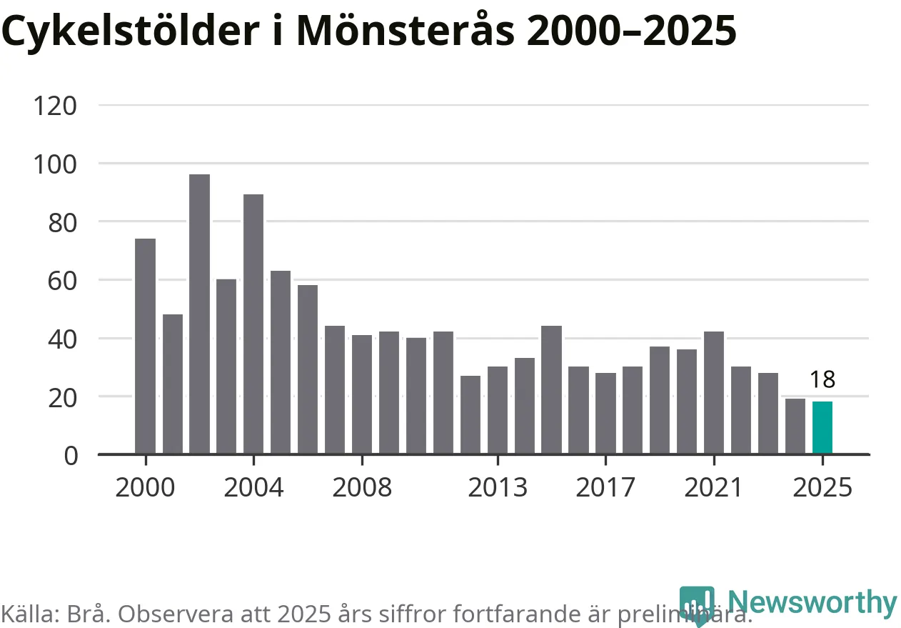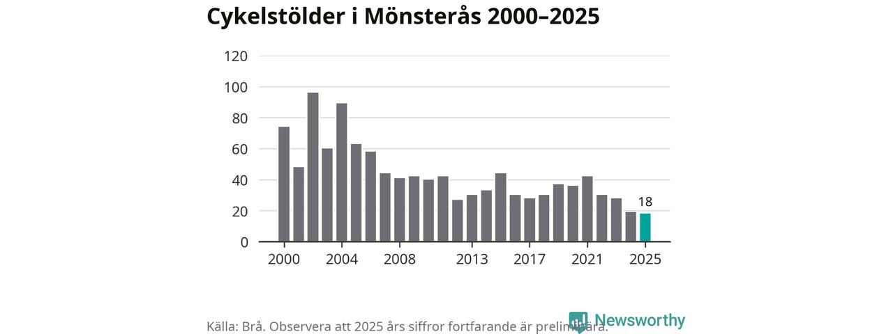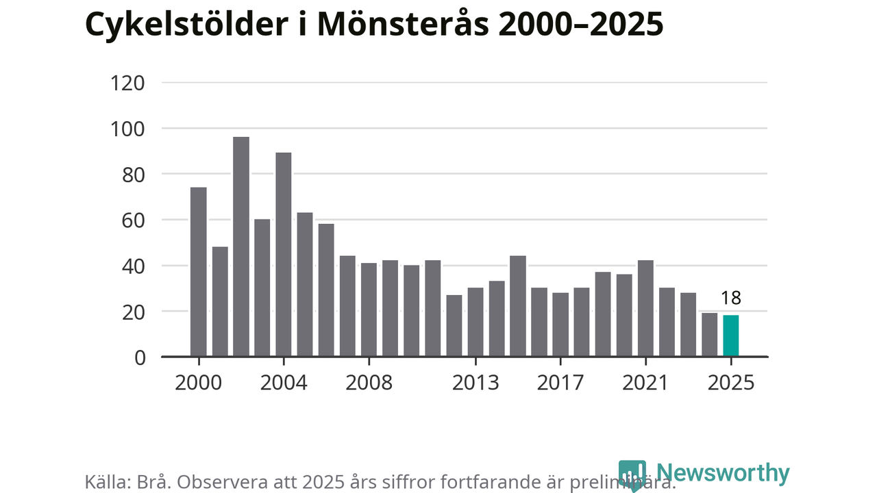 I Mönsterås kommun noterades det lägsta antalet cykelstölder under hela 2000-talet år 2025, även om det fortfarande är preliminära siffror. Under de senaste 25 åren har det som mest anmälts 96 cykelstölder på ett år (2002).