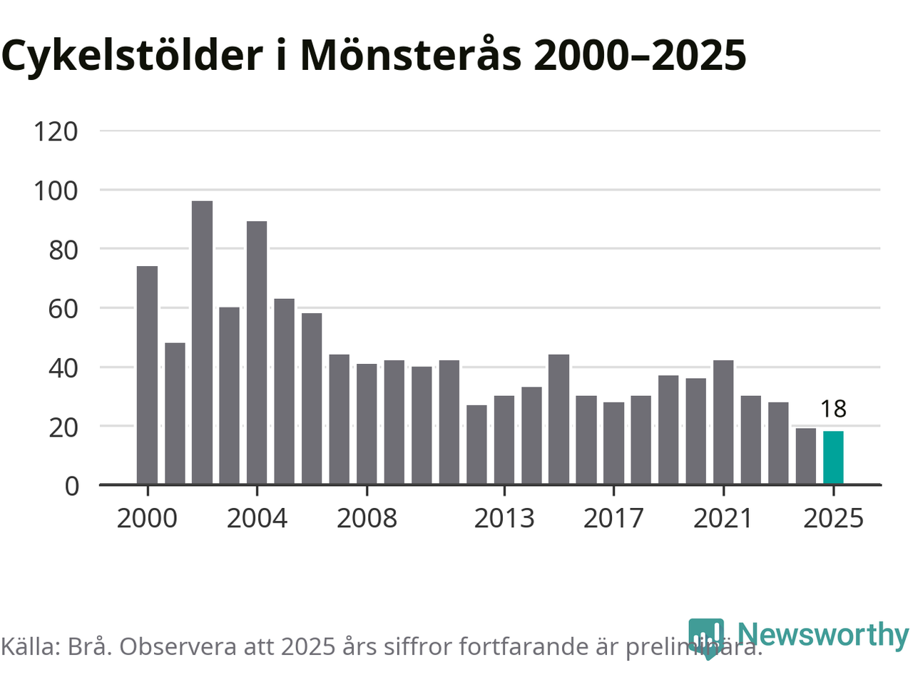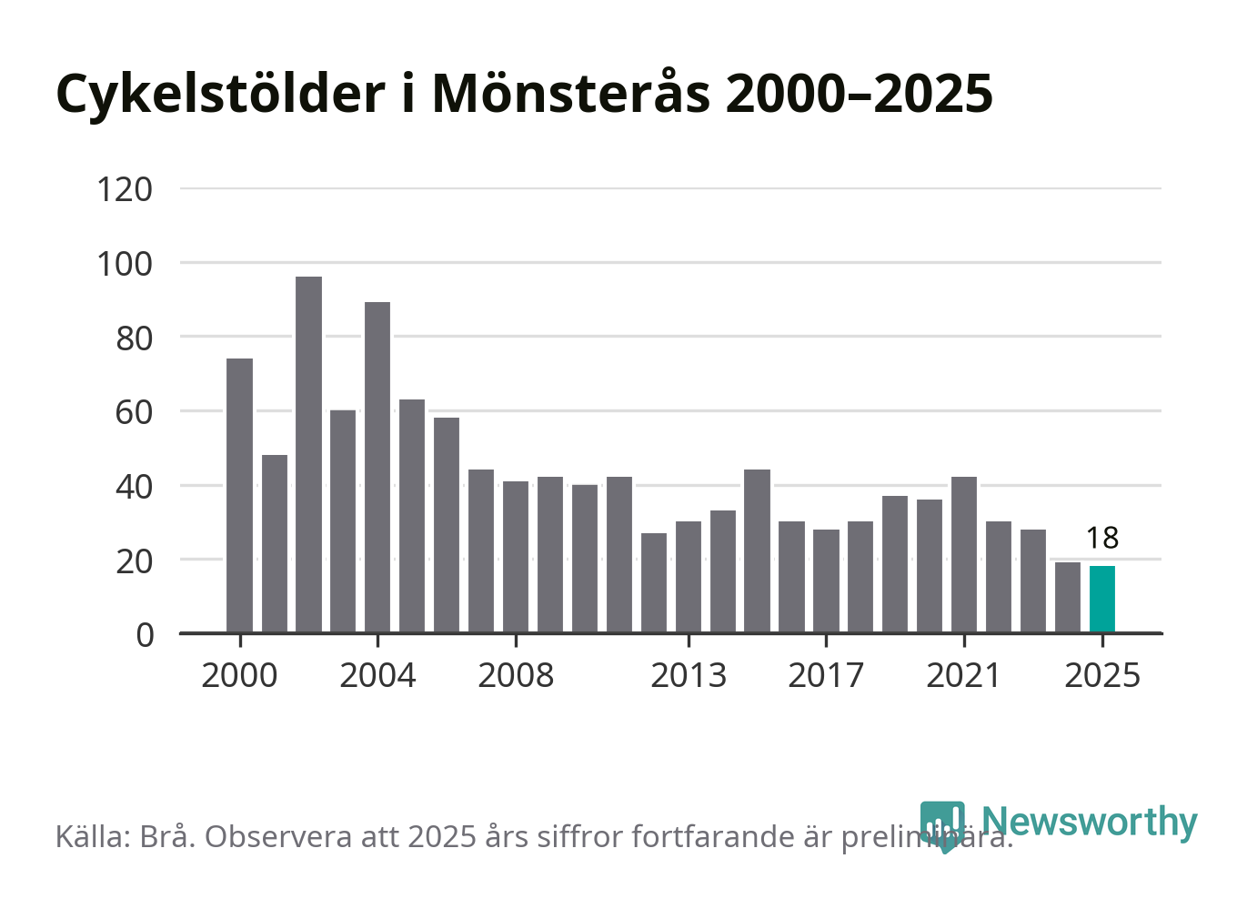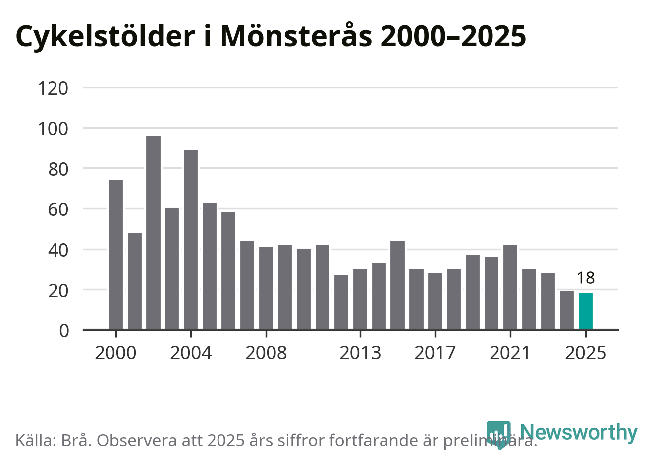 I Mönsterås kommun noterades det lägsta antalet cykelstölder under hela 2000-talet år 2025, även om det fortfarande är preliminära siffror. Under de senaste 25 åren har det som mest anmälts 96 cykelstölder på ett år (2002).